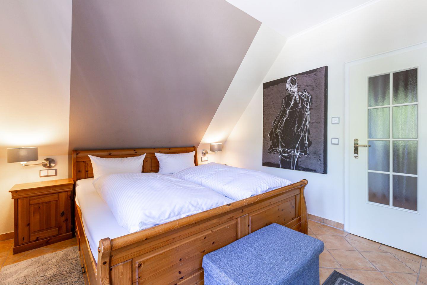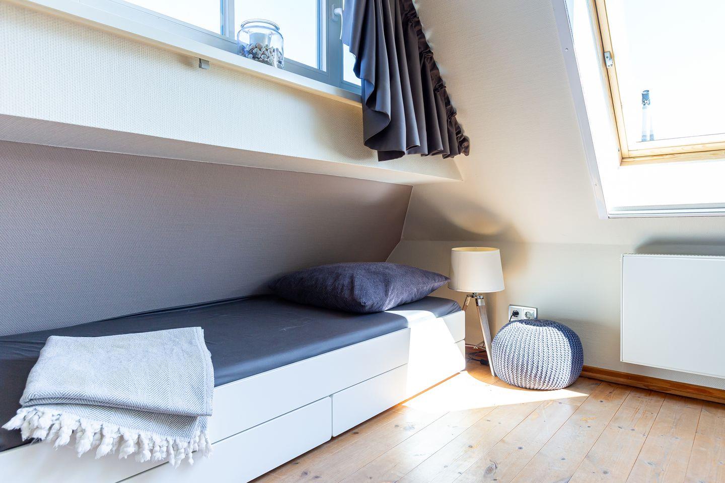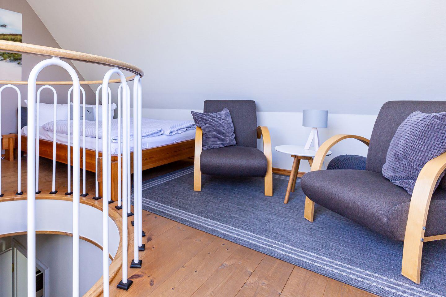 Ein zweites Schlafzimmer befindet sich im oberen Stockwerk, das über eine Wendeltreppe zu erreichen ist. Hier oben genießt man eine behagliche Atmosphäre unter dem Dach – perfekt als Schlaf- oder Rückzugsbereich.