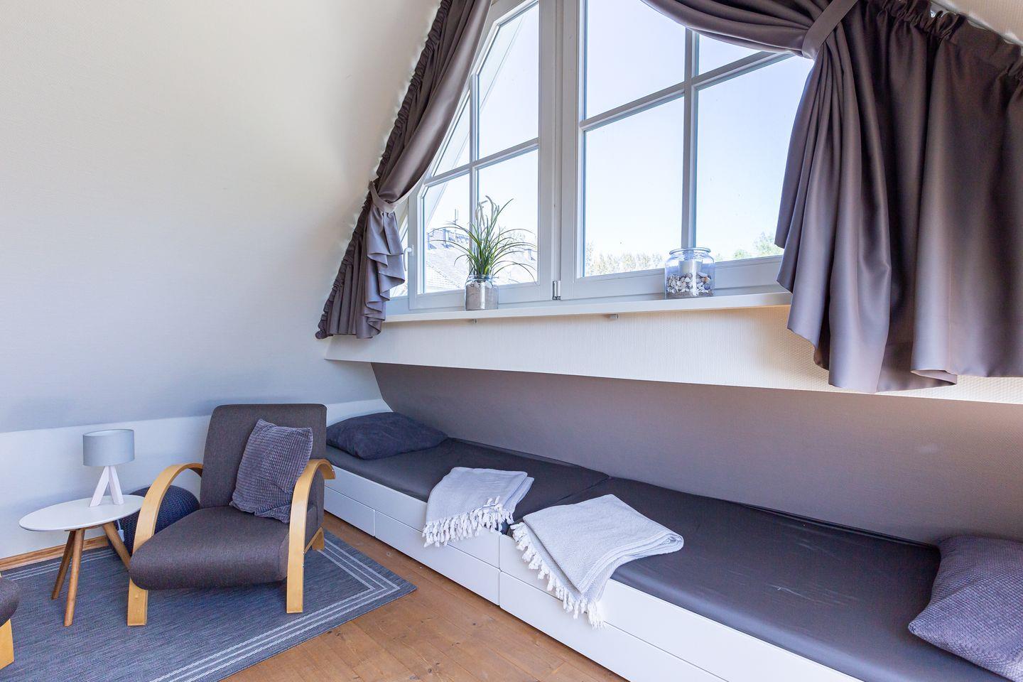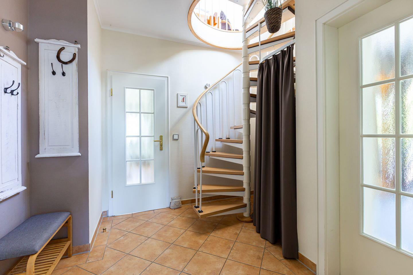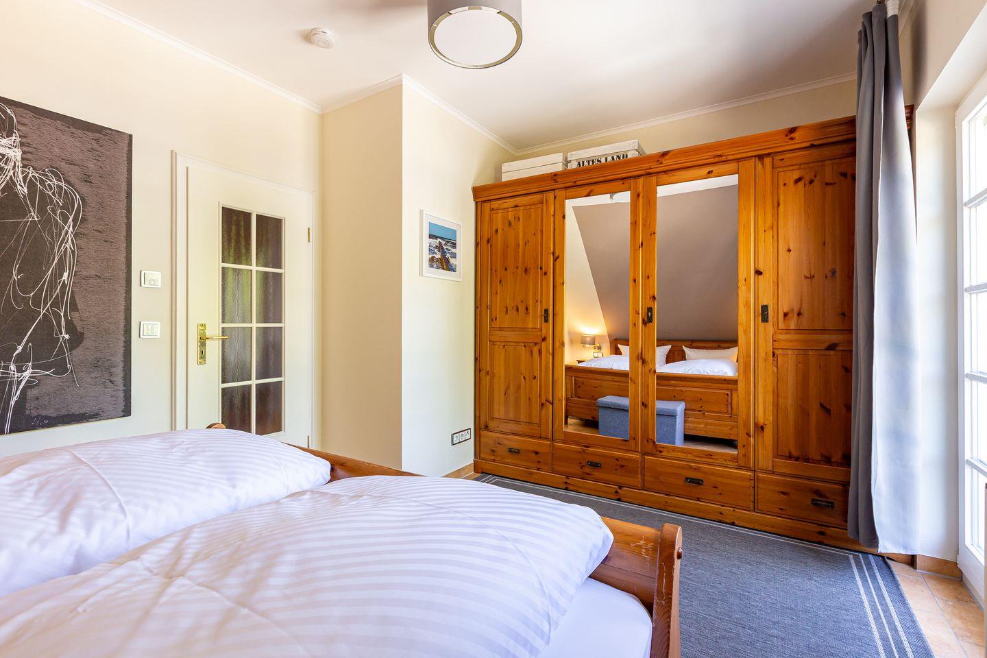 Ein zweites Schlafzimmer befindet sich im oberen Stockwerk, das über eine Wendeltreppe zu erreichen ist. Hier oben genießt man eine behagliche Atmosphäre unter dem Dach – perfekt als Schlaf- oder Rückzugsbereich.
