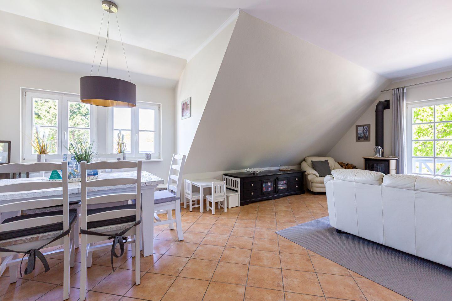 Die charmante Maisonette-Wohnung im ersten Obergeschoss des gepflegten Mehrfamilienhauses besticht durch ihre heimelige Atmosphäre und idyllische Lage zwischen Bodden und Ostsee. Mit der liebevollen Ausstattung bietet sie den idealen Rückzugsort für alle, die das Gemütliche suchen. Der helle Wohn- und Küchenbereich ist Mittelpunkt der Wohnung – egal, ob man entspannte Abende auf dem Sofa genießen oder am Esstisch den Tag mit einem sonnigen Frühstück beginnen lassen möchte. Das angrenzende Badezimmer sowie ein Schlafzimmer auf derselben Ebene sorgen zudem für kurze Wege.