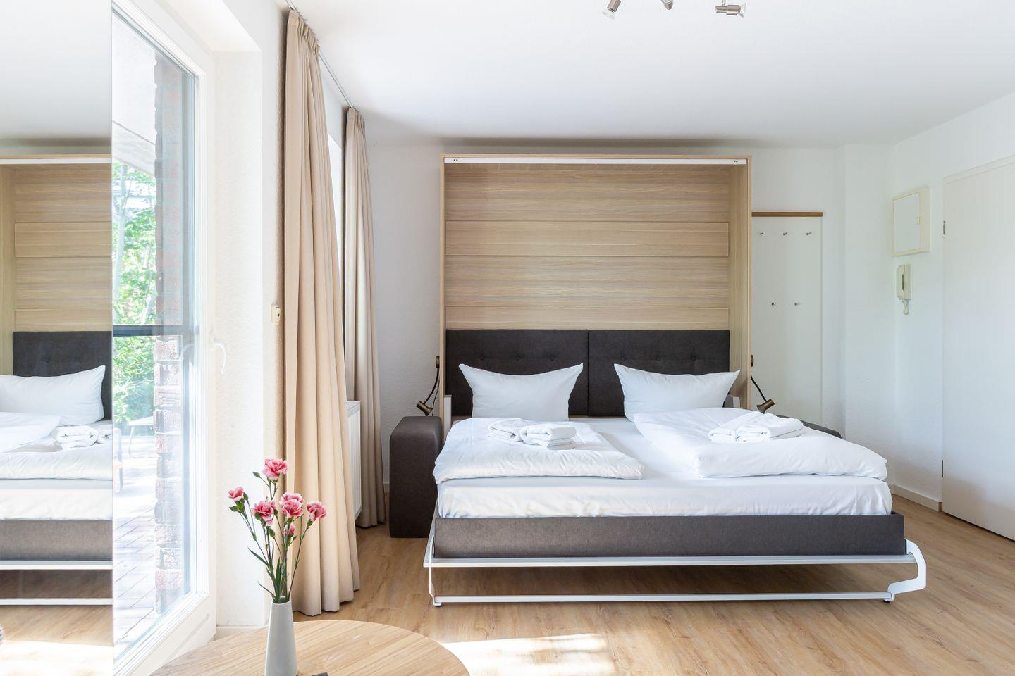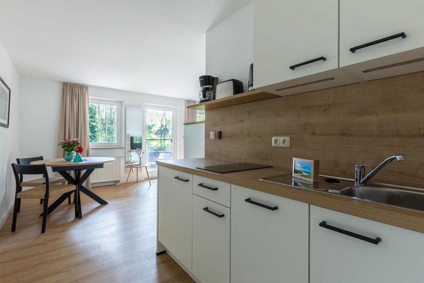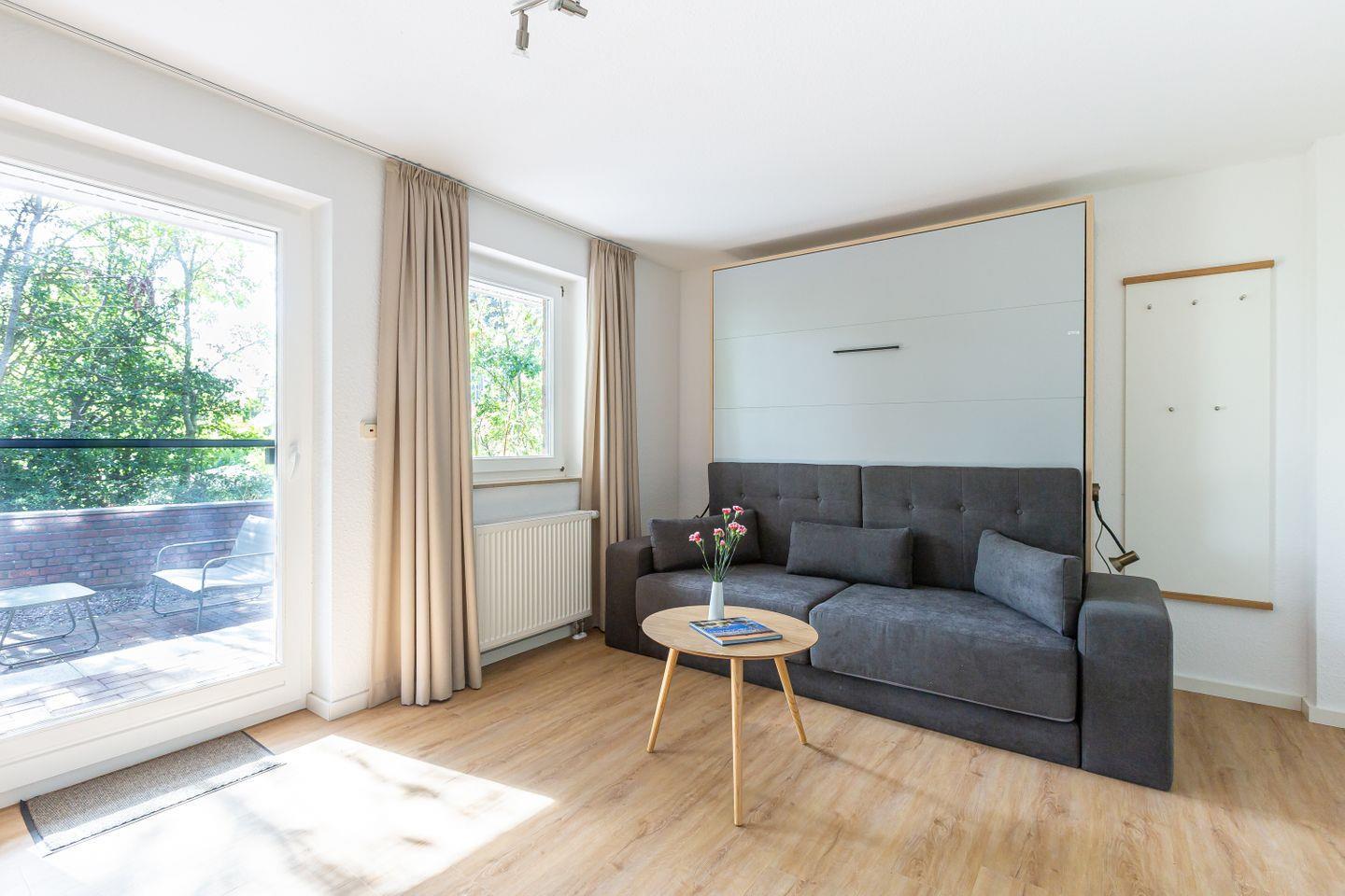 Auf 31 gut genutzten Quadratmetern bietet dieses charmante Einraum-Apartment alles, was du für eine entspannte Auszeit an der Ostsee brauchst. Mit seiner cleveren Raumaufteilung punktet die Wohnung vor allem bei Gästen, die es praktisch, hell und unkompliziert mögen. Das klappbare Bett verschwindet tagsüber ganz einfach in der Wand und macht Platz für ein kleines Sofa, auf dem man gemütlich lesen, einen Film schauen oder einfach die Ruhe genießen kann. Die Küchenzeile ist funktional und schick – perfekt für den schnellen Kaffee am Morgen oder das Abendessen nach einem Strandtag.