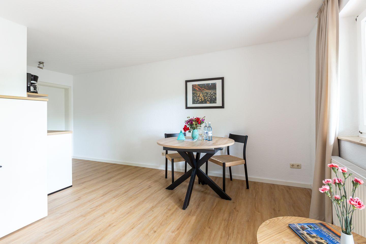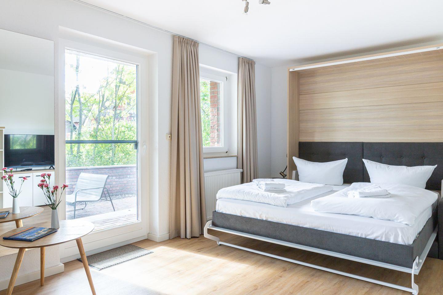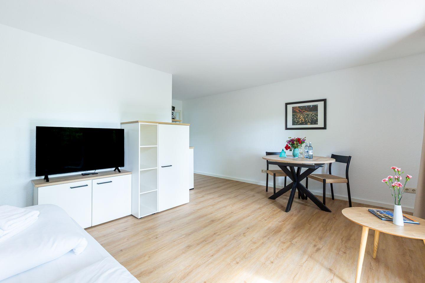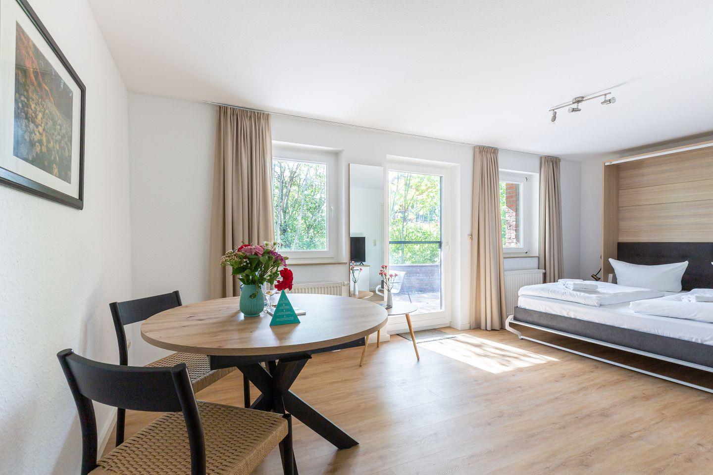 Auf 31 gut genutzten Quadratmetern bietet dieses charmante Einraum-Apartment alles, was du für eine entspannte Auszeit an der Ostsee brauchst. Mit seiner cleveren Raumaufteilung punktet die Wohnung vor allem bei Gästen, die es praktisch, hell und unkompliziert mögen. Das klappbare Bett verschwindet tagsüber ganz einfach in der Wand und macht Platz für ein kleines Sofa, auf dem man gemütlich lesen, einen Film schauen oder einfach die Ruhe genießen kann. Die Küchenzeile ist funktional und schick – perfekt für den schnellen Kaffee am Morgen oder das Abendessen nach einem Strandtag.