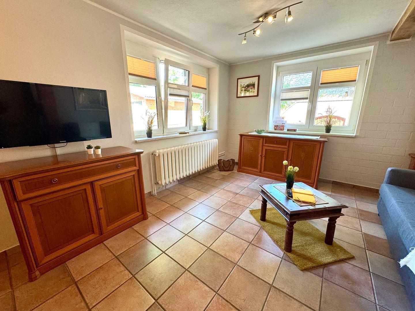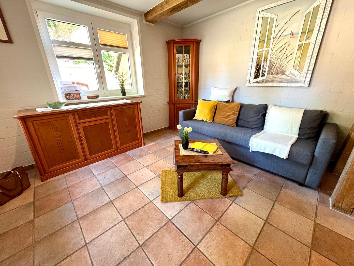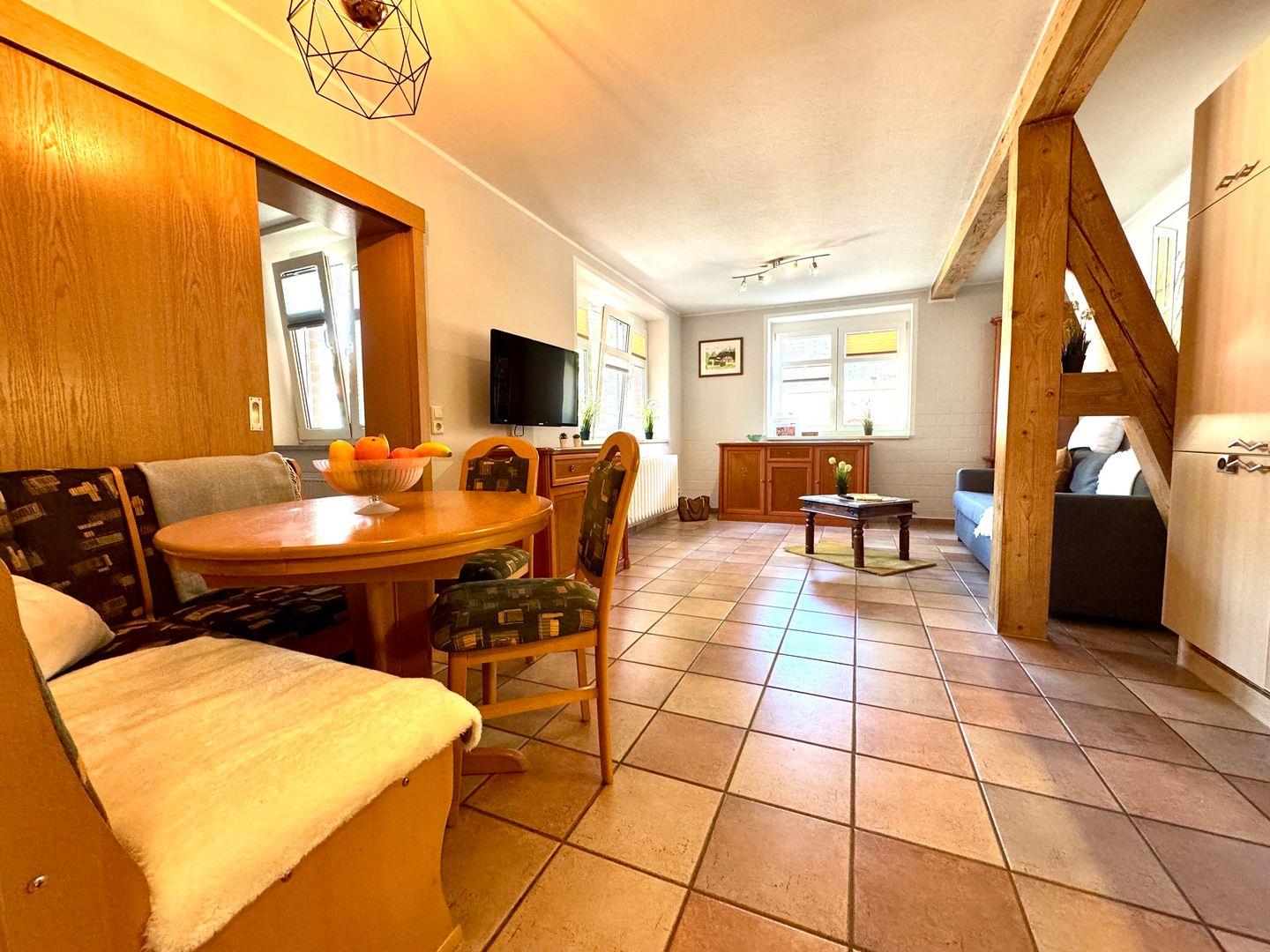 Die liebevoll eingerichtete Erdgeschoss-Ferienwohnung bietet Platz für Paare, kleine Familien oder Freunde. Sie verfügt über ein separates Schlafzimmer, ein Wohnzimmer mit Schlafcouch sowie eine offene Küche. Das Badezimmer mit Badewanne lädt nach einem erlebnisreichen Tag zum Entspannen ein.