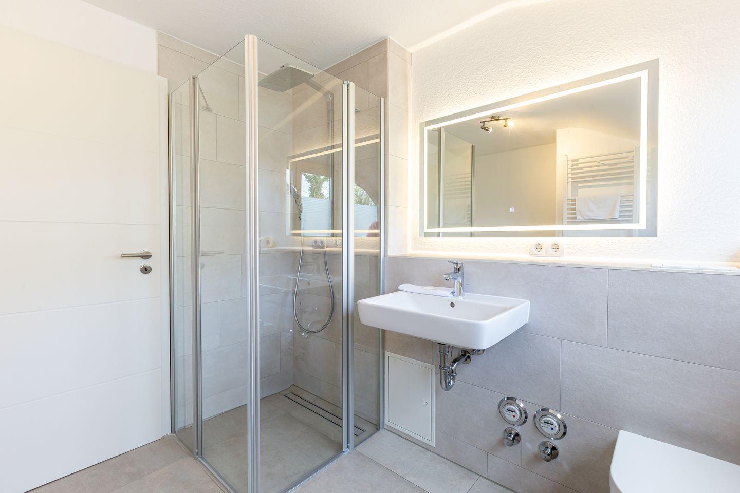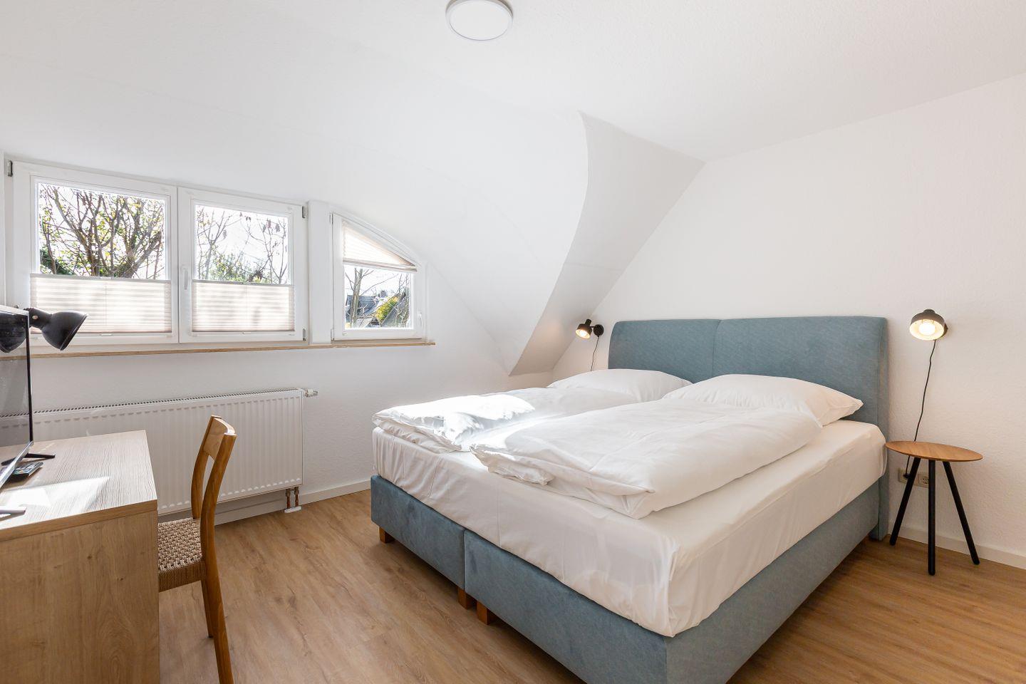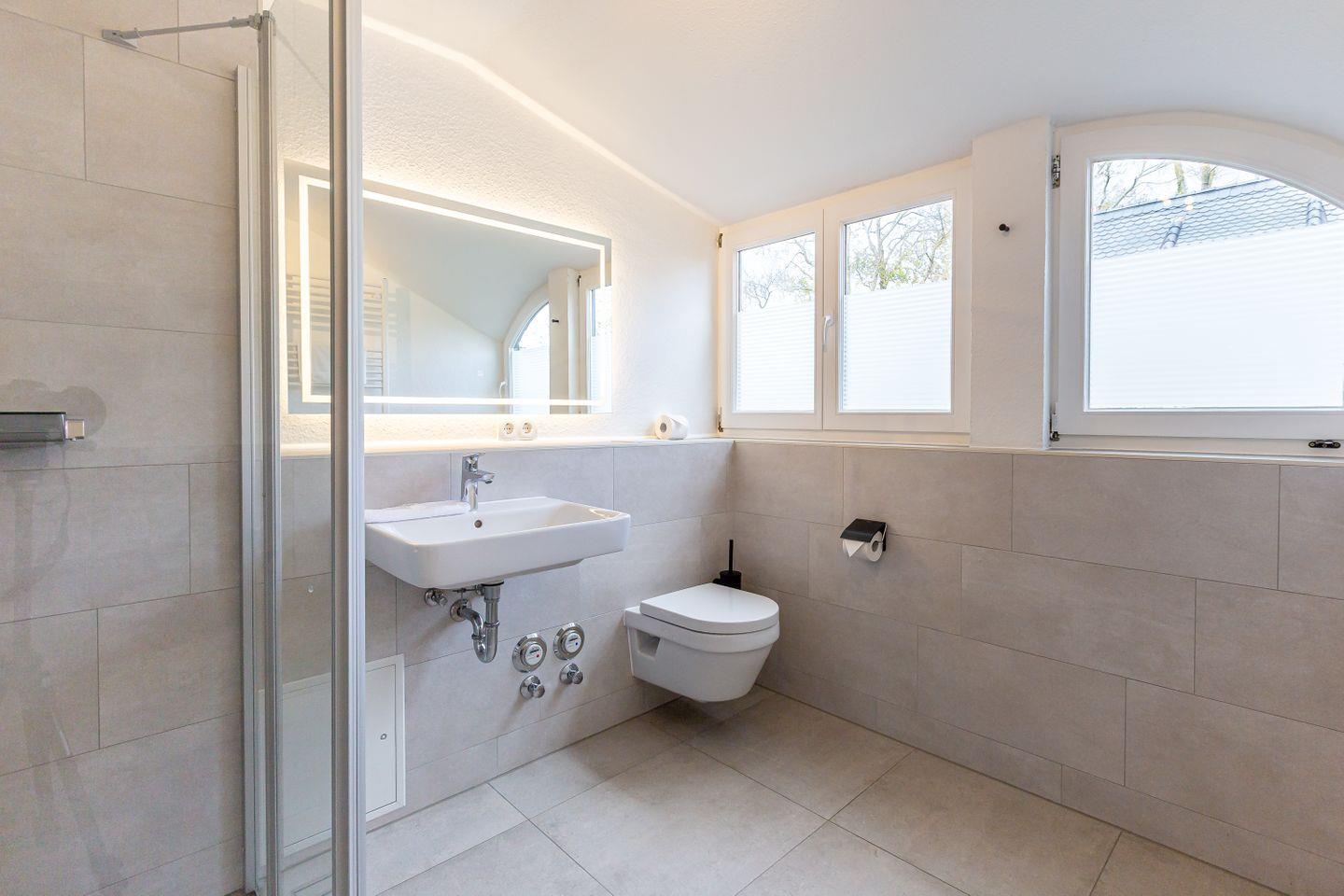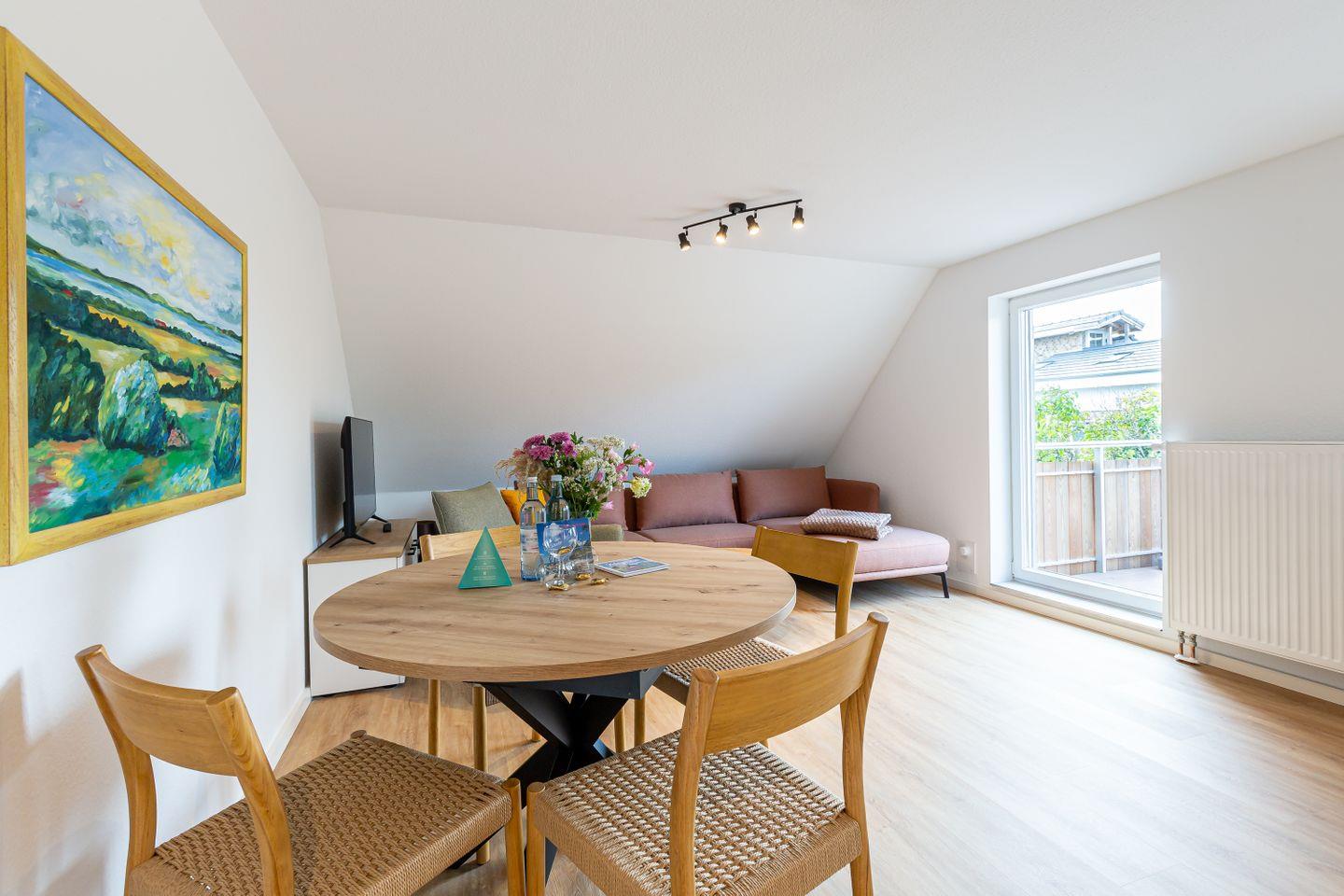 Willkommen in deiner neuen Ferienwohnung, mitten im idyllischen Ahrenshoop. Diese helle und komfortable 3-Zimmer-Wohnung im ersten Stock bietet dir alles, was du für eine entspannte Auszeit an der Ostsee brauchst. Der offene Wohn- und Küchenbereich ist modern und hochwertig möbliert – hier kannst du gemeinsam mit deinen Liebsten kochen, essen und gemütliche Stunden verbringen. Zwei einladende Schlafzimmer sorgen für erholsamen Schlaf nach einem Tag voller Erlebnisse an der frischen Luft. Das Badezimmer ist funktional gestaltet und rundet das Wohlfühlangebot ab.