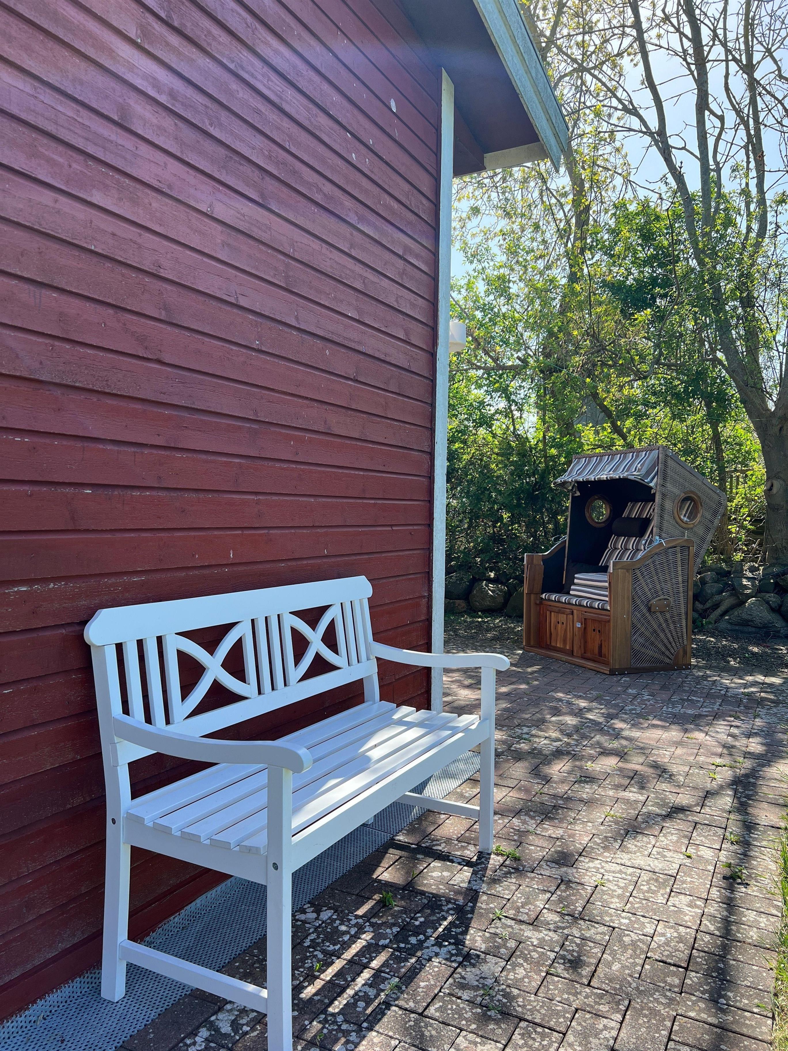 Die gemütliche Südterrasse ist mit einem Strandkorb, einem Gartentisch mit 4 Stühlen, einer Gartenbank, zwei Sonnenliegen und einem Holzkohlegrill ausgestattet.