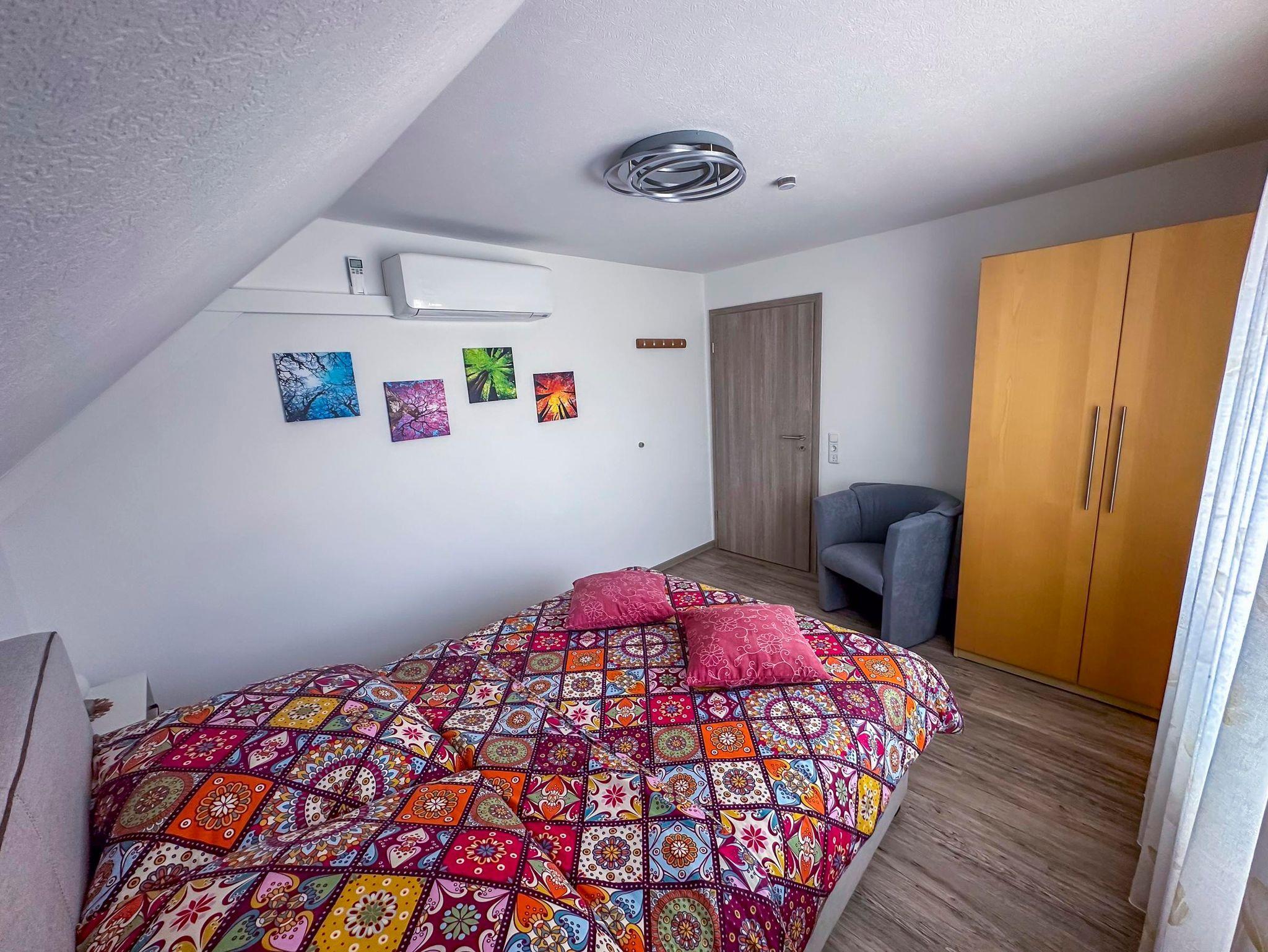 Im Obergeschoß finden Sie 2 Schlafzimmer, eines ausgestattet mit einem Doppelbett 2x2 Meter und eines mit einem Boxspringbett 1,40 x 2 Meter. In jedem Schlafzimmer befindet sich ein geräumiger Kleiderschrank. Beide Zimmer sind mit Fliegengittern und Klimaanlagen ausgestattet, so dass man sich auf eine ruhige und angenehme Nacht freuen kann.