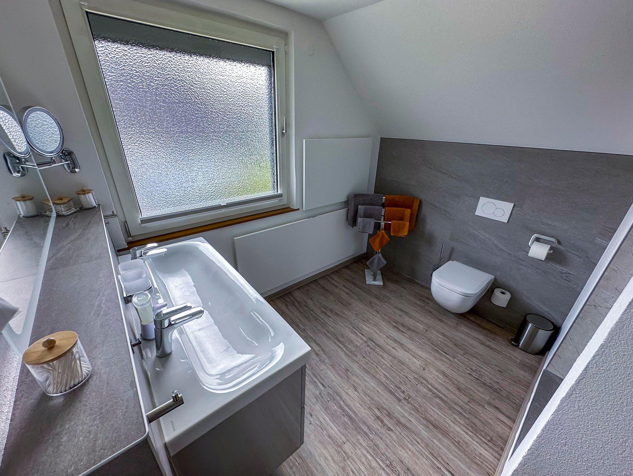 Ein gut ausgestattetes Badezimmer mit Doppelwaschtisch, Toilette und Dusche und ein Wirtschaftsraum mit Waschmaschine und Trockner befinden sich ebenfalls im Obergeschoss.