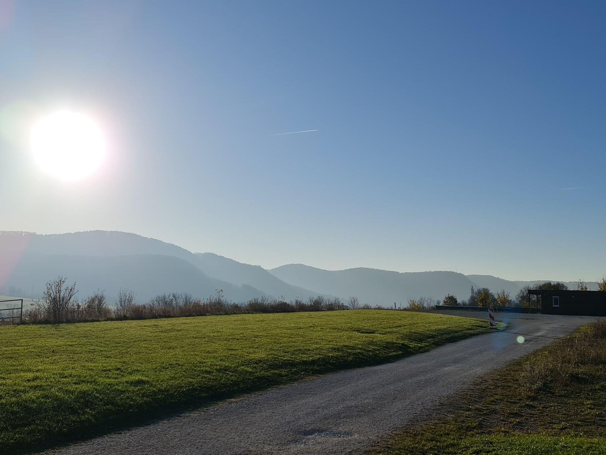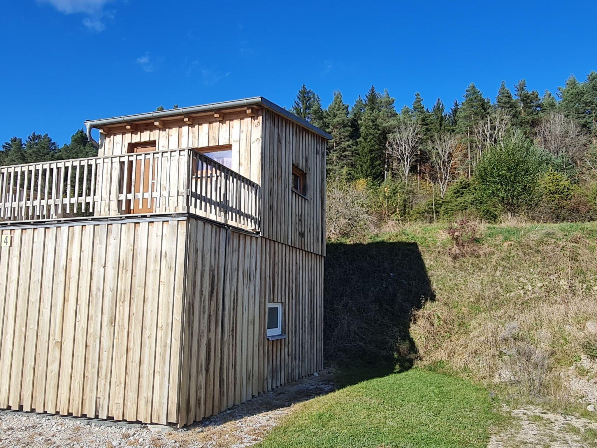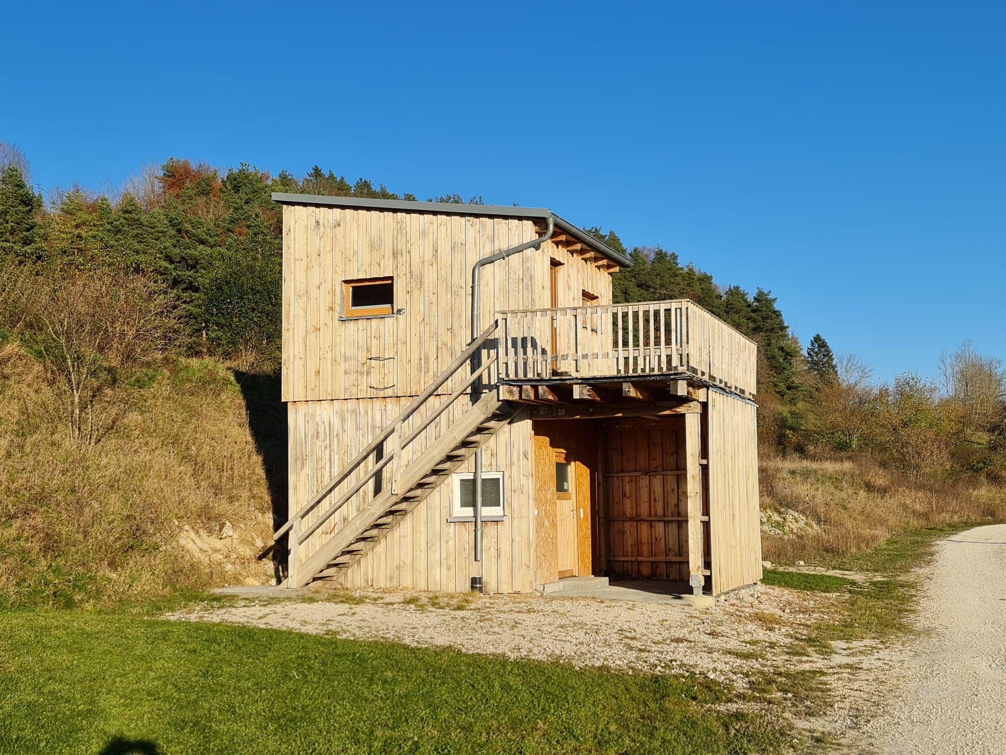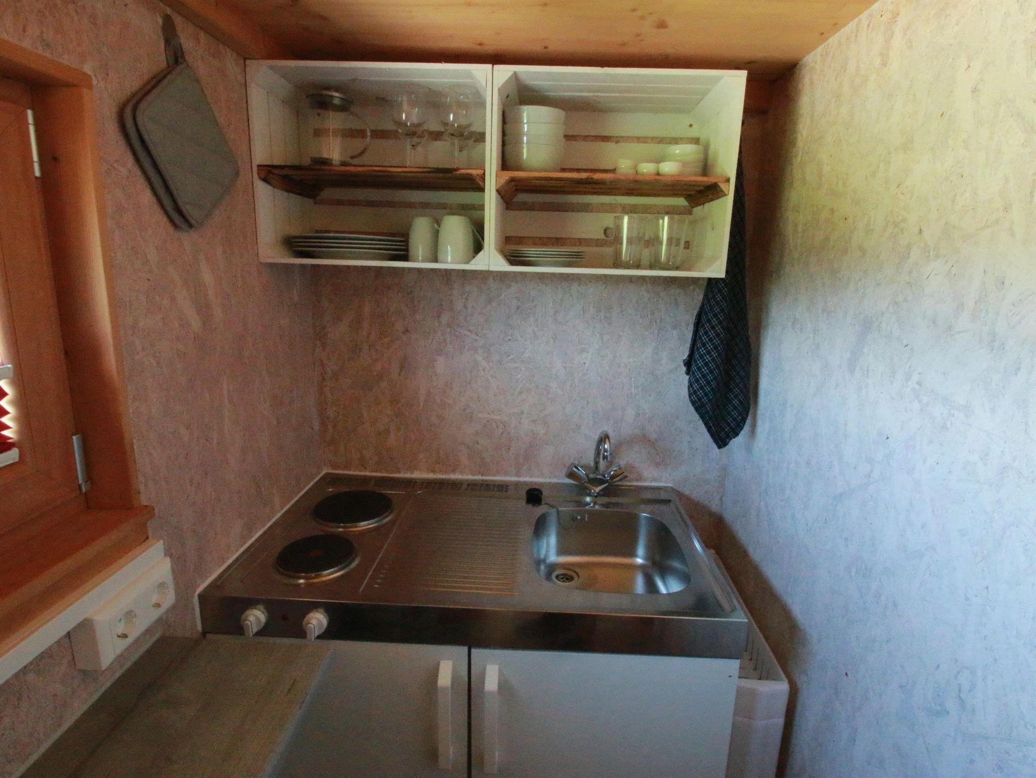 Das Küchenmodul ist mit Kühlschrank, 2-Plattenherd und Spüle ausgestattet. Stauraum ist ausreichend vorhanden. Über die Außentreppe erreichen Sie das im Erdgeschoss befindliche Bad (nicht beheizbar) mit Waschbecken und WC . Von der großzügigen Terrasse der Stelzenhäuser haben Sie einen wunderbaren Rundumblick auf die Hügel der Schwäbischen Alb.
