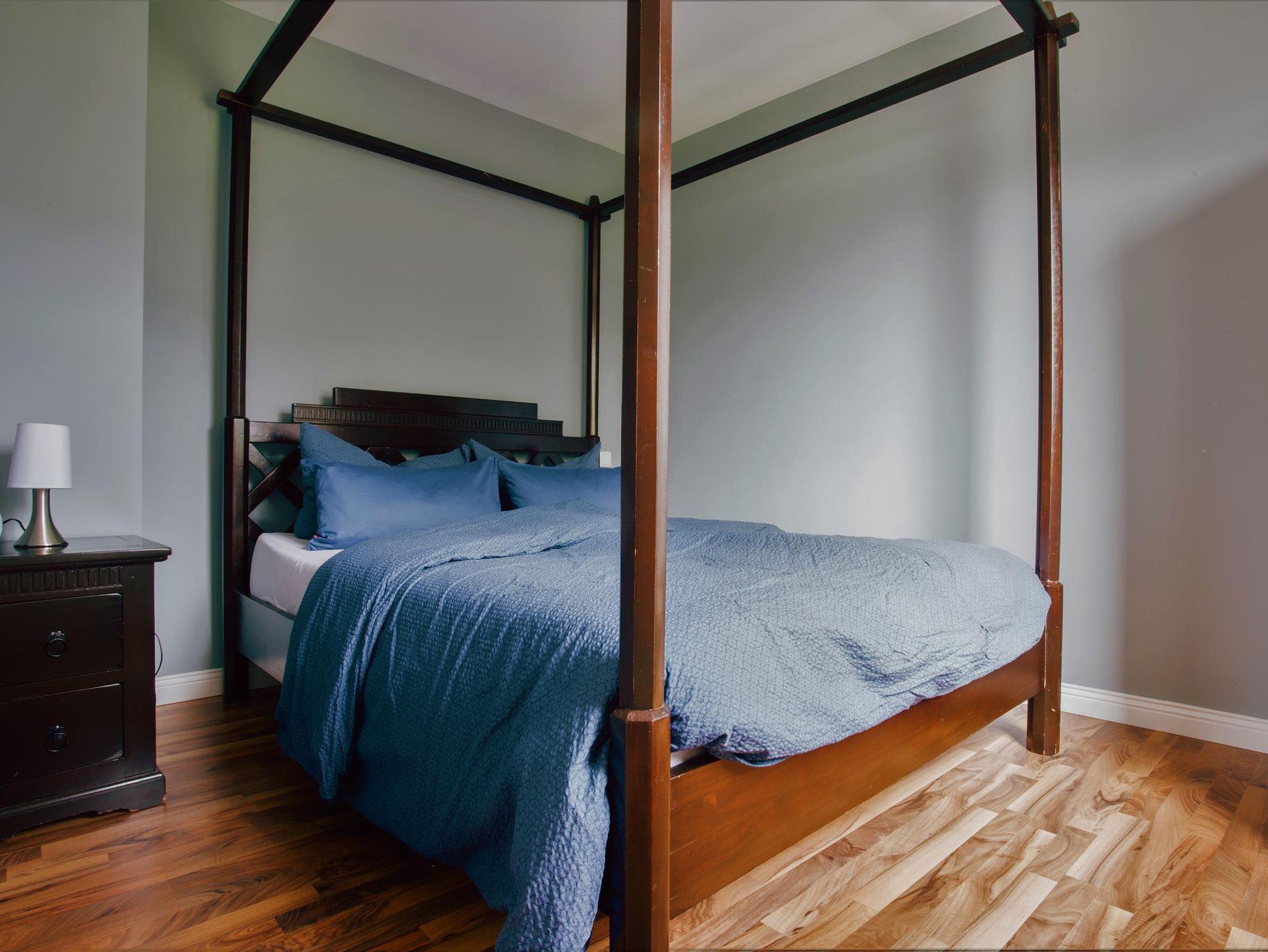 Das Badezimmer verfügt über eine Toilette, eine Badewanne sowie eine Waschmaschine. Im Schlafzimmer befindet sich ein wunderschönes Himmelbett und ein Kleiderschrank.