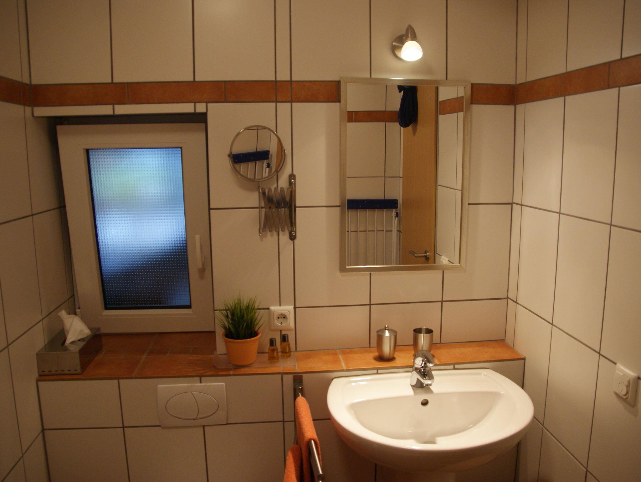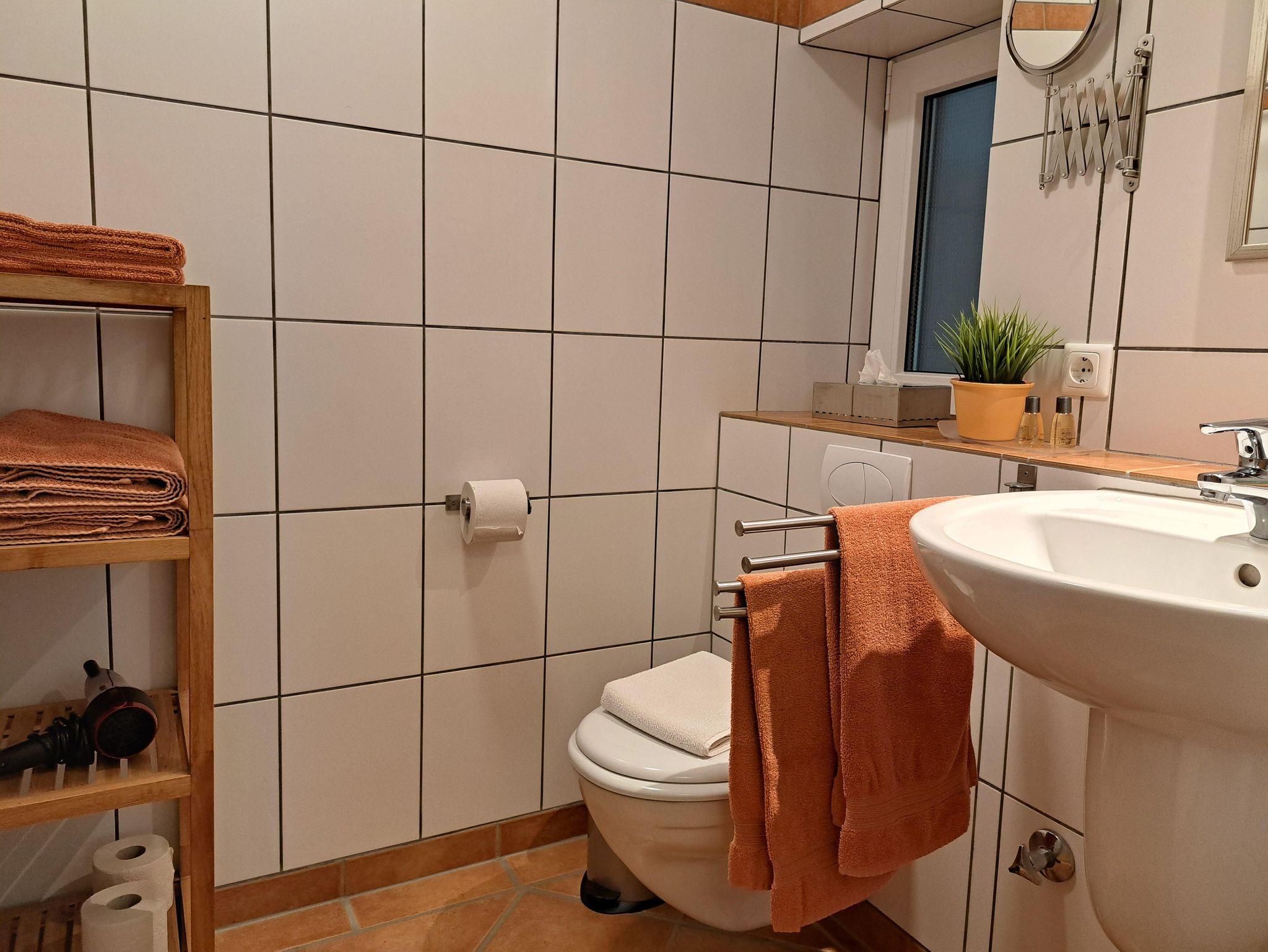 Im Bad, welches direkt vom Schlafzimmer aus zu erreichen ist finden Sie Hygieneartikel, Fön, Kosmetikspiegel, Wäscheständer, Papiertücher und Toilettenpapier. Die Dusche ist bodengleich. Hand- und Duschtücher sind natürlich inklusive (Handtücher-Wechsel bei längerem Aufenthalt inklusive).