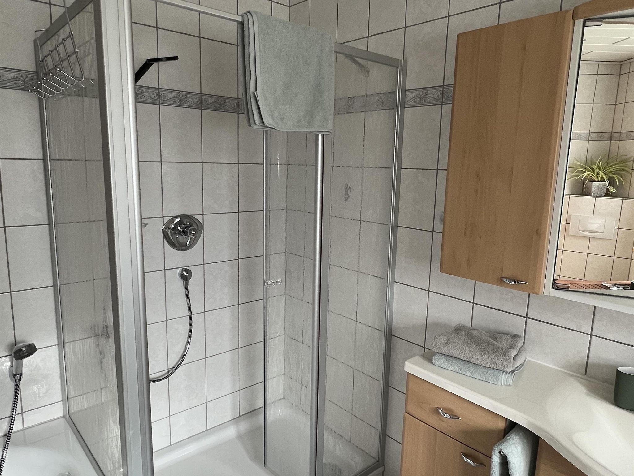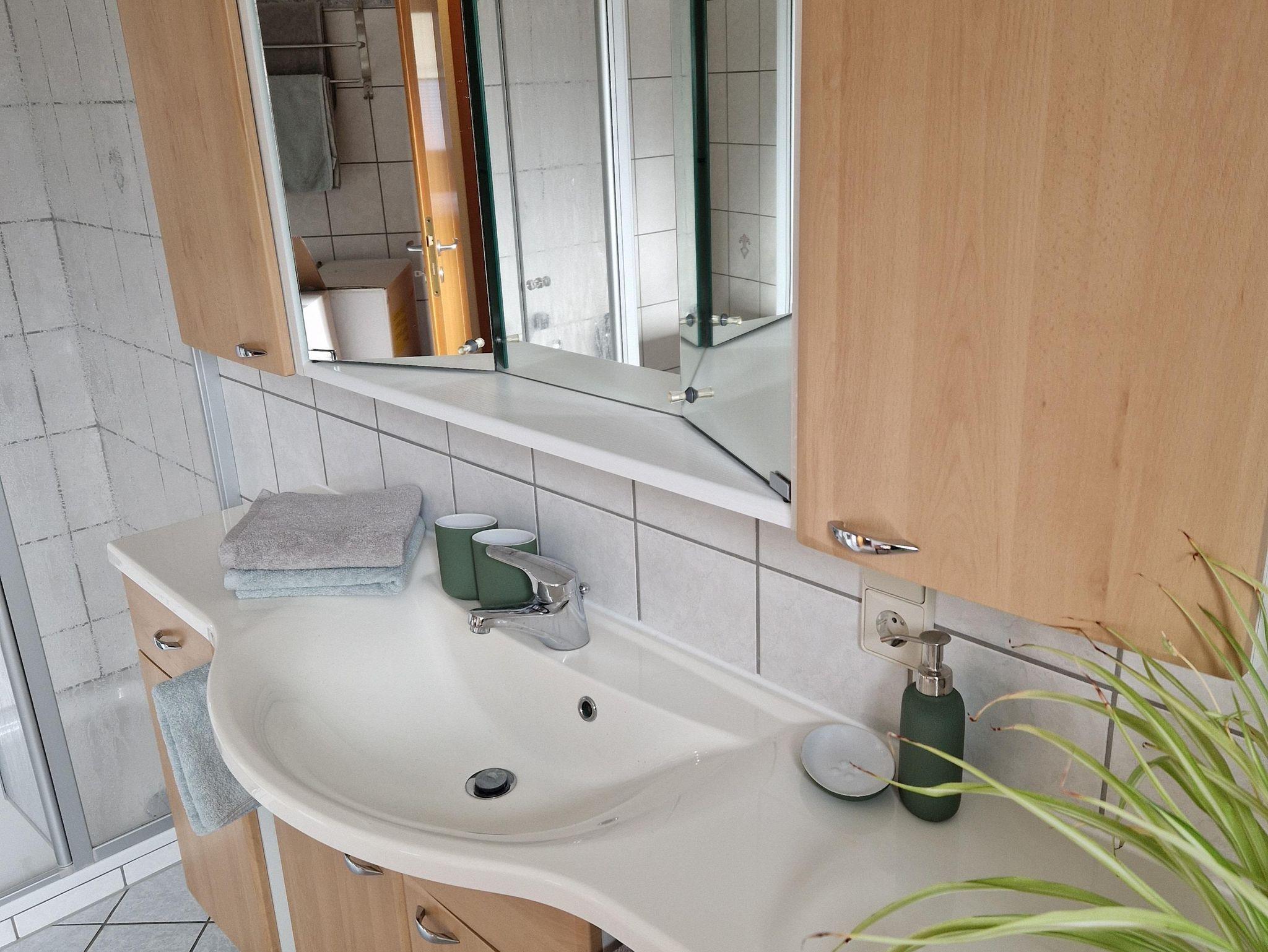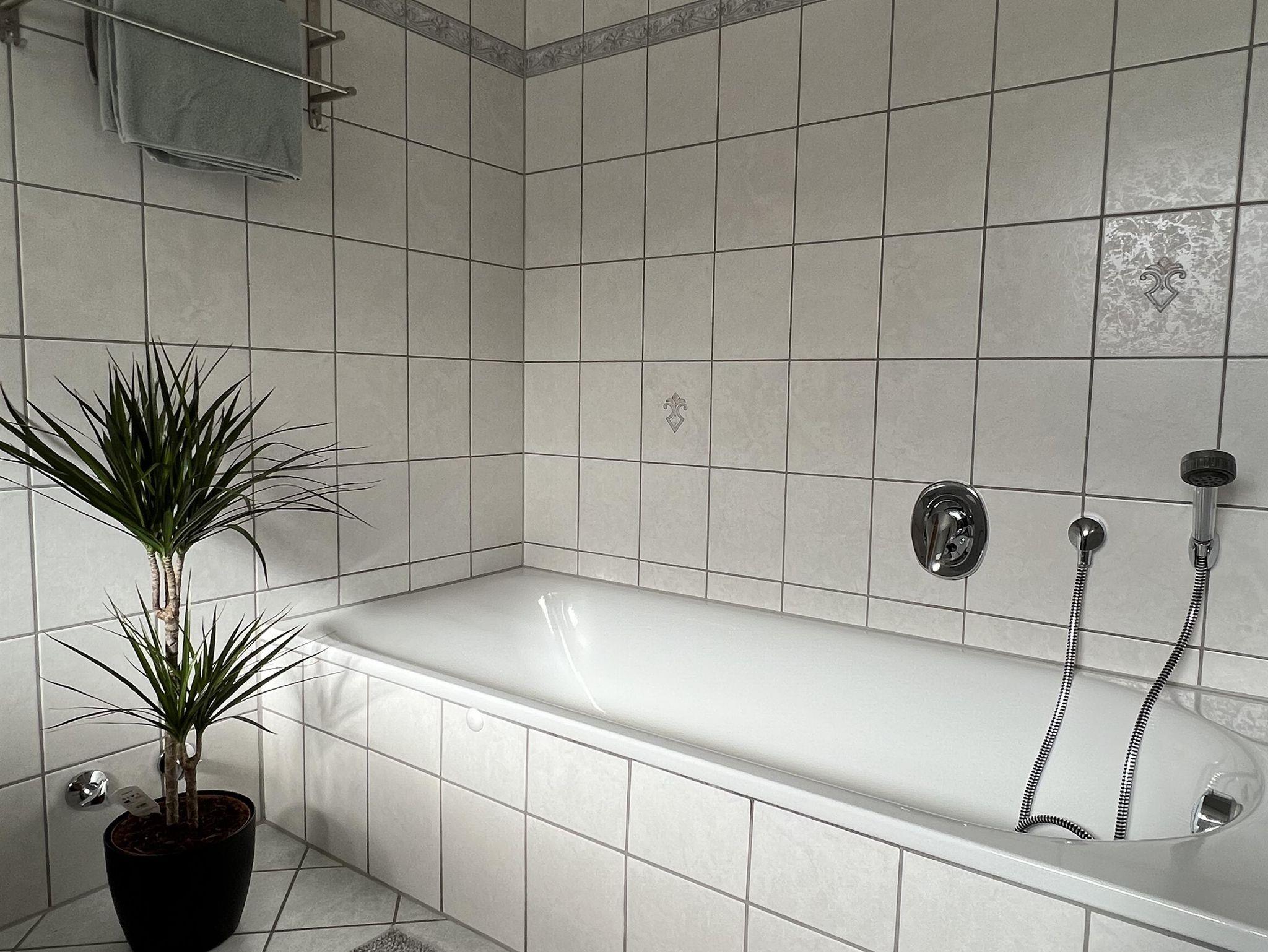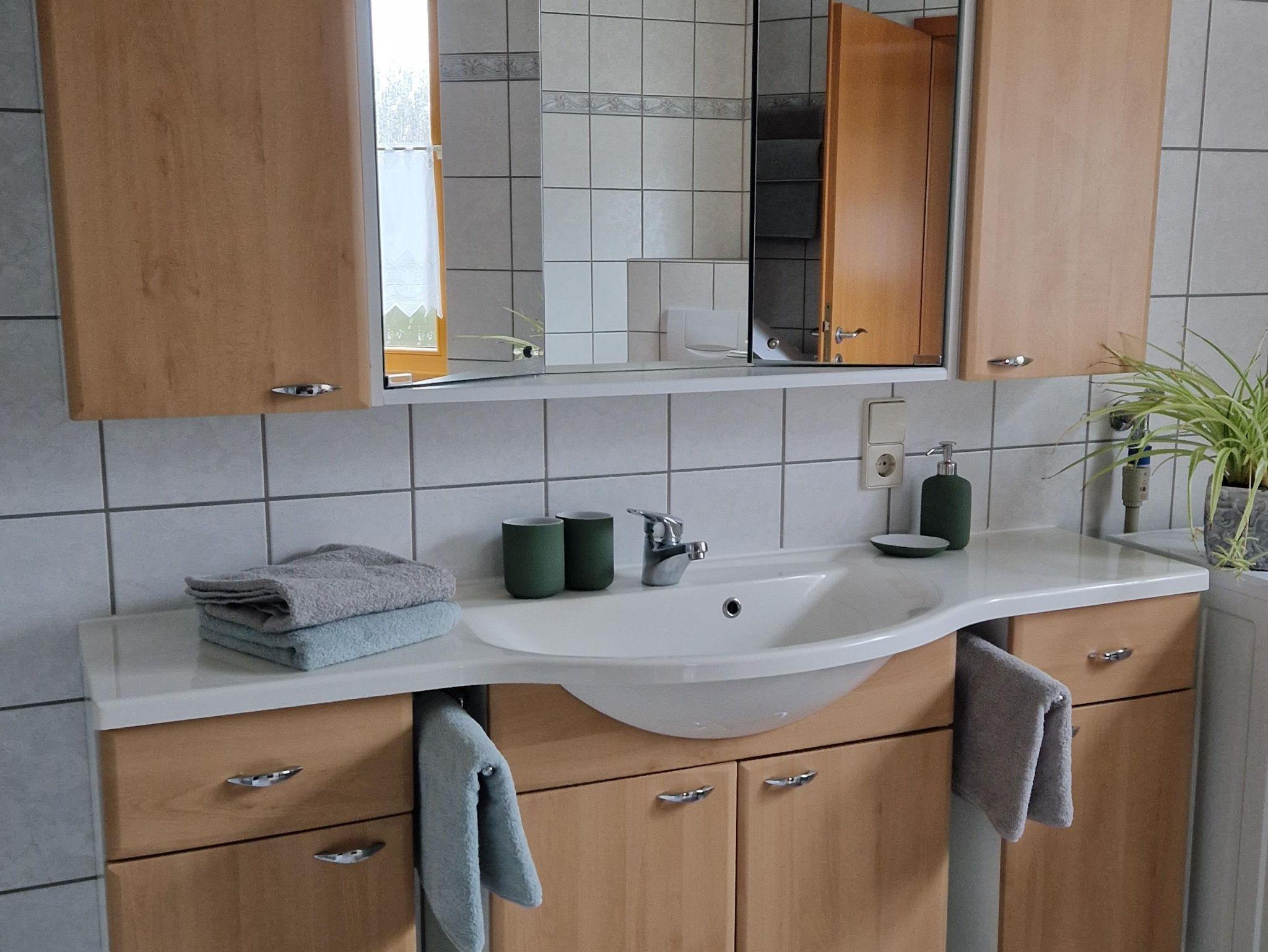 Das Badezimmer enthält einen großen Waschtisch. Neben einer Dusche gibt es auch eine Badewanne und ein WC. Zusätzlich kann hier gegen ein kleines Entgelt die Waschmaschine mitgenutzt werden. Außerdem steht Ihnen ein Haartrockner zur Verfügung.