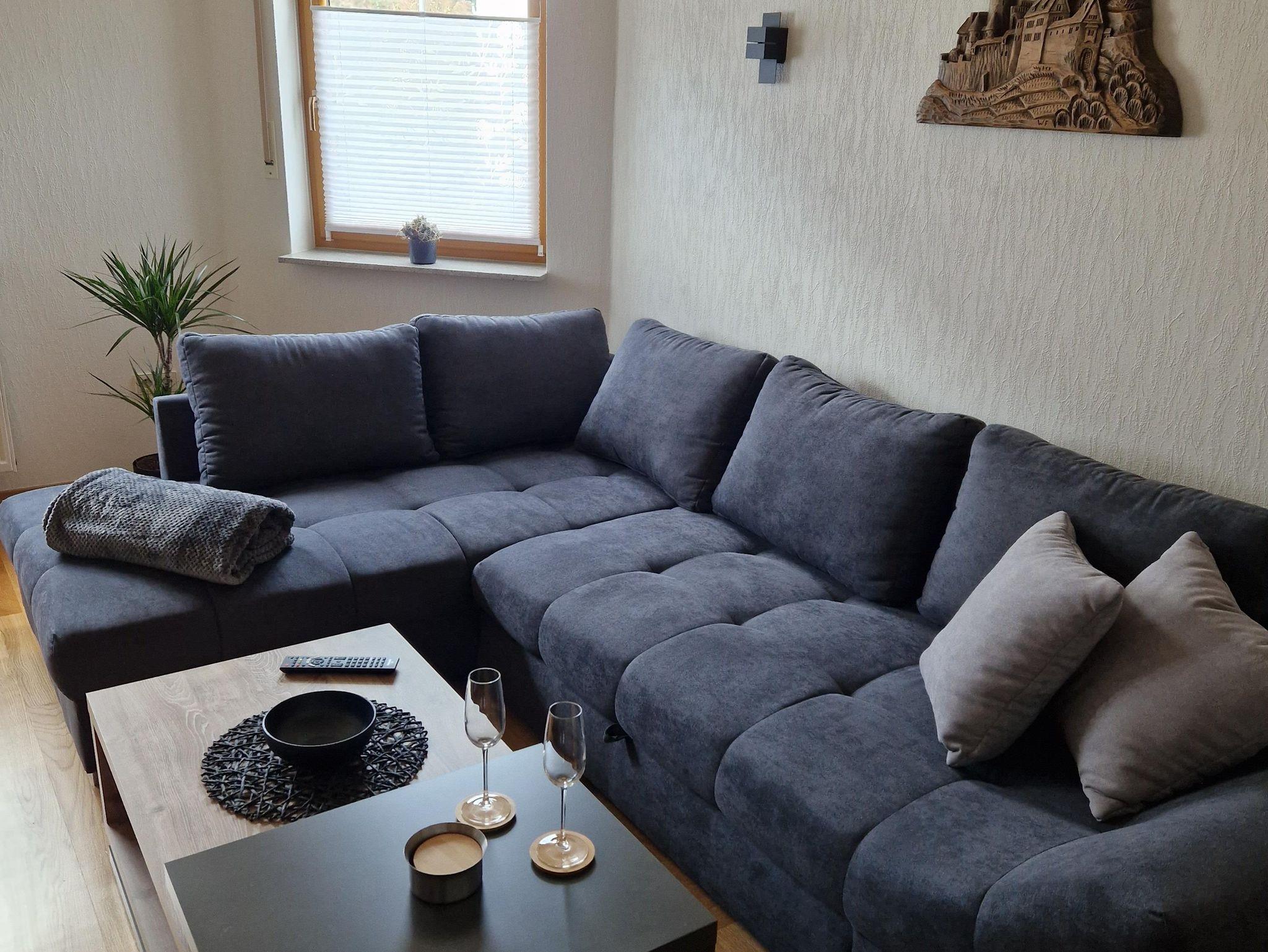 Das Wohnzimmer verfügt über eine großzügige Wohnlandschaft, die auch als Schlafplatz genutzt werden kann. Außerdem steht Ihnen hier ein großer Smart TV Flachbildschirm zur Verfügung.