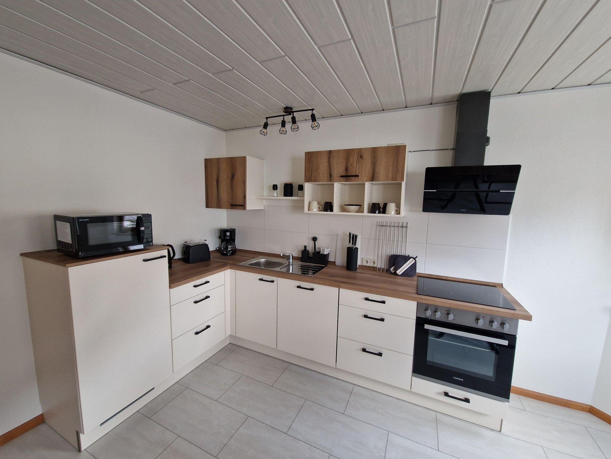 Unsere Küche ist komplett ausgestattet mit einem Backofen, einem Ceranfeld, einer Spülmaschine und einem Kühlschrank mit Gefrierfach. Dazu bieten wir auch eine Kaffeemaschine, einen Toaster, einen Wasserkocher, eine Mikrowelle und ein Radio. Außerdem befindet sich hier ein großer Esstisch mit vier Stühlen.