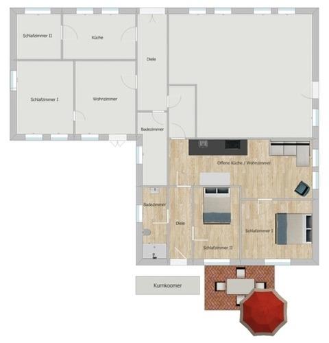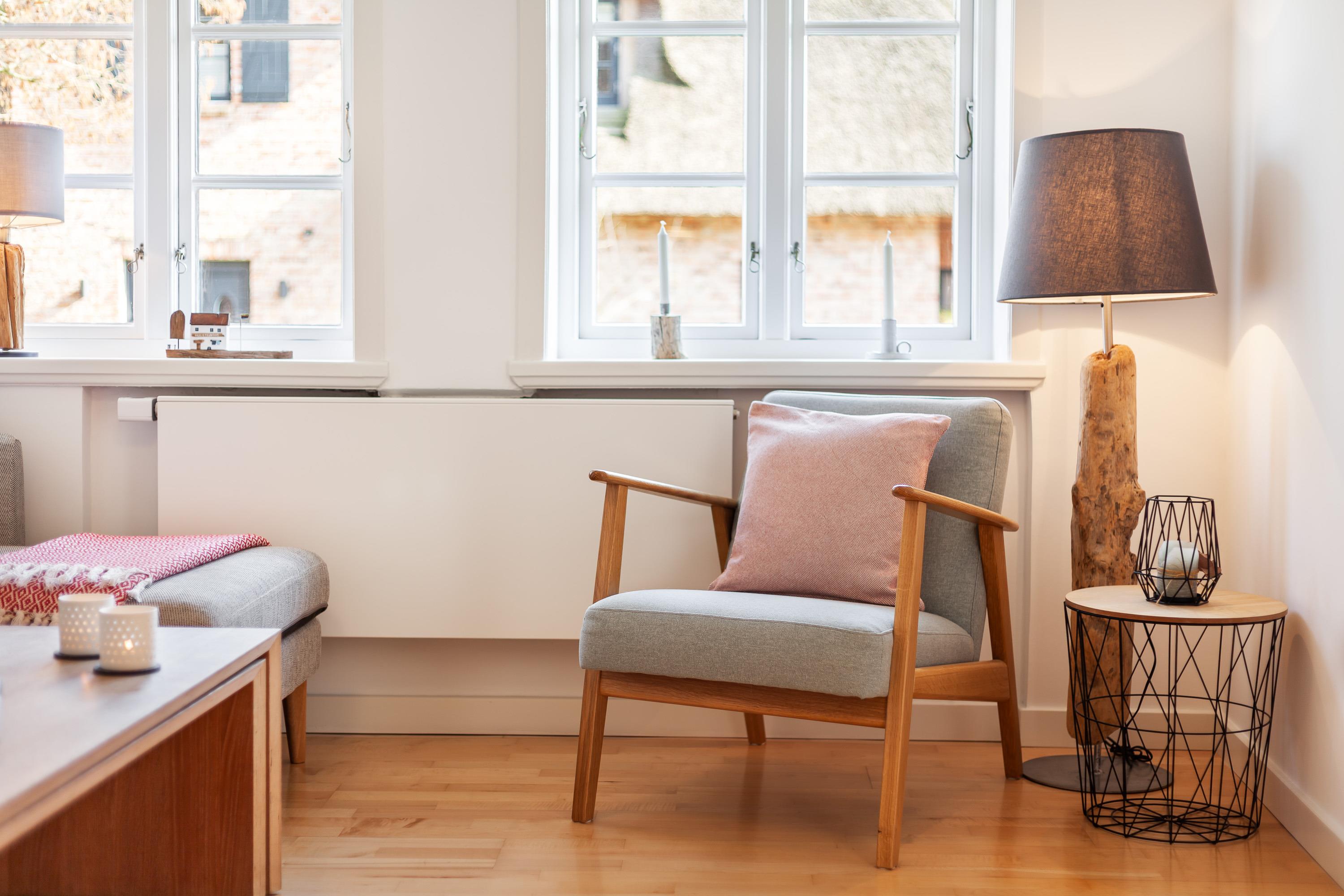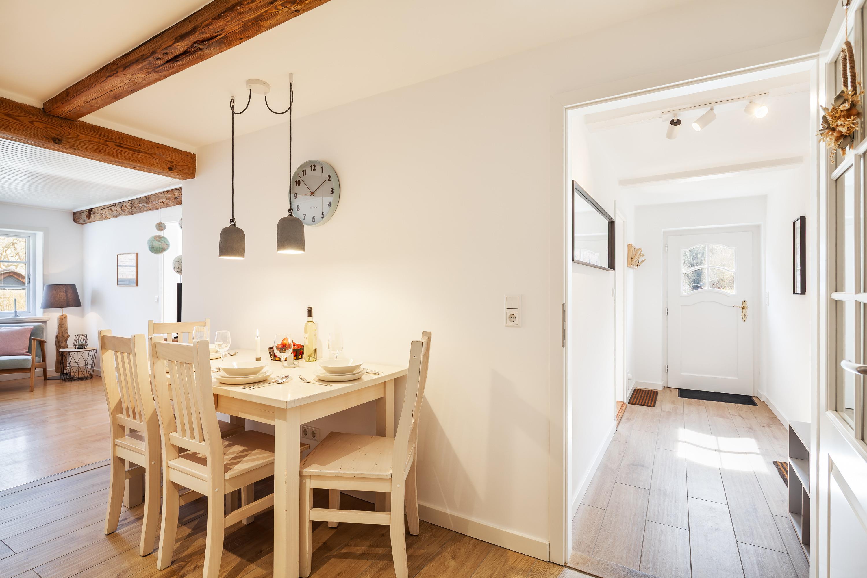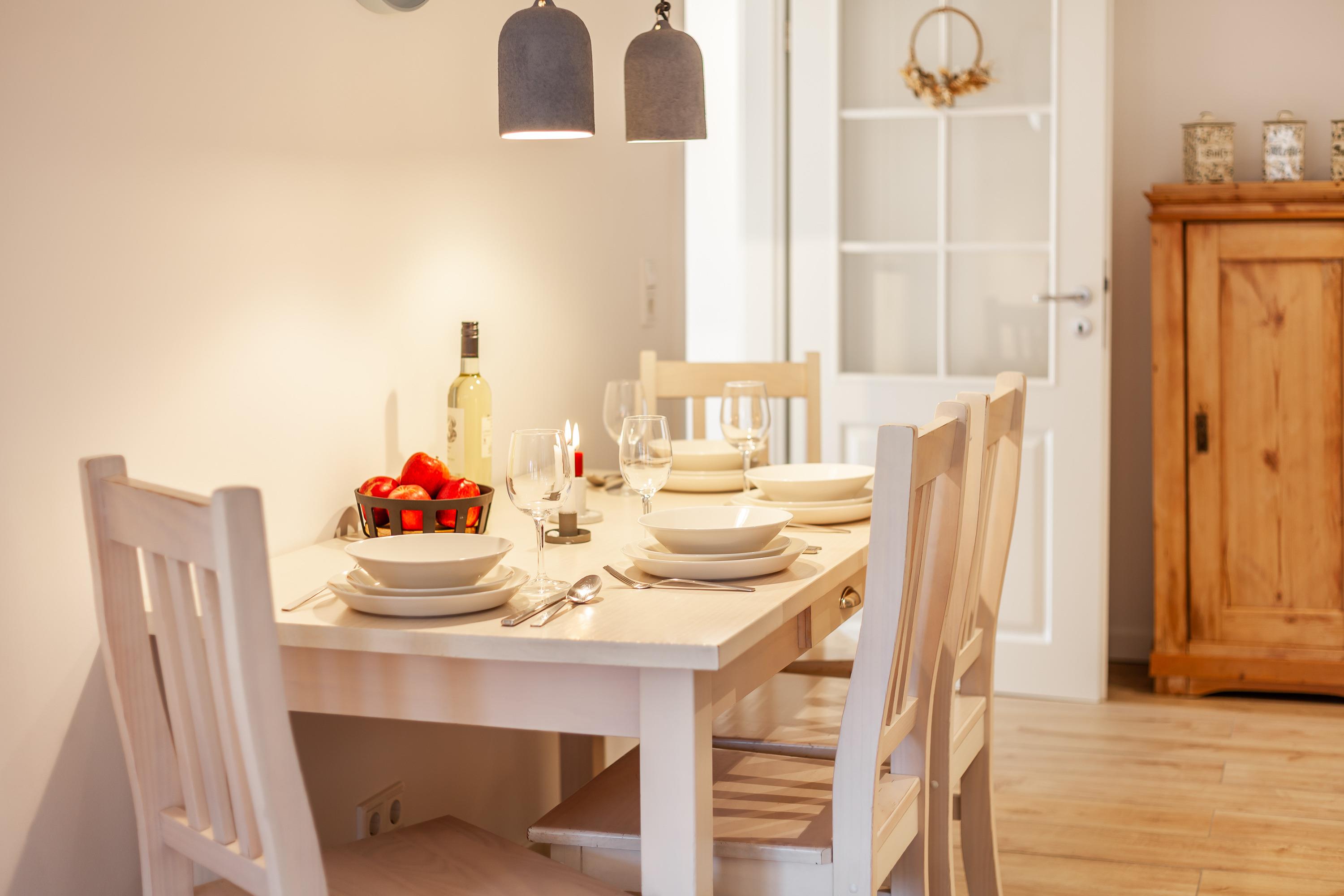 Die Wohnung Kurnkoomer – friesisch Kornkammer – lädt mit seiner liebevoll ausgestatteten Küche sowie der wohnlichen Stube zum Entspannen ein.