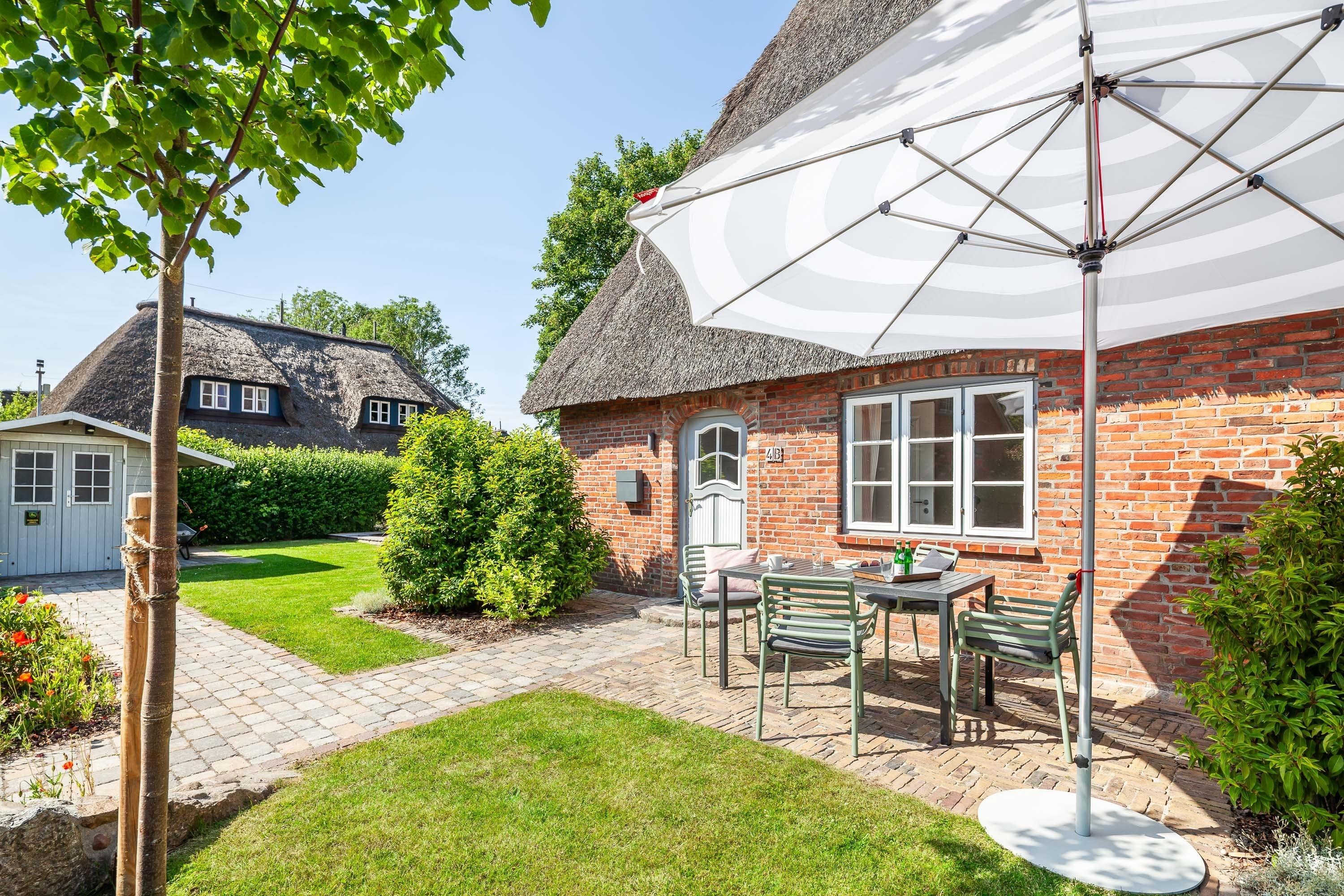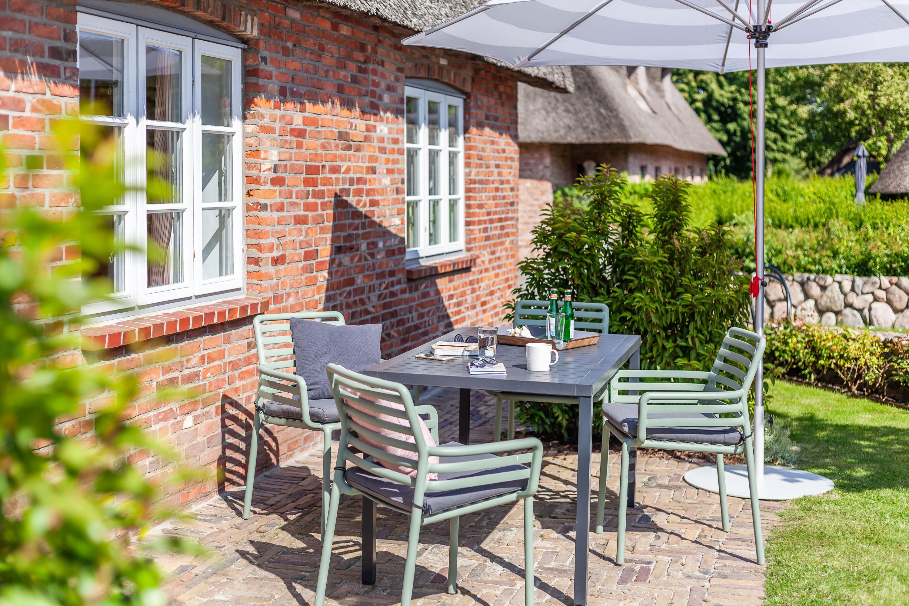 Im Sommer stehen Ihnen der von Freisenwall, Rosen und Hortensien umsäumte Garten für ein ausgiebiges Frühstück, ein Sonnenbad oder den Sundowner mit Tisch, Liegestühlen, Sonnenschirm und Gartendusche zur Verfügung.