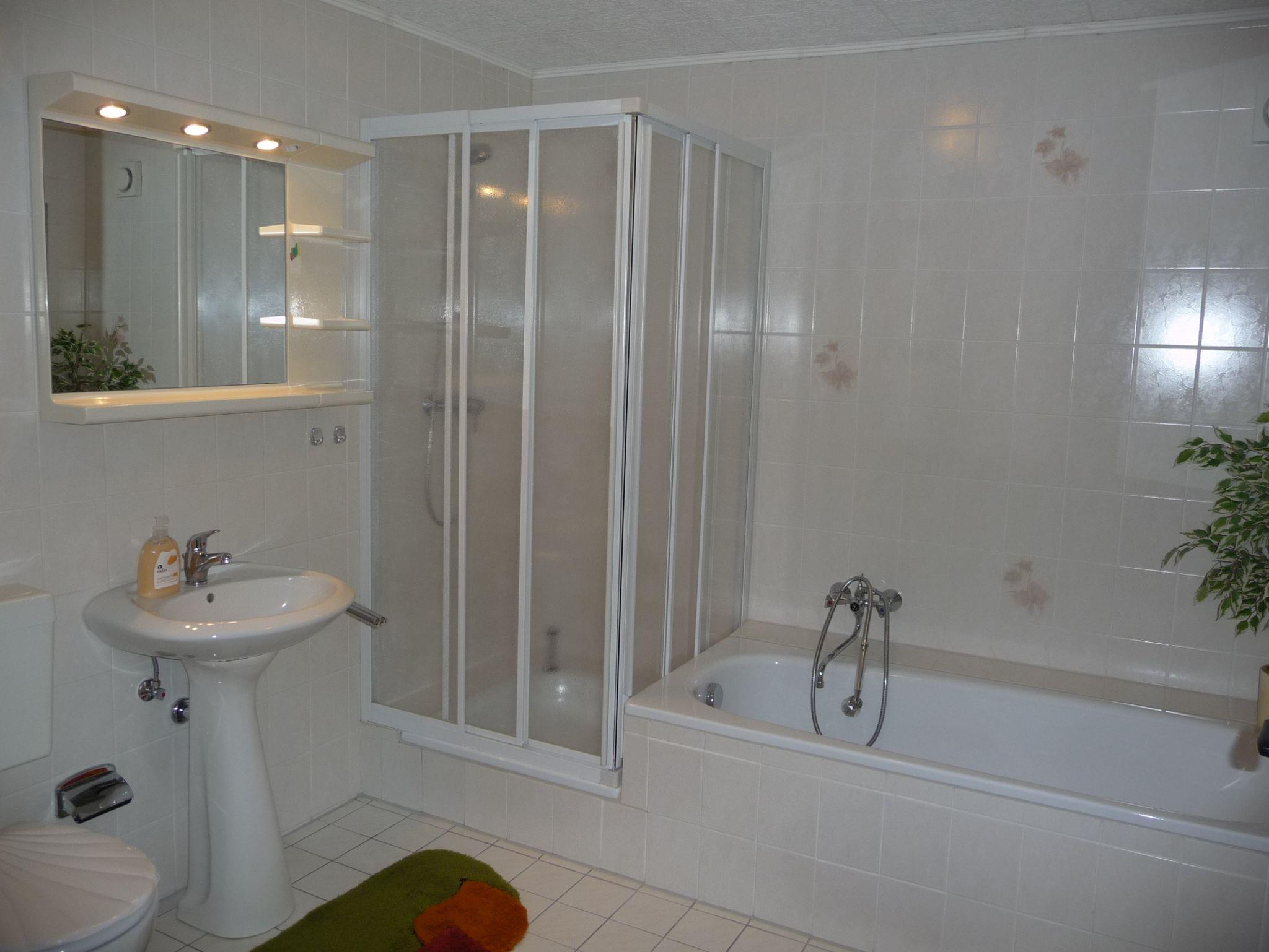 Zimmer mit Doppelbett und Doppelbettschlafcouch, Tisch und Stühlen sowie Fernseher. Das Badezimmer mit DU/WC und Badewanne ist sehr geräumig.