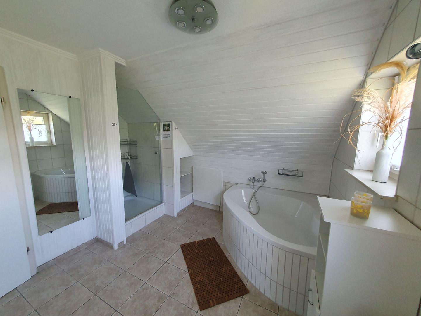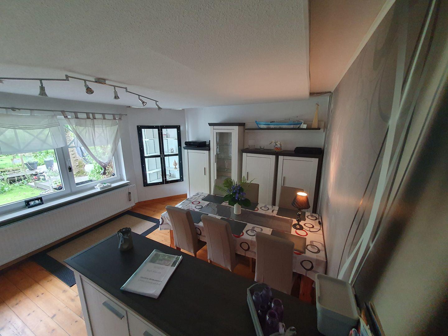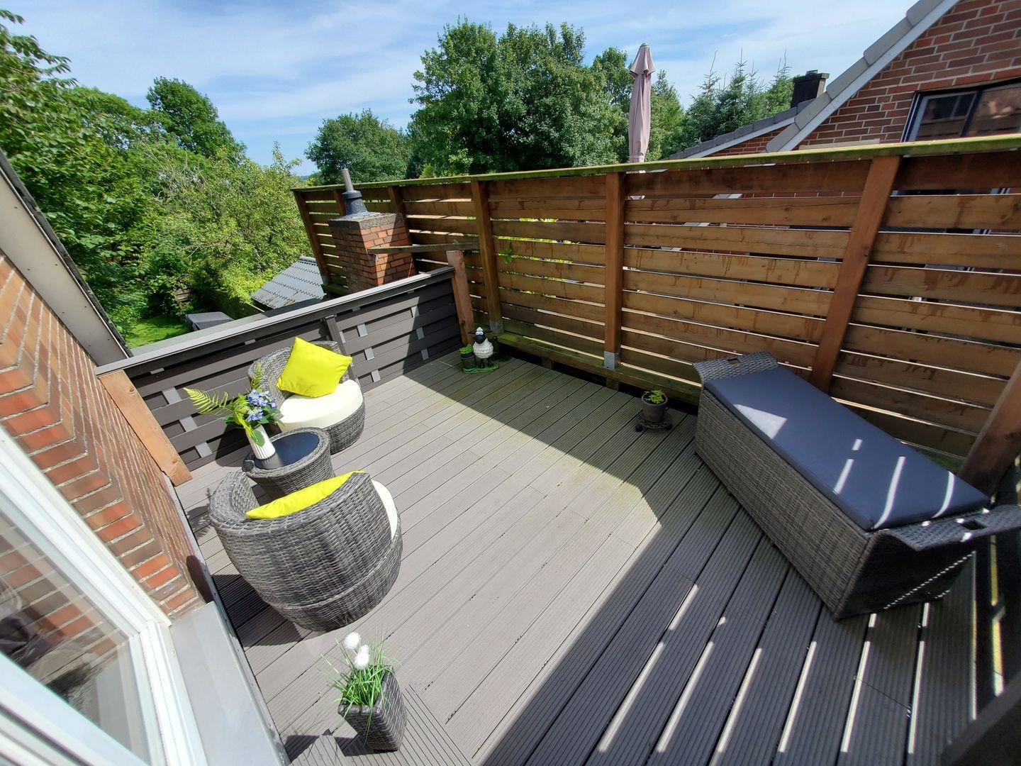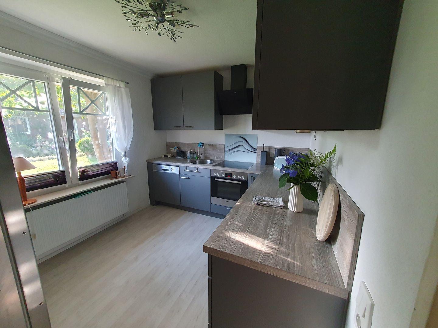 Die voll ausgestattete, moderne Küche lässt keine Wünsche offen: Von der Spülmaschine bis zur Kaffeemaschine haben Sie alles zur Hand, um kulinarische Meisterwerke zu kreieren. Im Erdgeschoss gelangen Sie zudem auf die Terrasse, wo Sie im Freien entspannen oder Abende mit Blick in den Garten genießen können. Hier können Sie auch auf den Sonnenliegen relaxen oder sich im Strandkorb eine Auszeit gönnen.