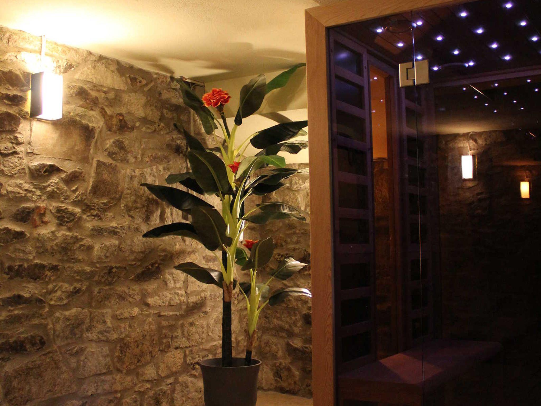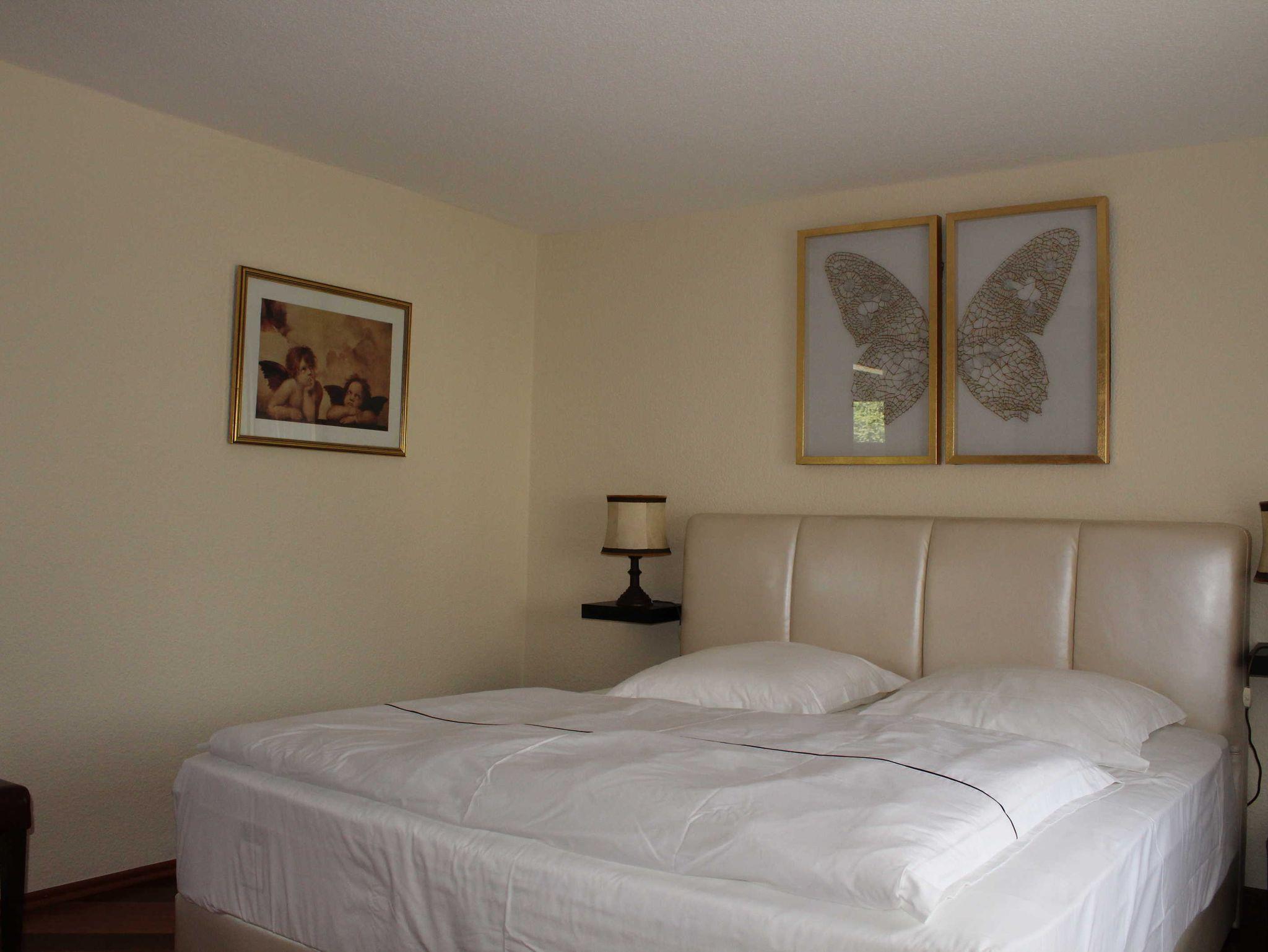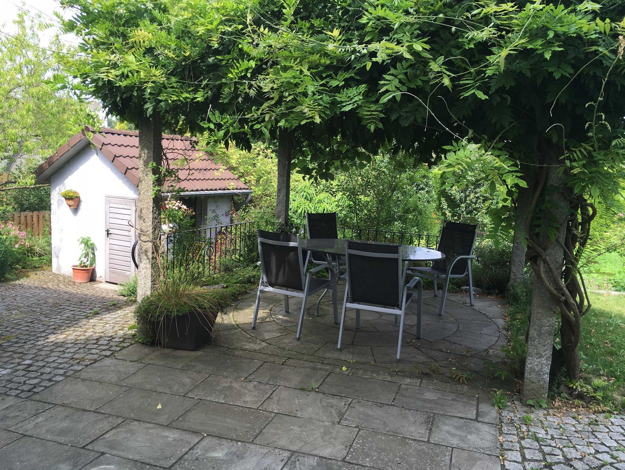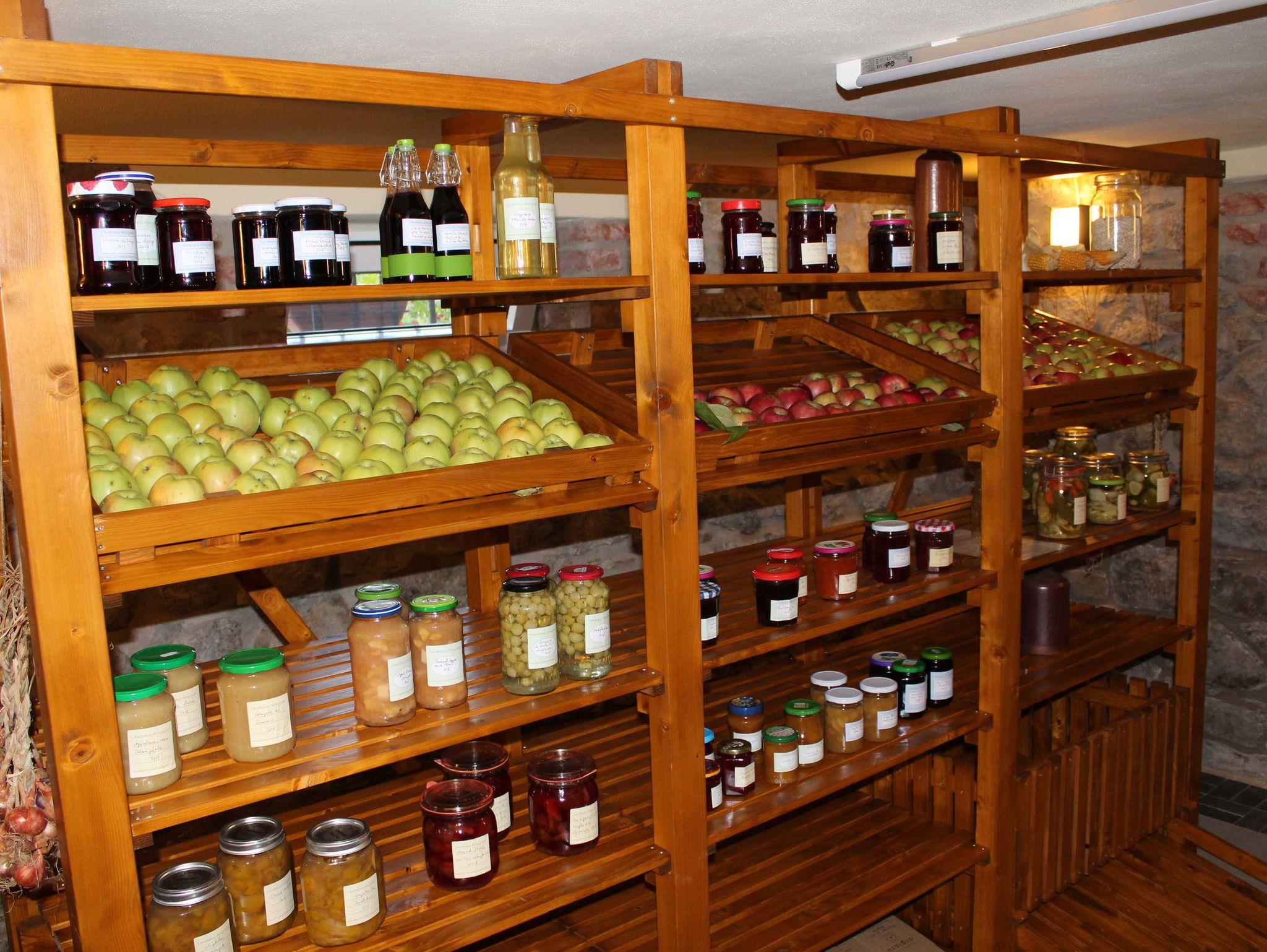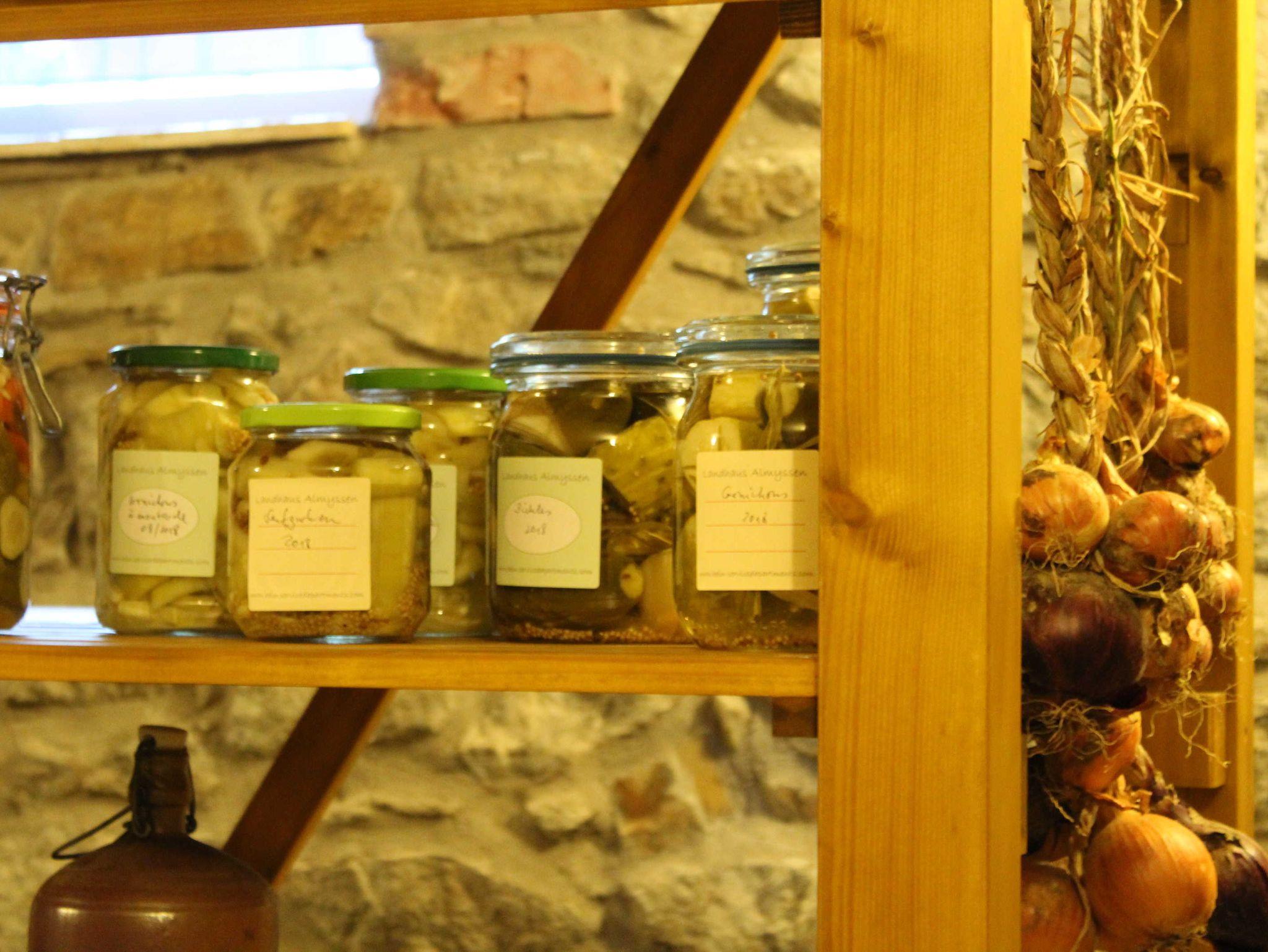 Gesamtes Haus bestehend aus 3 Schlafzimmern mit jeweils 1 Boxspringdoppelbett und hautfreundlicher Baumwollbettwäsche, 2 Bädern, davon ein Bad im EG behindertengerecht, 1 Wohnzimmer mit angeschlossener Veranda und kleiner Hausbibliothek, 1 Wohnküche mit Speisekammer, Komfort-Küchenausstattung für Selbstversorgung, Waschkeller mit Waschmaschine und Trockner sowie Möglichkeit zur Wäschetrocknung im Freien, Vorratskeller gefüllt mit traditionellen Konfitüren und Obst- und Gemüsekonserven aus eigenem Landhausanbau, Saunakeller mit Infrarotsauna und Massageliege und Möglichkeit von Massagen, Gemüse-, Kräuter- und Blumengarten rund um den von einem Blauregen überdachten Freisitz mit einem Holzkohlekugelgrill und Feuerschale und romantischer Kerzenbeleuchtung für laue Sommerabende. Gehobene Ausstattung mit Parkett-, Fliesen- und Natursteinböden, Ledermöbel, Boxspringbetten, hochwertige Sanitäreinrichtungen.