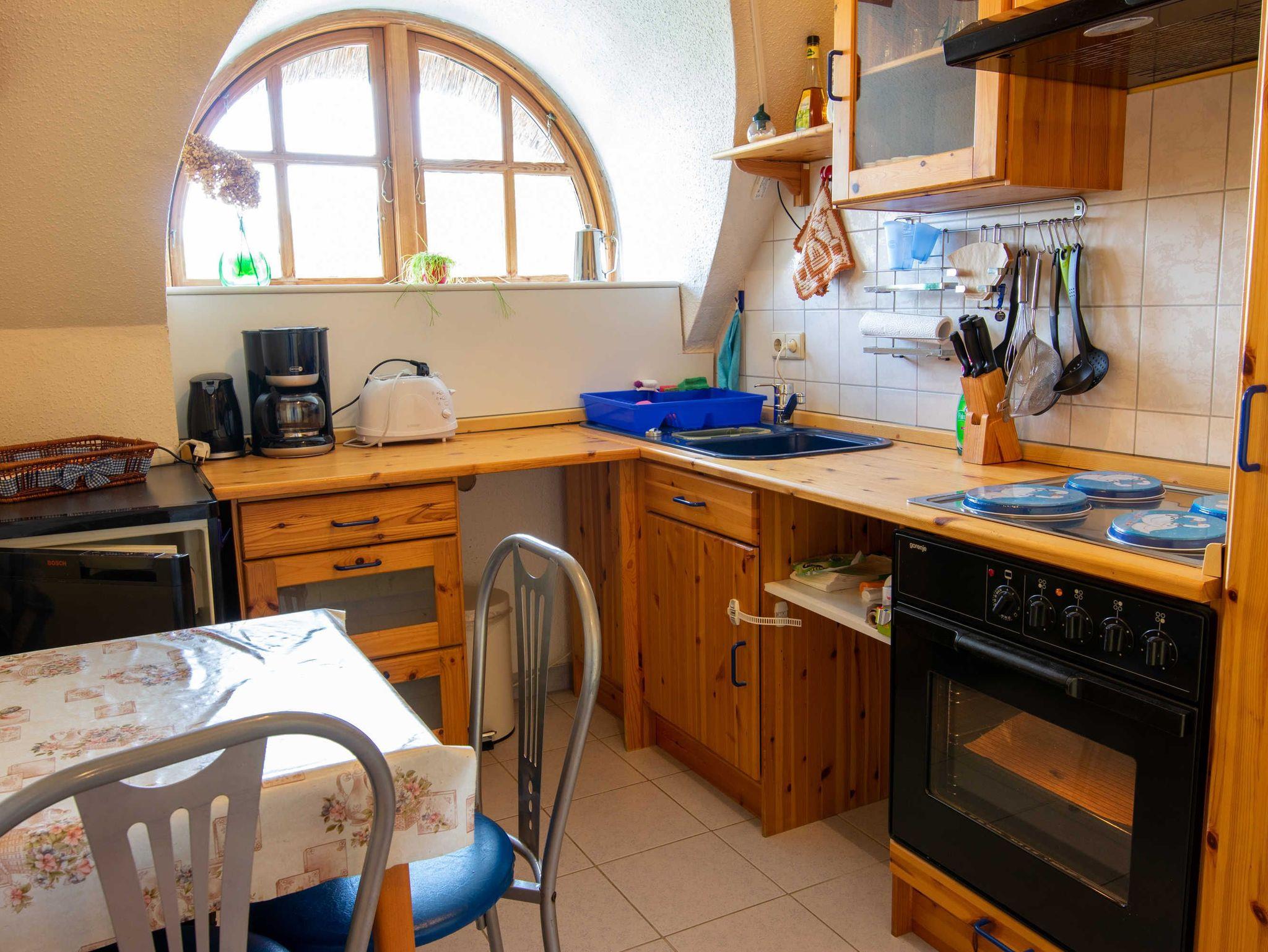 Diese Ferienwohnung 1 unter Reet ist genau richtig für alle, die es gemütlich, familiär und ein bisschen besonders mögen. Auf zwei Etagen bietet sie Platz für bis zu fünf Personen ? ideal für Familien mit größeren Kindern oder kleine Gruppen. Im Wohnbereich erwartet dich eine Schlafcouch für eine zusätzliche Person sowie eine bequeme Liege - perfekt zum Entspannen, Lesen oder als Einzelbett nutzbar. Zwei separate Schlafzimmer bieten je ein französisches Doppelbett (140x200). Das erste Schlafzimmer im Obergeschoss dient als Durchgangszimmer zum zweiten Schlafzimmer im ausgebauten Spitzboden, den du über eine schmale Spartreppe erreichst. Dort kannst du übrigens ganz aufrecht stehen! Dazu gibt es eine voll ausgestattete Küche, ein Duschbad mit WC und einen separaten Eingang über das gemeinsame Treppenhaus. Ein Babyreisebett ist ebenfalls vorhanden. Für einen unkomplizierten und naturnahen Urlaub mit viel Charme und Platz unter dem Reetdach.