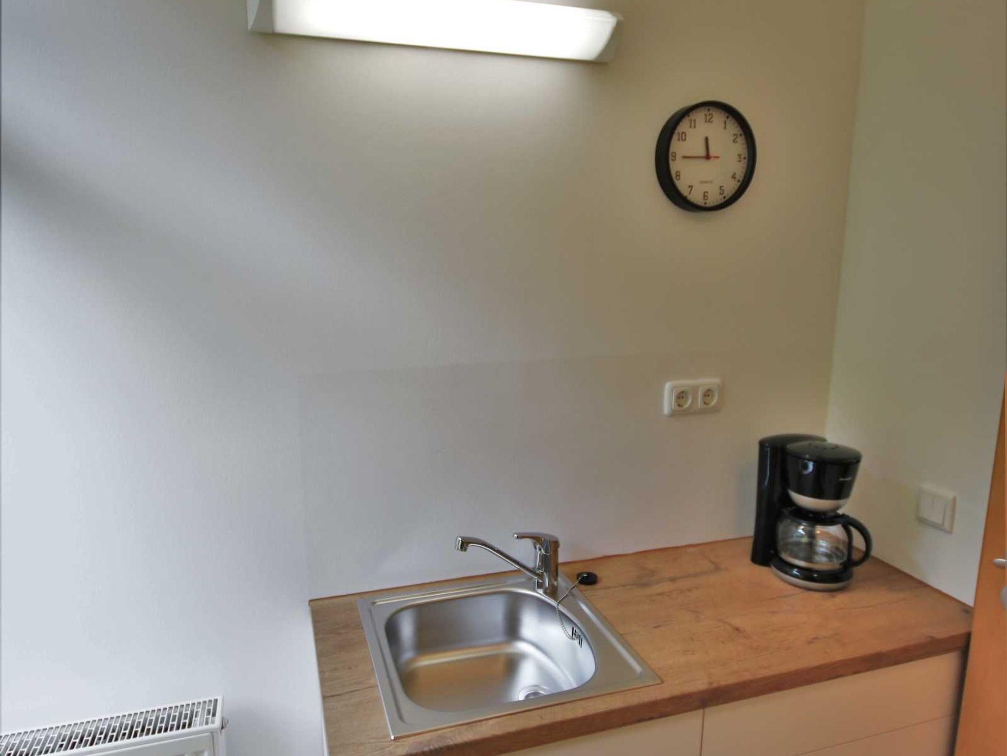 Die separate, außen liegende moderne Einbauküche bietet einen Kühlschrank mit Tiefkühlfach, einen Geschirrspüler, Kaffeemaschine, Wasserkocher, Toaster, Mikrowelle mit Grillfunktion, 2- Platten- Ceranfeld sowie reichlich Geschirr.