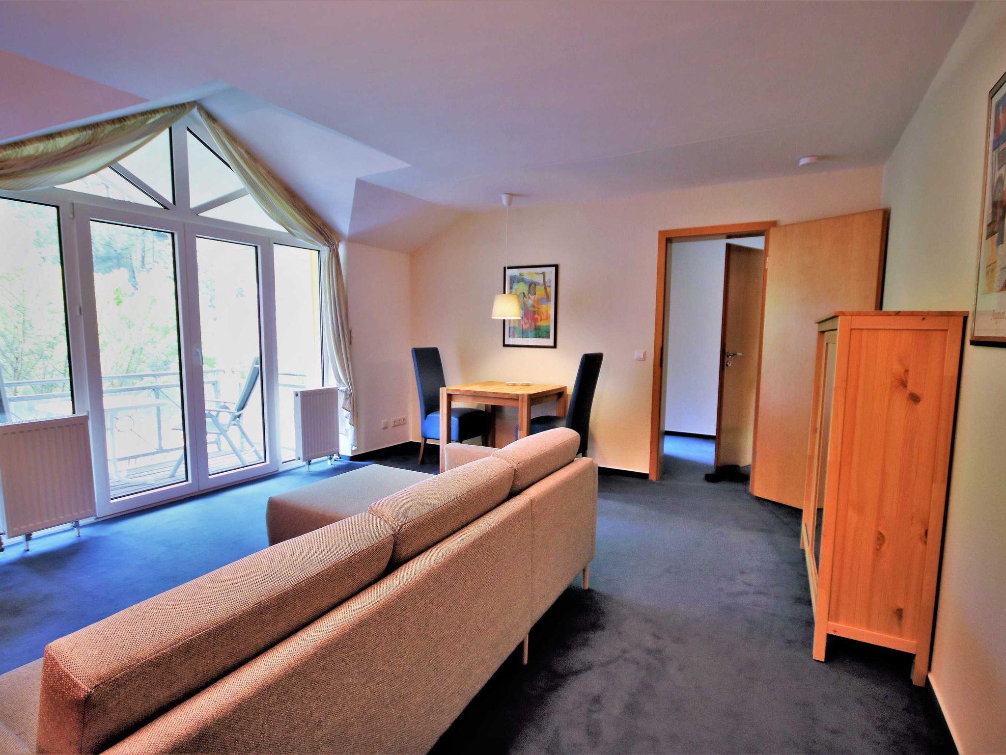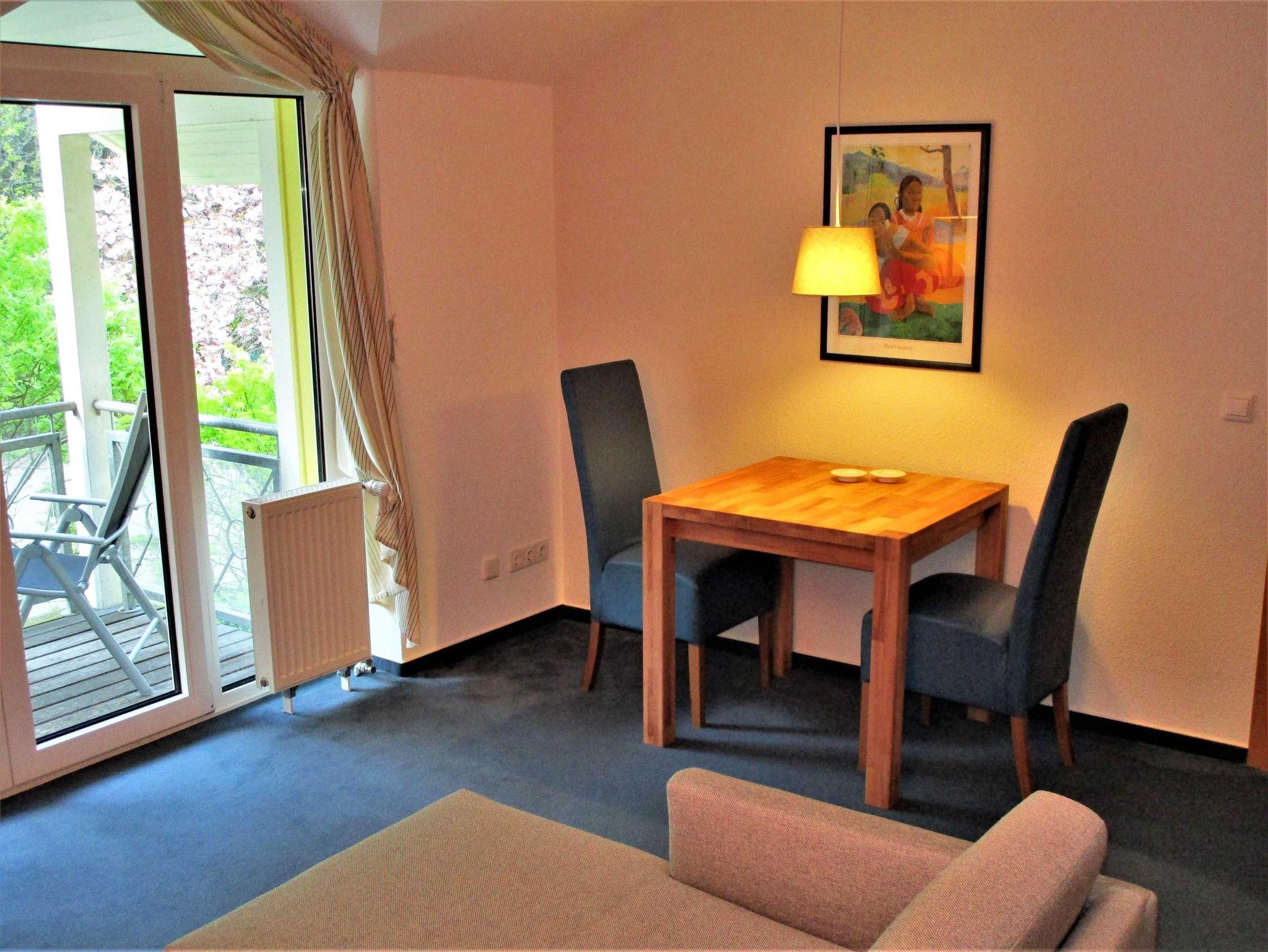Die 55 m² große Nichtraucher- Ferienwohnung 4 mit eigenem PKW- Stellplatz befindet sich im ersten Obergeschoss des Haupthauses zur angenehm kühleren Waldseite und verfügt über einen großzügigen Wohnraum mit einer gemütlichen Sofaecke mit TV, Radio und DVD und einem überdachten Balkon, auf dem Sie die Nachmittagssonne genießen und selbst bei leichtem Regen geschützt an der frischen Luft sitzen können. Die hellen, frisch und modern eingerichteten Räume strahlen Wärme und Behaglichkeit aus. Das große Schlafzimmer mit einem Himmelbett bietet einen herrlichen Panoramablick auf imposante Kiefern. Das Bad mit Dusche und WC verfügt über reichlich Ablageflächen.