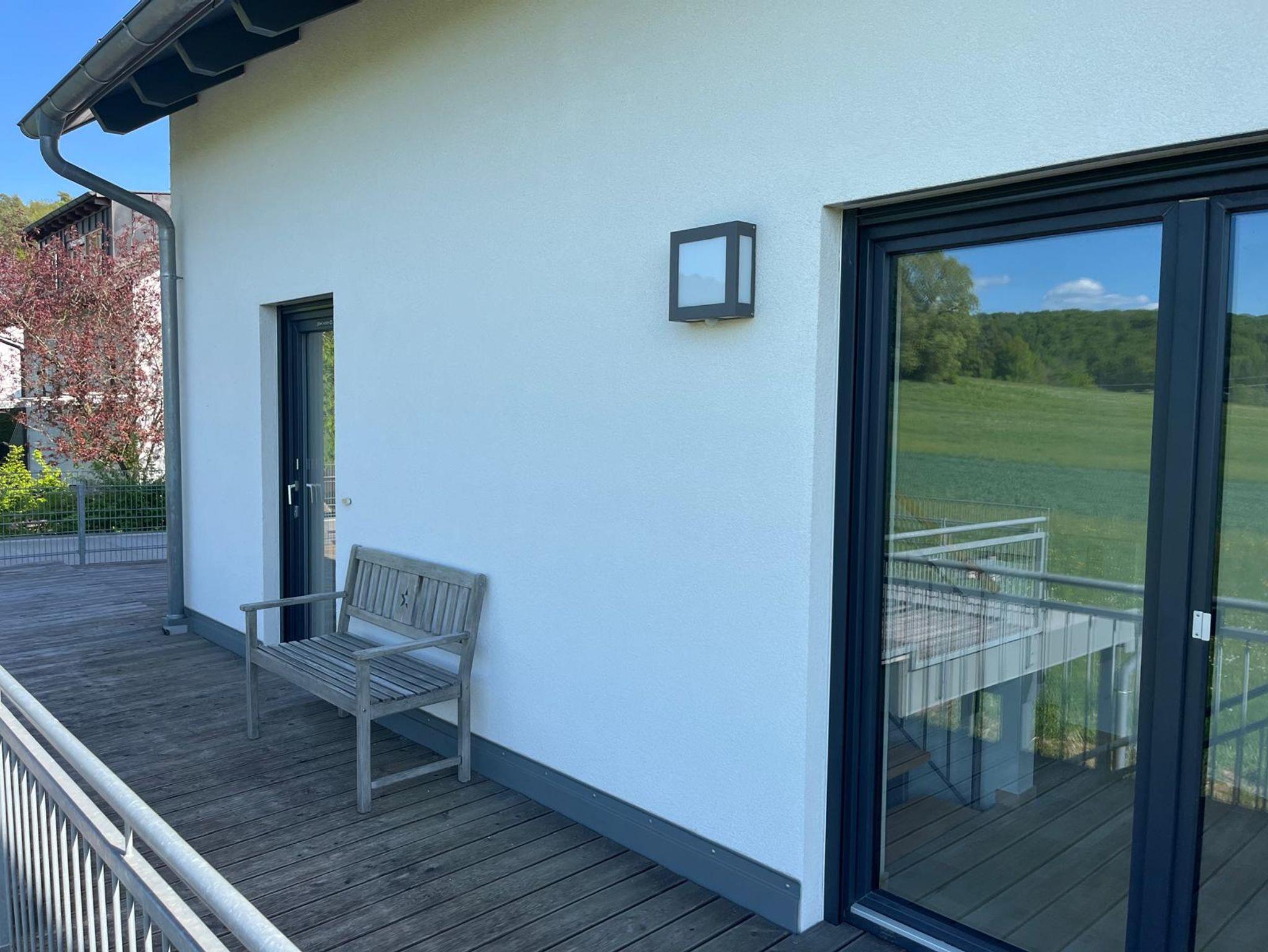 Gewürzen etc., sowie alles für das erste Ankommen, ausgestattet. Das moderne Bad mit Dusch-/Badewanne verfügt auch über eine Waschmaschine und einen Trockner. Der Ausblick von der 50 qm großen Dachterrasse bietet zu jeder Jahreszeit eine unbebaute, schöne und freie Sicht zu Wiesen und Wäldern. Die Ruhe der Natur können Sie direkt genießen, aber auch aktiv mit radeln, schwimmen, klettern oder sich direkt vor unserer Haustüre auf die schönen Wanderwege begeben. Es steht Ihnen ein kostenloser Parkplatz, sowie eine E-Ladestation (gegen Gebühr) zur Verfügung. Grillen und Lagerfeuer möglich.Bis zu vier Personen können in zwei voneinander getrennten Schlafzimmern übernachten. Überzeugen Sie sich selbst und wir sagen schon jetzt ein herzliches Willkommen in unserer Wohlfühloase!