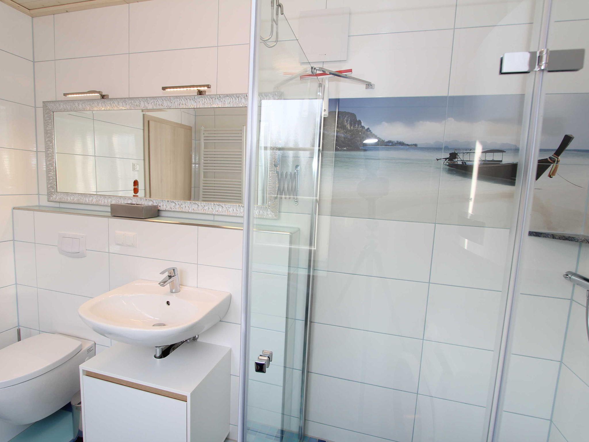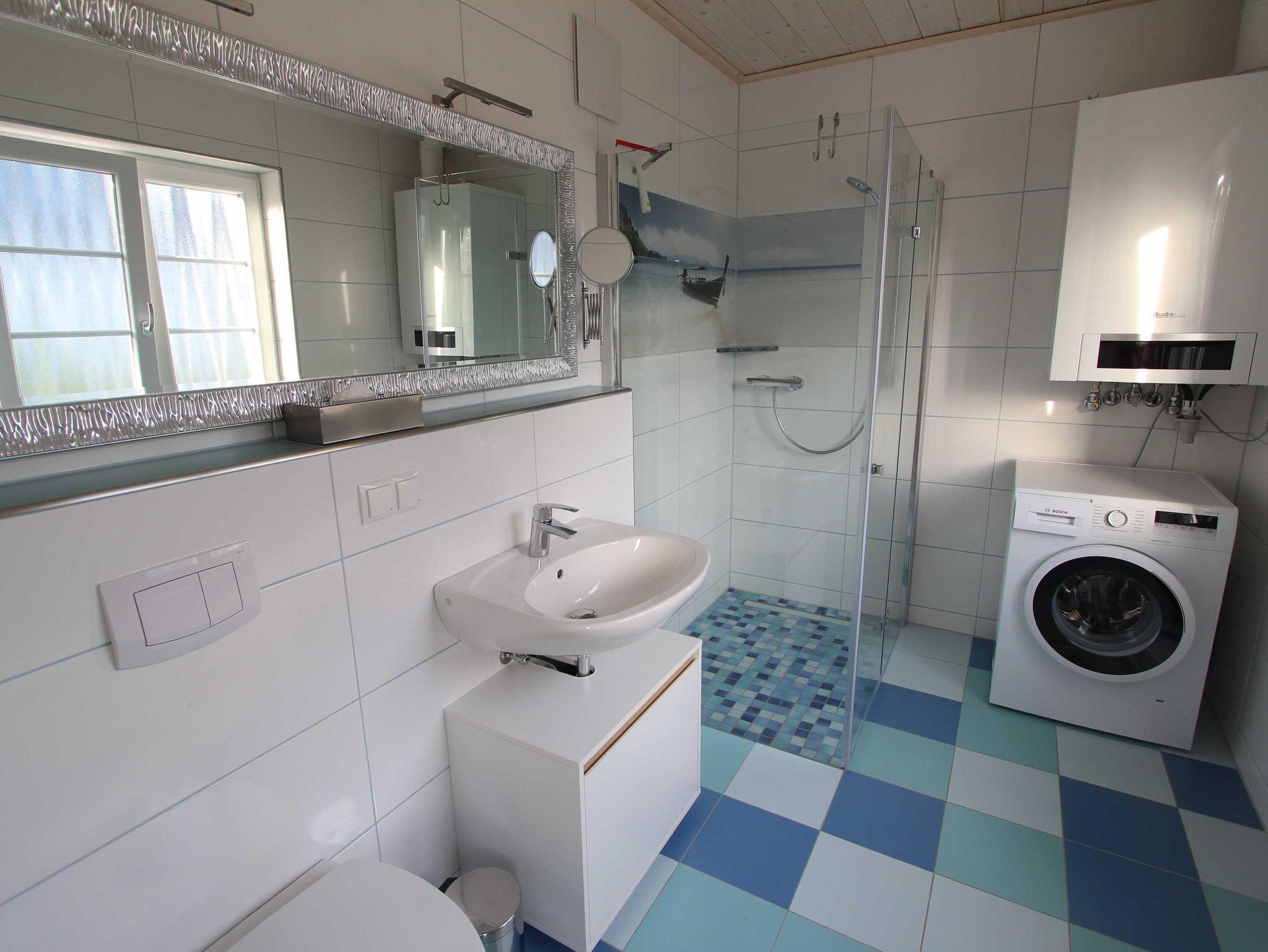 Das Badezimmer mit Erdgeschoss ist mit einer 1,20m großen Dusche, Föhn und Waschmaschine ausgestattet. Im Obergeschoss befindet sich ein zweites Badezimmer, welches ebenfalls über eine Dusche verfügt.