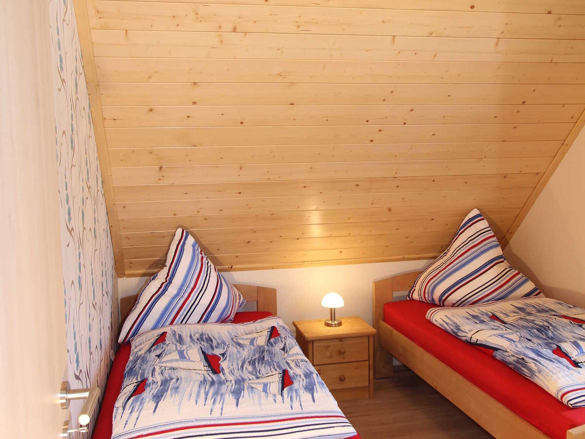In der Doppelhaushälfte gibt es drei separate Schlafzimmer. Eines ist mit einem Doppelbett (180x200; getrennte Matratzen), einer Sitzgelegenheit, TV, Kleiderschrank, nachtschränke und einen Herrendiener ausgestattet. Die beiden anderen Schlafzimmer verfügen jeweils über zwei zusammenstellbare Einzelbetten (100x200; 90x200), Kleiderschrank, Nachtschränke und auch Herrendiener.