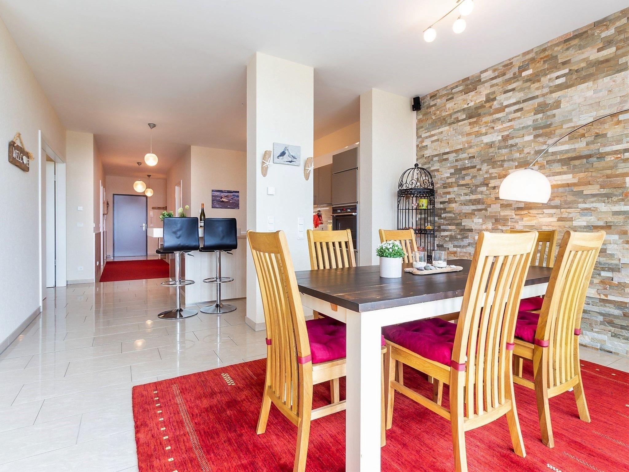 Die moderne Küche schließt sich dem Wohn-/Esszimmer an und bietet jeglichen Komfort, einschließlich einem Küchenblock mit Sitzgelegenheit für 2 Personen.