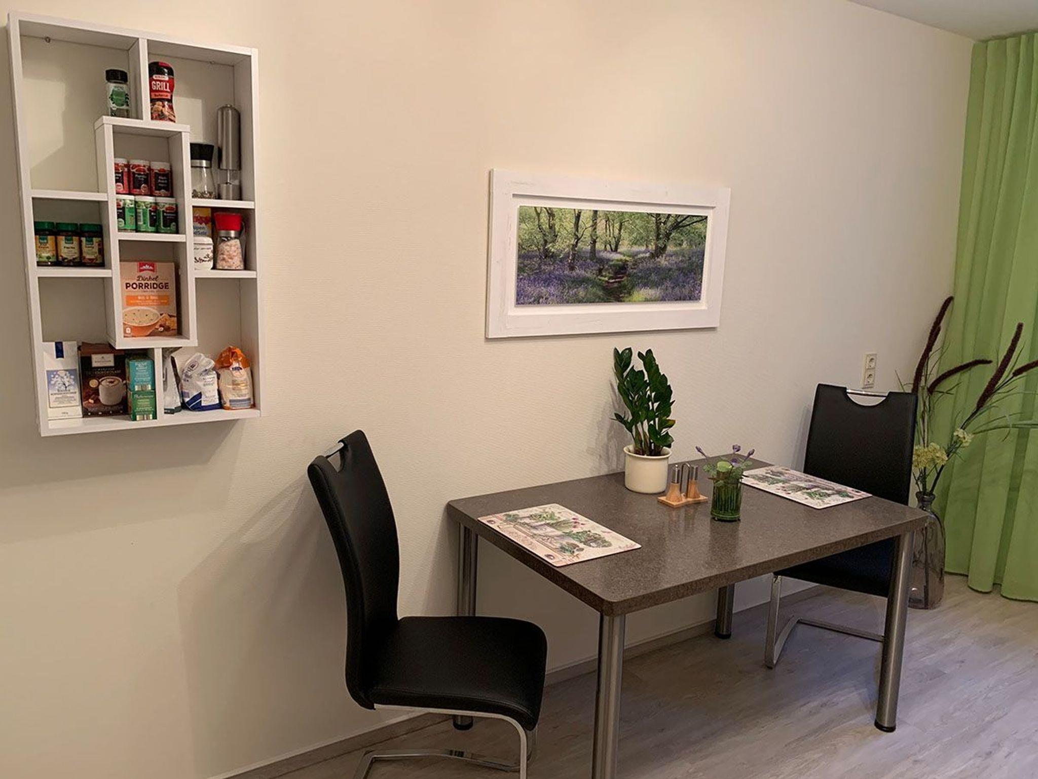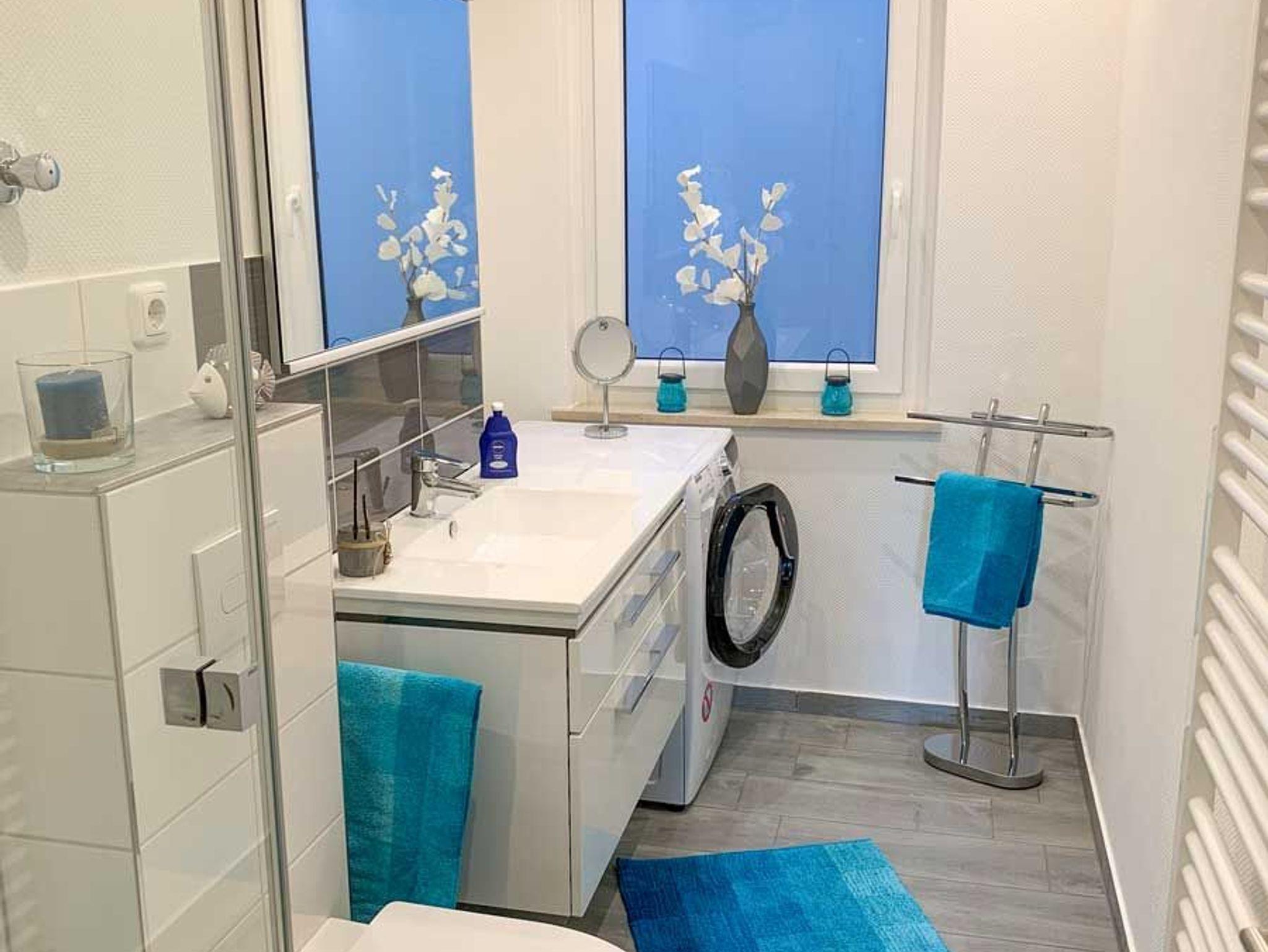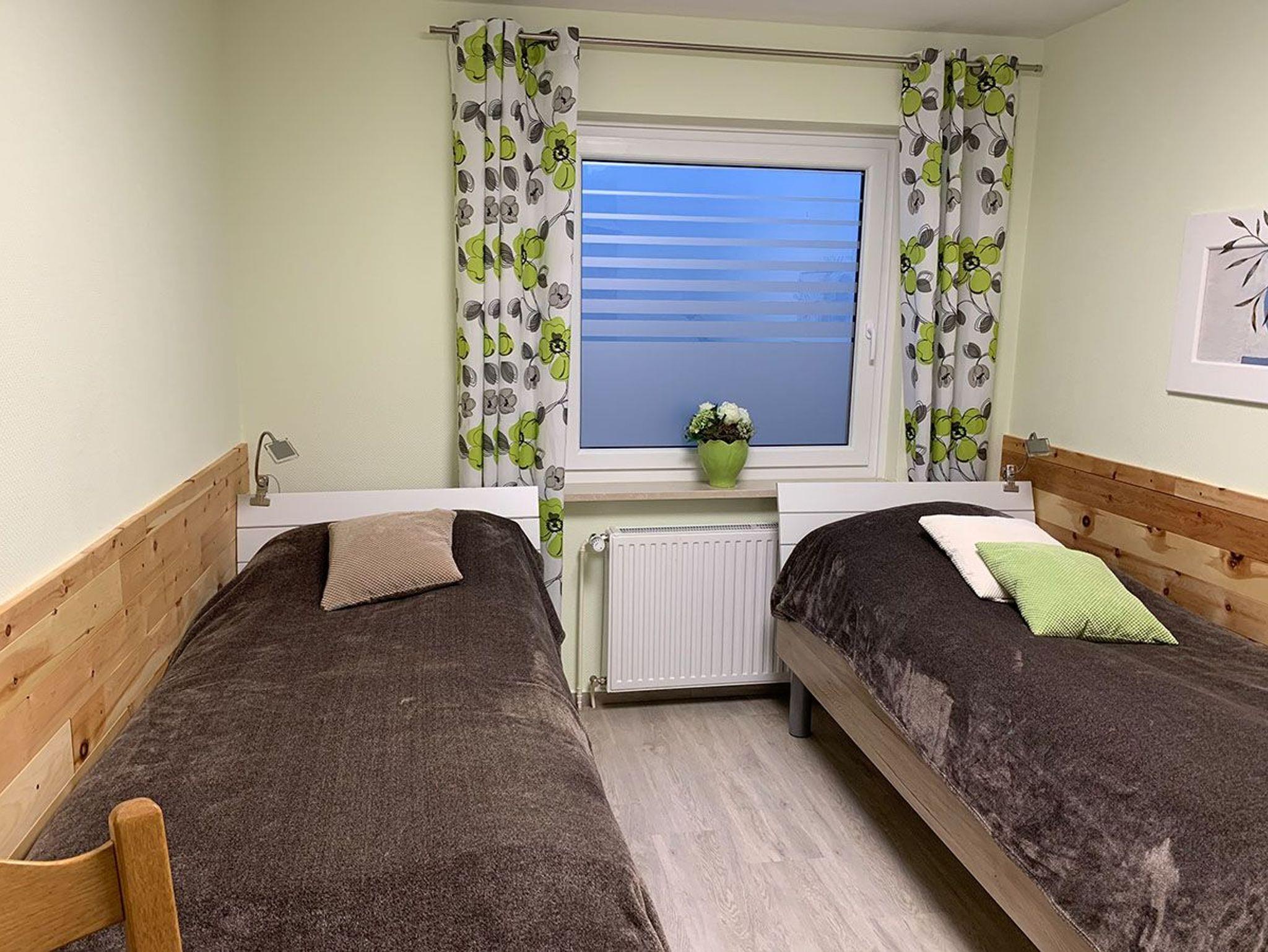 Nach dem Hauseingang, die Treppe runter, ist der Eingang der Ferienwohnung. Die Wohnung ist ruhig gelegen, hat eine West-Terrasse und ist ca. 60-70qm groß. In den Schlafzimmern befinden sich jeweils ein Doppelbett (2,00m x 1,80m) und zwei Einzelbetten (2,00mx0,90m). Die Küche ist gut ausgestattet und Im Wohnzimmer finden Sie ein Sofa, Smart-TV und eine Essecke.