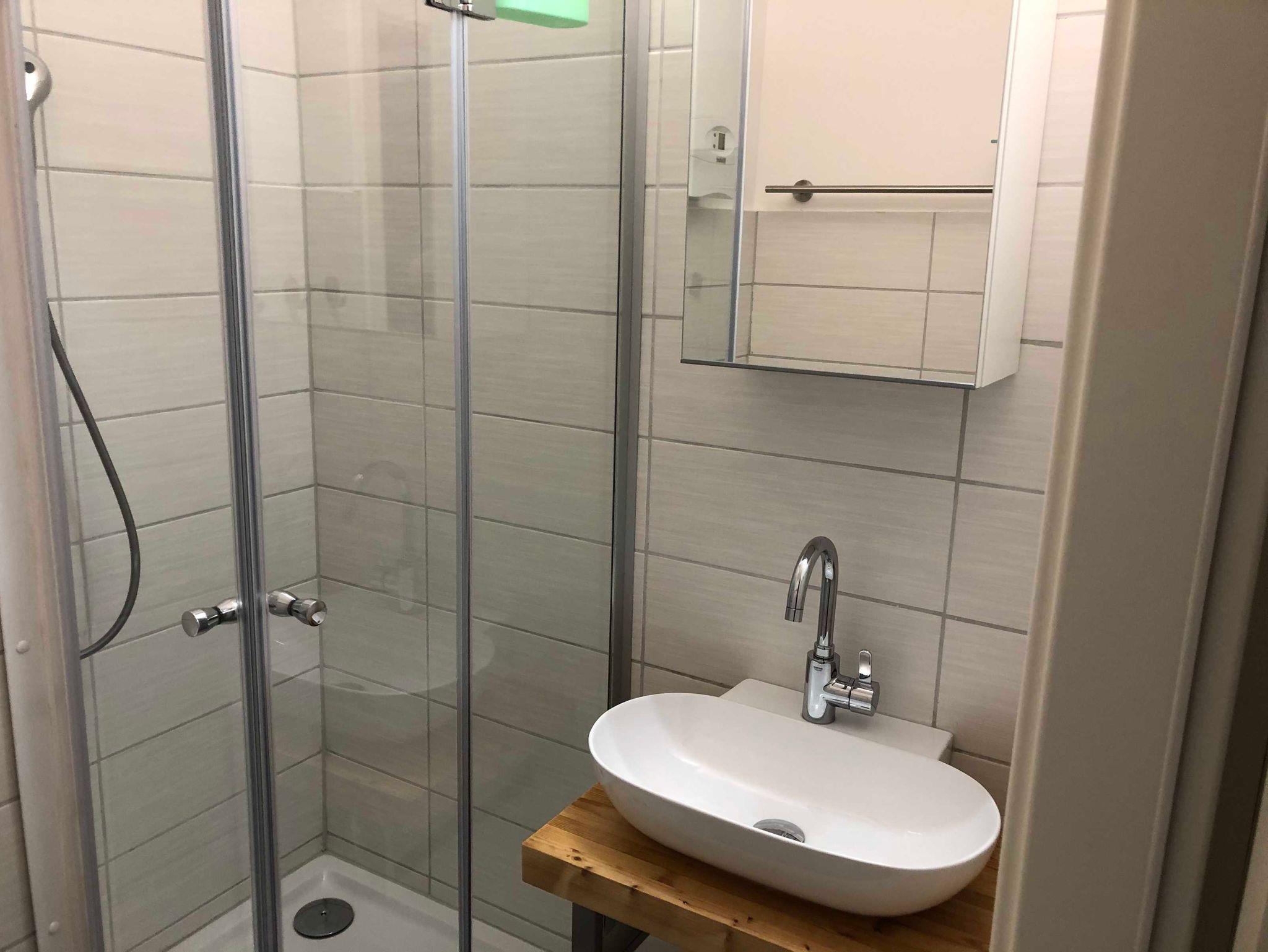Dusche mit Regenduschbrause, Spiegelschrank