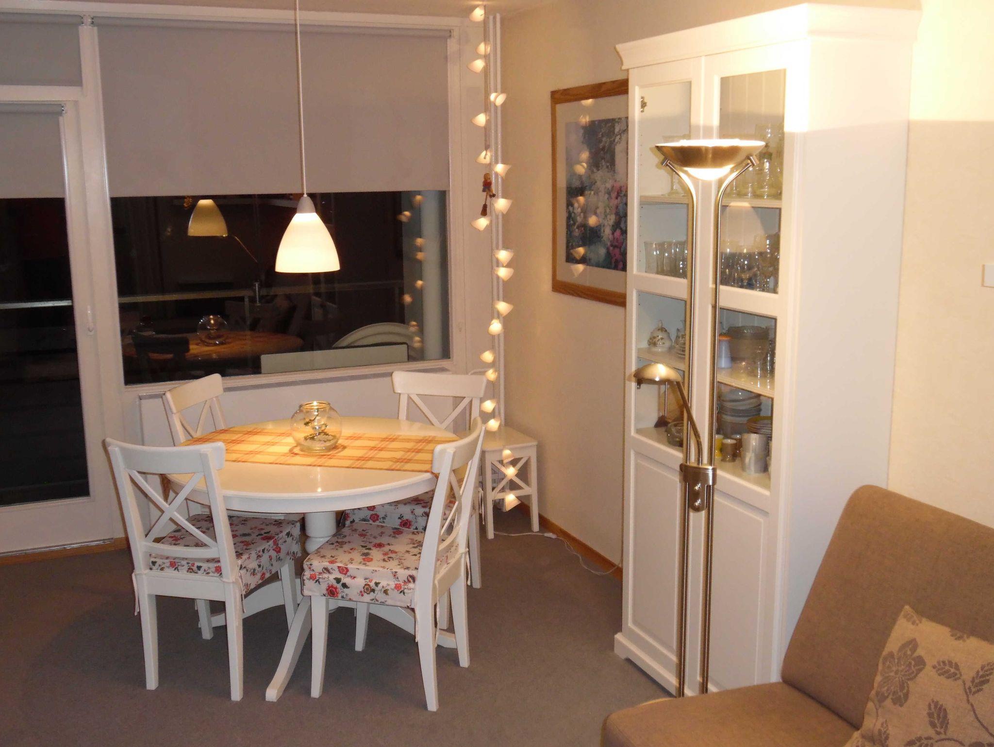 Die Möblierung im Wohnzimmer der Ferienwohnung Schützenklippe G-II-2-4 ist solide weiß mit Flachbild-TV, Blue-Ray-Disc-Player und CD-Stereo-Anlage.