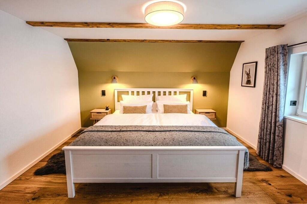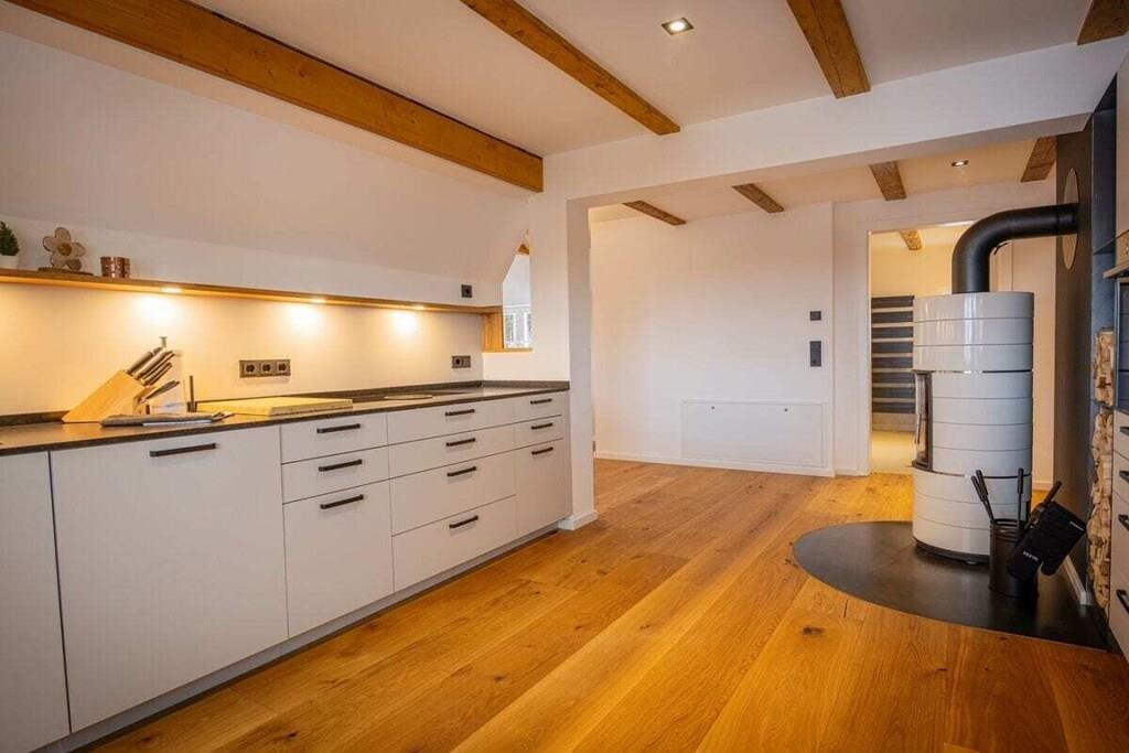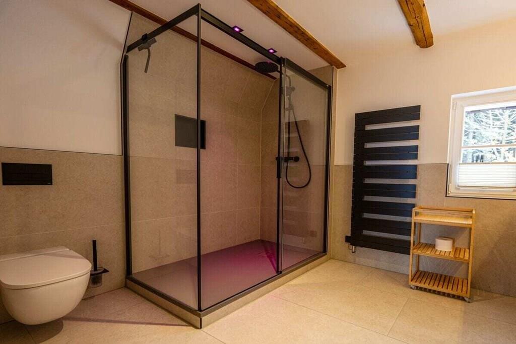 There is space and relaxation for the whole family on over 100m². Here, the four of you can simply be together and share unforgettable experiences. A family pizza can be easily conjured up in the open and spacious kitchen. You can toast your friends to a delicious meal and spend a fun evening playing games at the large dining table right in front of the warm fireplace. The cozy living area and the view towards the Ore Mountains forest invite you to cozy evenings. The two bedrooms with double beds and a color-lit wellness shower round off the comfort.