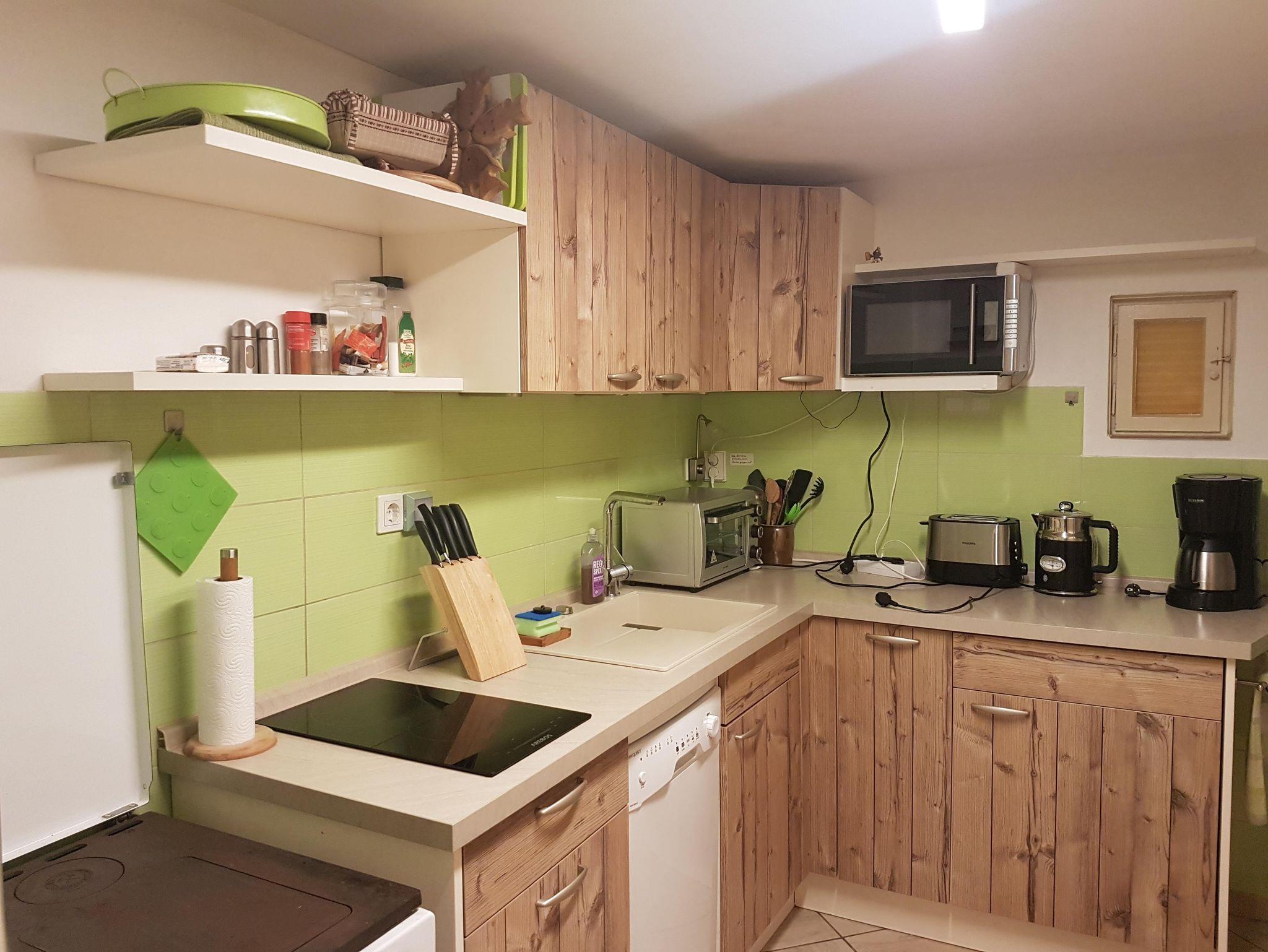 In der vollausgestatteten Küche befinden sich: Kühlschrank, Mikrowelle, Kaffeemaschine,