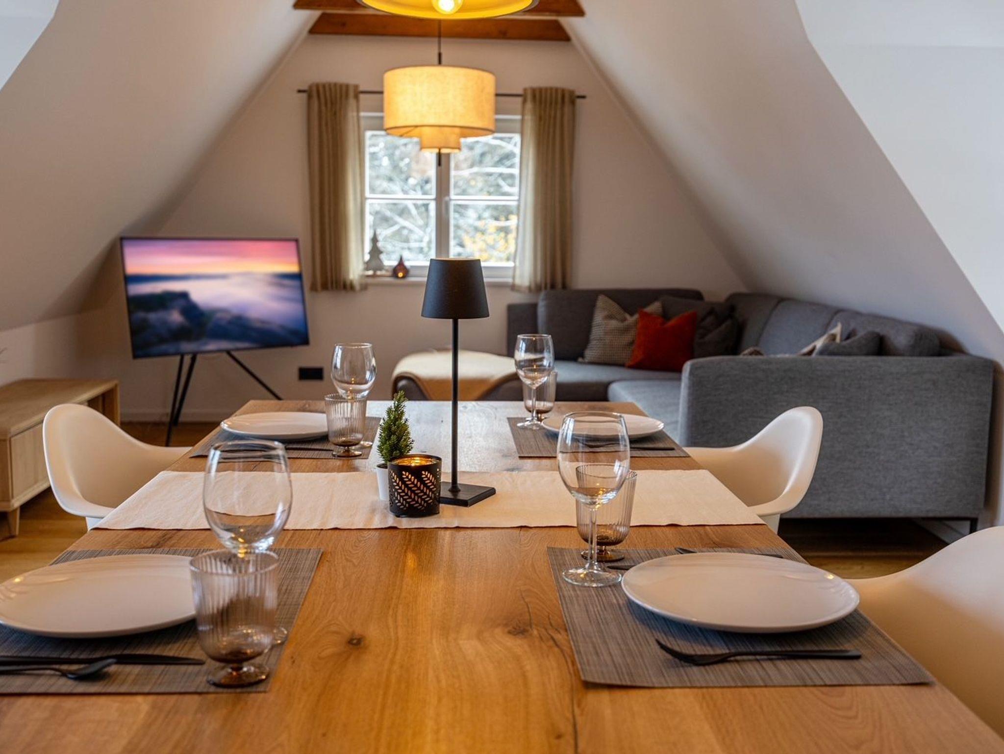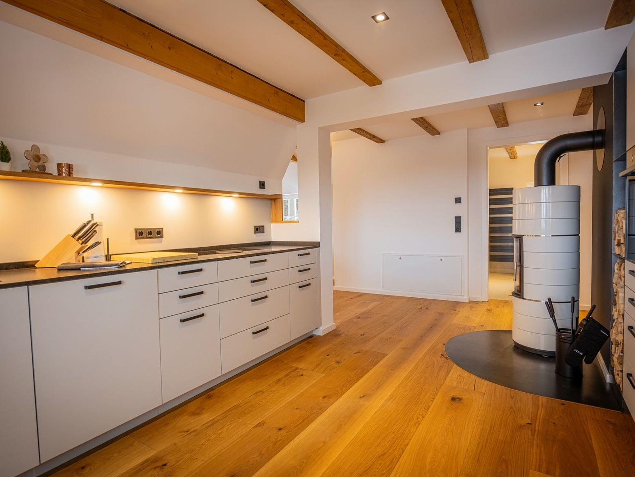 Die großzügige Küche ist der ideale Ort zum gemeinsamen Kochen und verweilen. Der gemütliche Wohnbereich und der Blick in Richtung Erzgebirgswald lädt zu kuscheligen Abenden vorm Kamin ein.