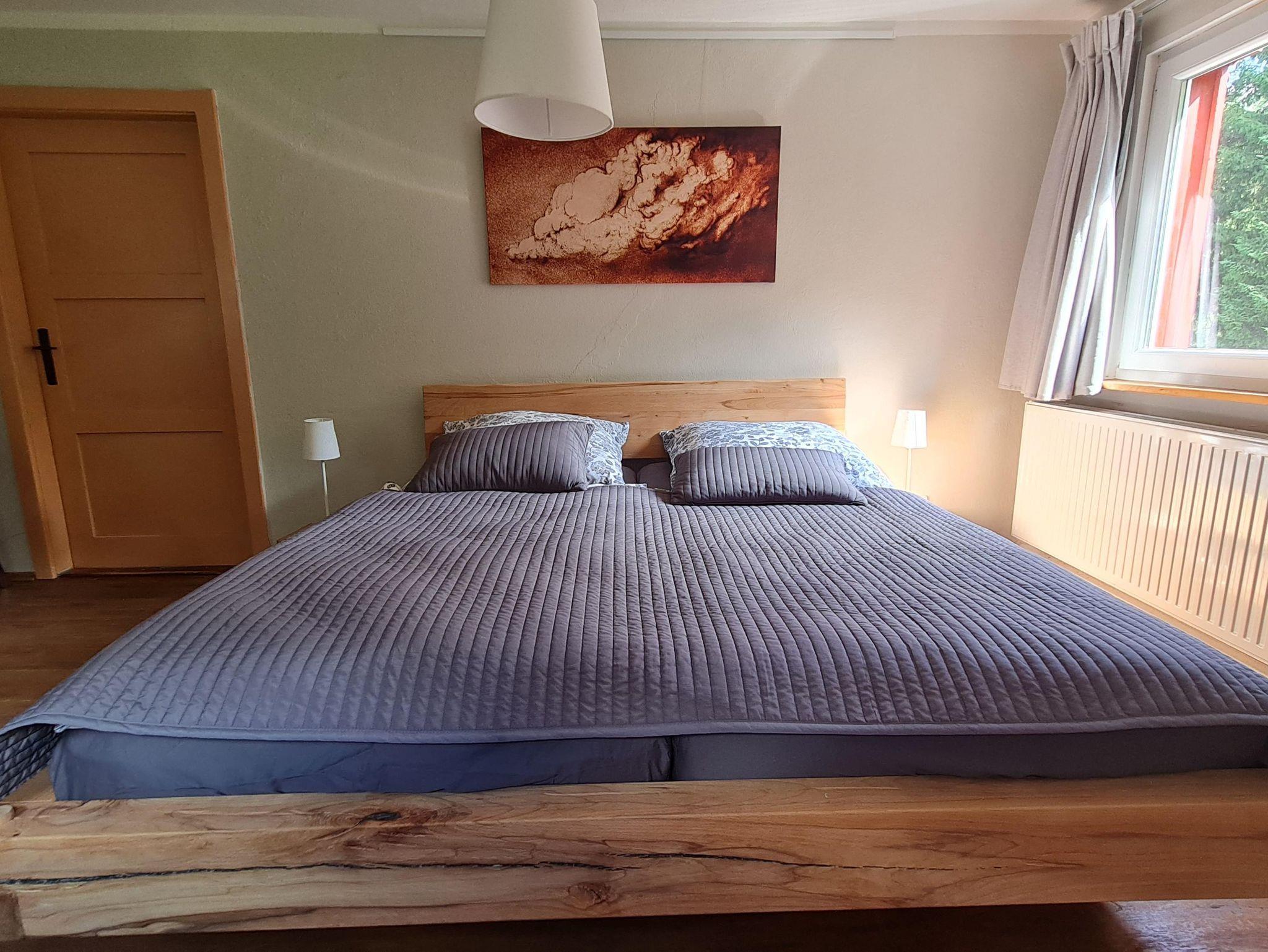 Das Obergeschoss besteht aus 3 Schlafräumen. 2 davon sind mit Doppelbetten (1x Boxspringbett; 1x großes Doppelbett) ausgestattet. Im 3. Schlafraum gibt es ein Etagenbett und ein Einzelbett. Ein Kinderbett lässt sich zusätzlich einsetzen.