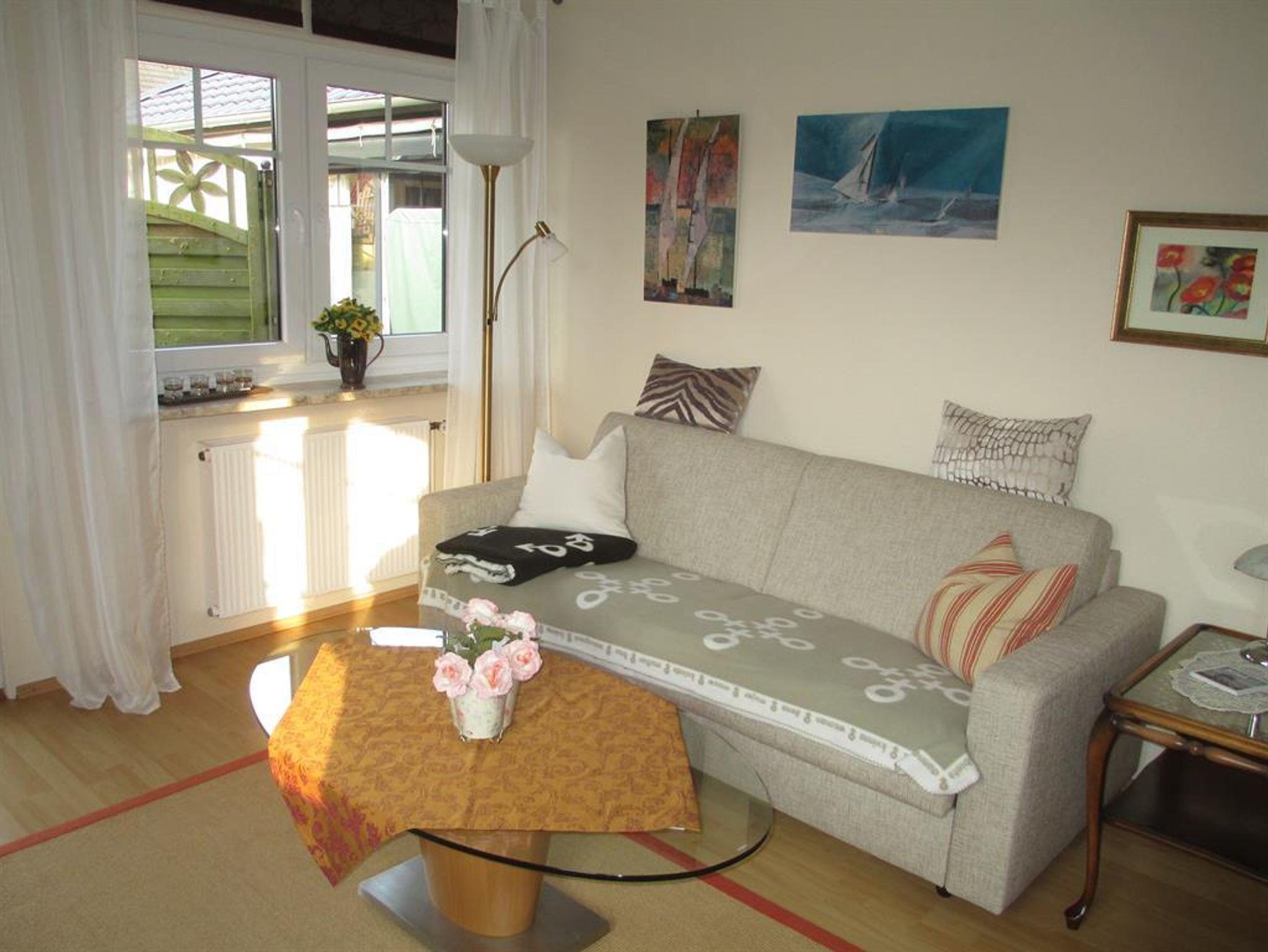 Das nach Süden ausgerichtete Wohnzimmer ist folgendermaßen ausgestattet: Eine Terrassentür und Fensterfronten zum Blumengarten, eine bequeme, große Couch, die zur Schlafcouch (2x2 m) umgerüstet werden kann , 2 Lehnsessel, Couchtisch, Sat-TV Flachbildschirm Sony 100 cm, Kennwood Stereo-Receiver, DVD/ CD-Player, diverse Spielfilme und Musik-CD's, Gläserschrank, Brett und Kartenspiele, Bücherschrank mit Leselektüre und Fachliteratur über Schleswig-Holstein u.v.m..Auf der Doppelbettcouch finden 2 Kinder ausreichend Platz.