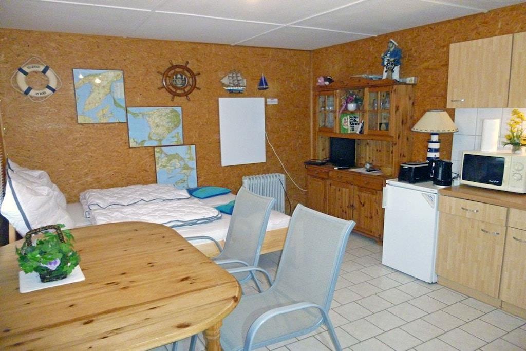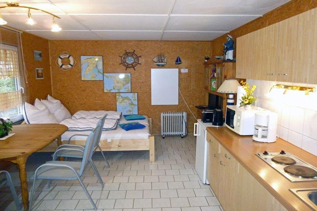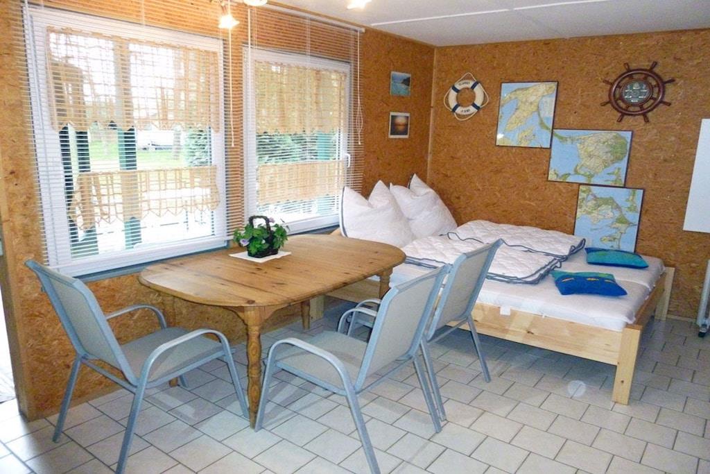 Altenkirchen auf dem Campingplatz Drewoldke, Bungalow Nr. 1, Parterre, sehr ruhige Lage, direkt am Ostseestrand, ca. 2 km zum Bodden Wohn- Essbereich mit einem Doppelbett, TV/ Sat, offene komplett ausgestattete Küchenzeile mit 2- Plattenherd, Mikrowelle mit Grill, Kühlschrank ohne Gefrierfach, diverse Elektrogeräte, separater Raum mit Kleiderschrank, Bad mit Dusche/ WC, Terrasse mit Gartenmöbeln, Grillmöglichkeit besteht “Zwischen Wald und Mee(h)r\" direkter Strandzugang, 50 m zur Ostsee (Sandstrand), Nutzung von Waschmaschine & Trockner nach Absprache und gegen Gebühr auf dem Campingplatz möglich, Gaststätten in unmittelbarer Nähe, ca. 2 km zum Einkaufmarkt, Bäcker mit kleinem Markt auf dem Campingplatz, PKW- Stellplatz am Objekt, Fahrradabstellmöglichkeit vorhanden, optimale Rad- und Wandermöglichkeiten, Haustiere nach Absprache (Gebühr Euro 5,- pro Haustier/ pro Tag)