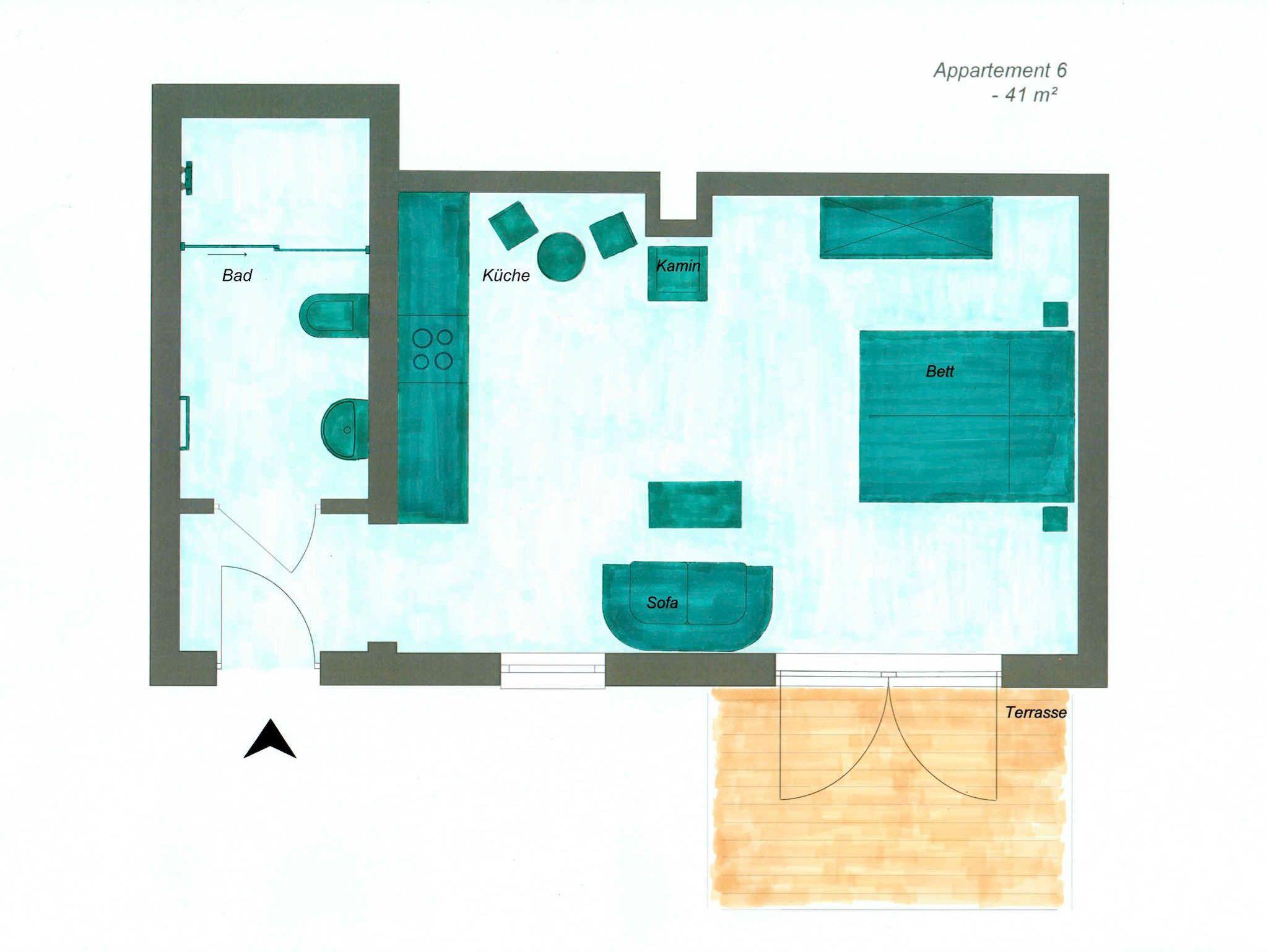 Das Appartement Nr. 6 mit ca. 40 m² hat die folgende Ausstattung: