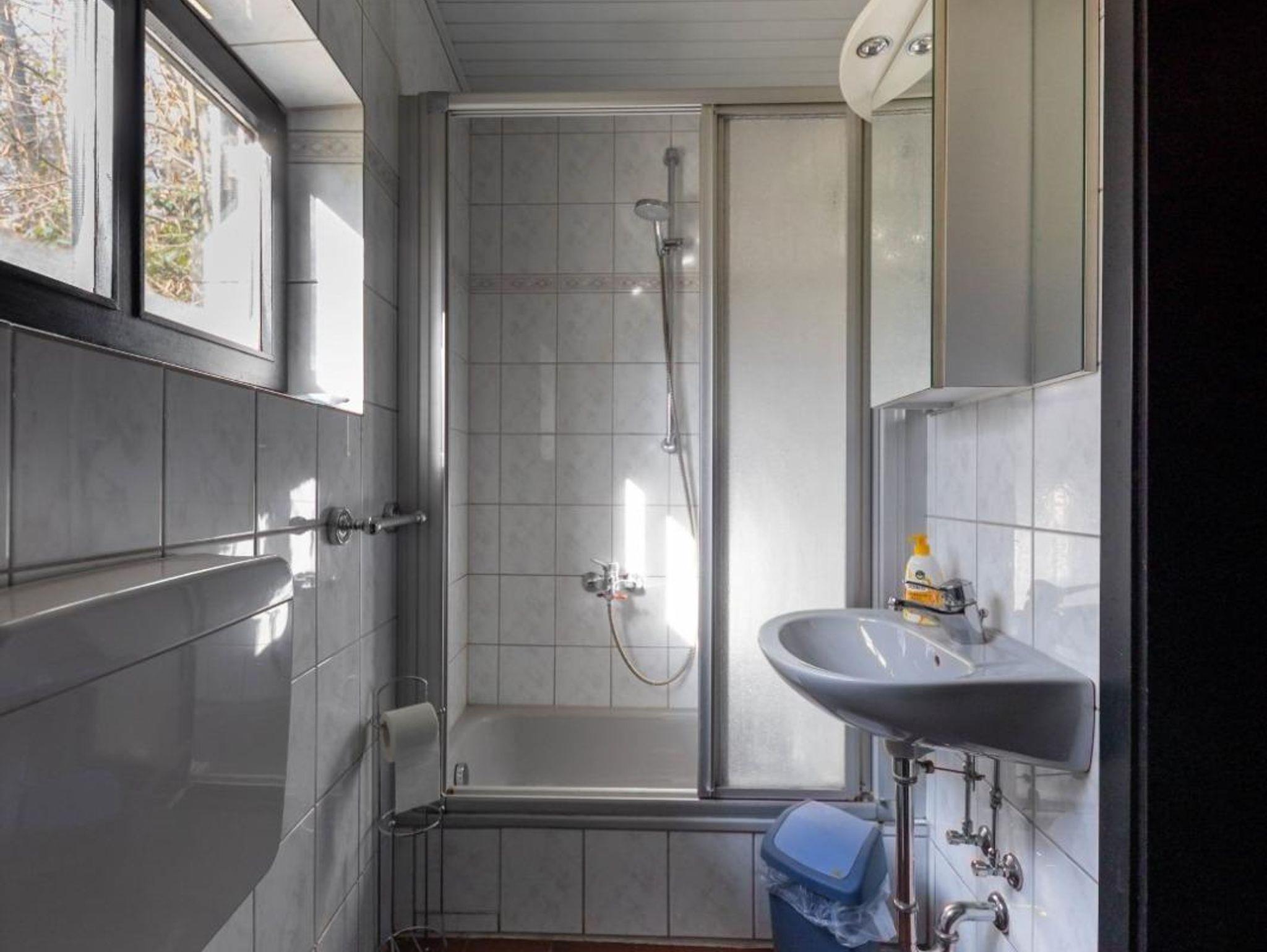 Im Erdgeschoss gibt es auch ein Schlafzimmer mit Etagenbetten und ein Badezimmer mit Toilette, Waschbecken, Dusche und Waschmaschine. Es gibt auch einen Staubsauger, Besen, Mop und Eimer für den Fall eines Unfalls.