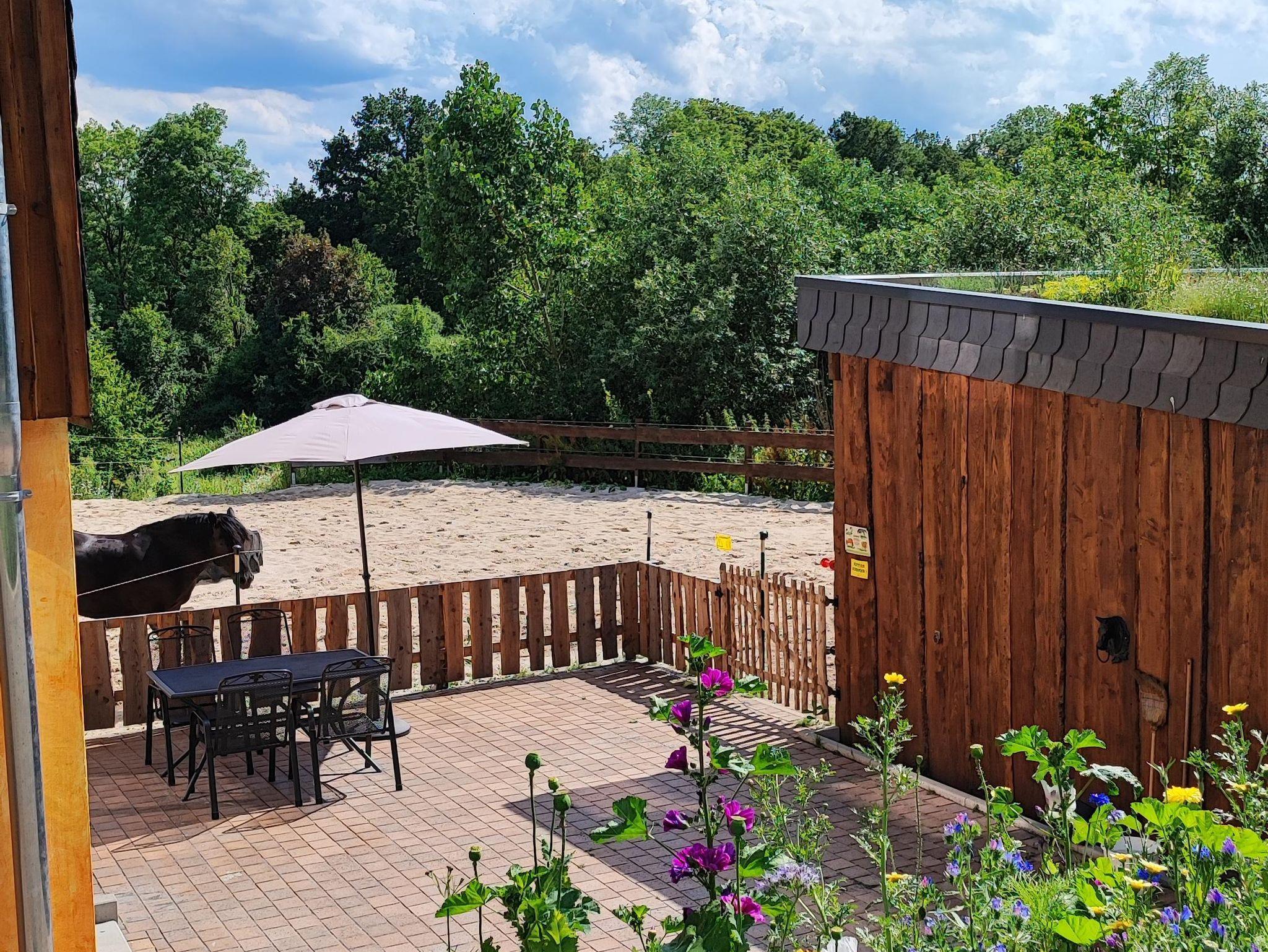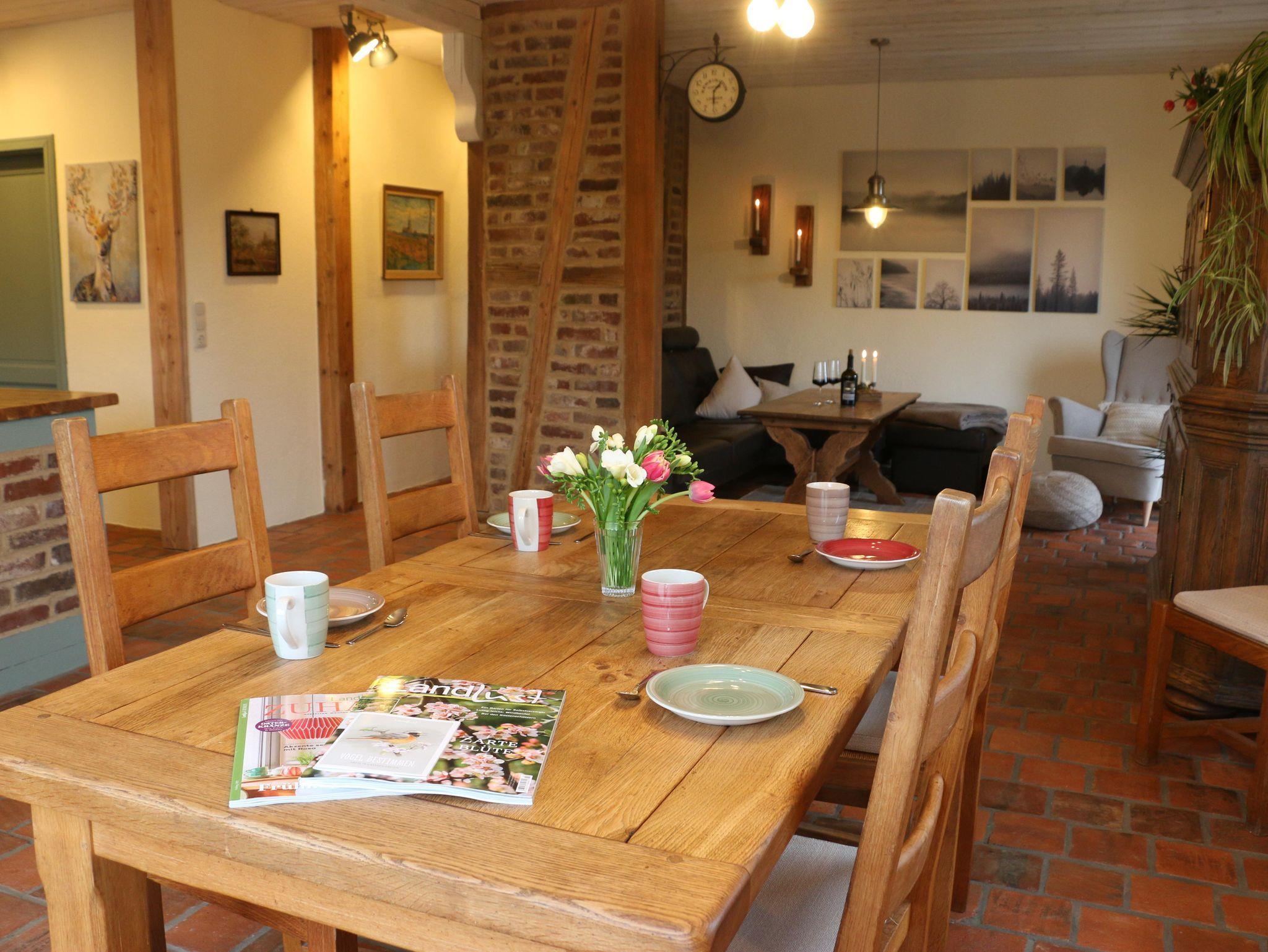 An den Küchenbereich offen angrenzend befindet sich der Essbereich. Hier können Sie auf den 6 Stühlen an dem großen, massiven Eichentisch Platz nehmen, um gemeinsam zu essen, zu spielen oder sich einfach nur zu unterhalten. Der Esstisch ist bei Bedarf auf ca. 3 m ausziehbar. Vom Essbereich aus haben Sie durch die bodentiefen Fenster einen wunderbaren Blick auf die angrenzenden Wiesen und Wälder sowie den Offenstall und das Paddock für die Pferde.
