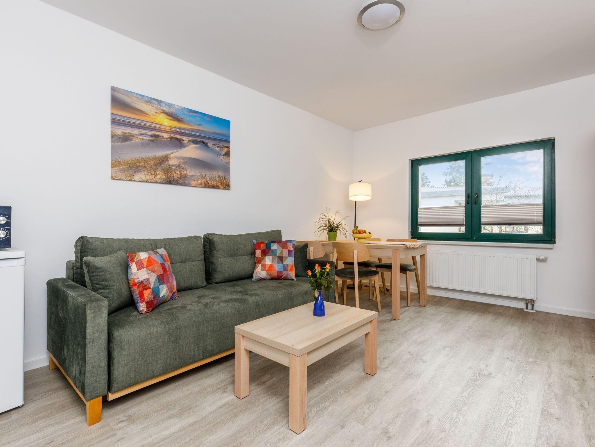Das Apartment verfügt über ein Schlafzimmer mit Doppelbett sowie einen Wohnbereich mit Schlafsofa und eignet sich ideal für Paare oder kleine Familien.