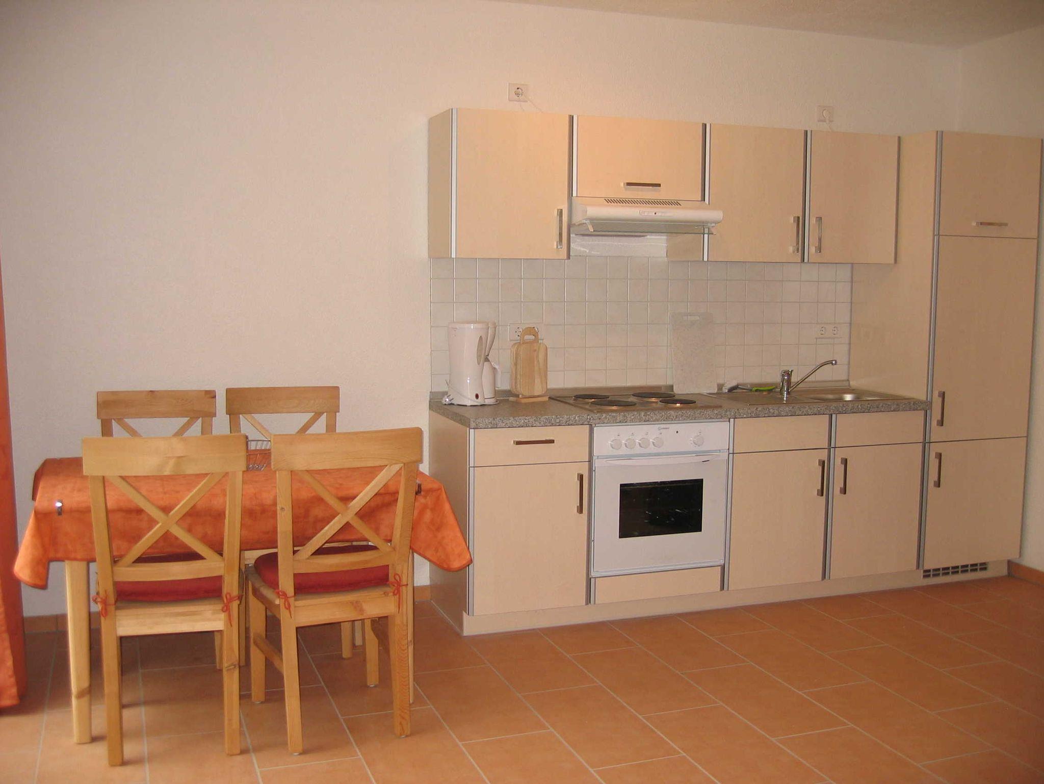 komplett ausgestattete Einbauküche mit 4-Plattenherd, Backofen, Wasserkocher, Toaster, Kaffeemaschine, div. Geschirr, Eßecke,