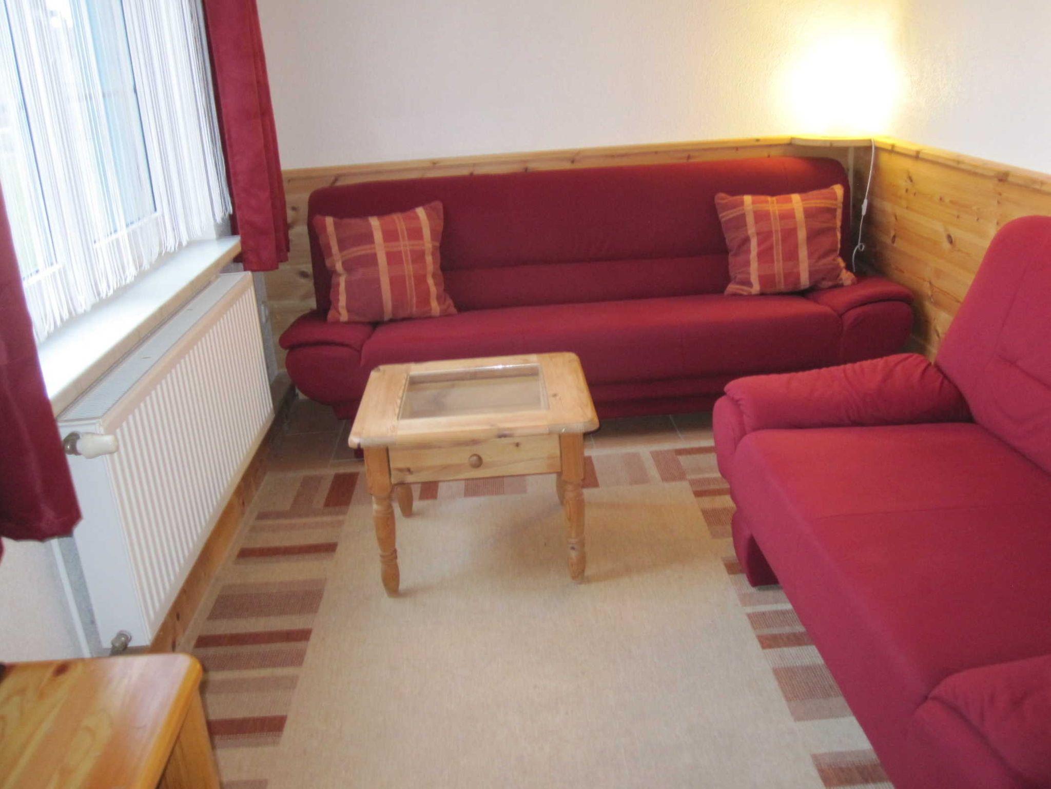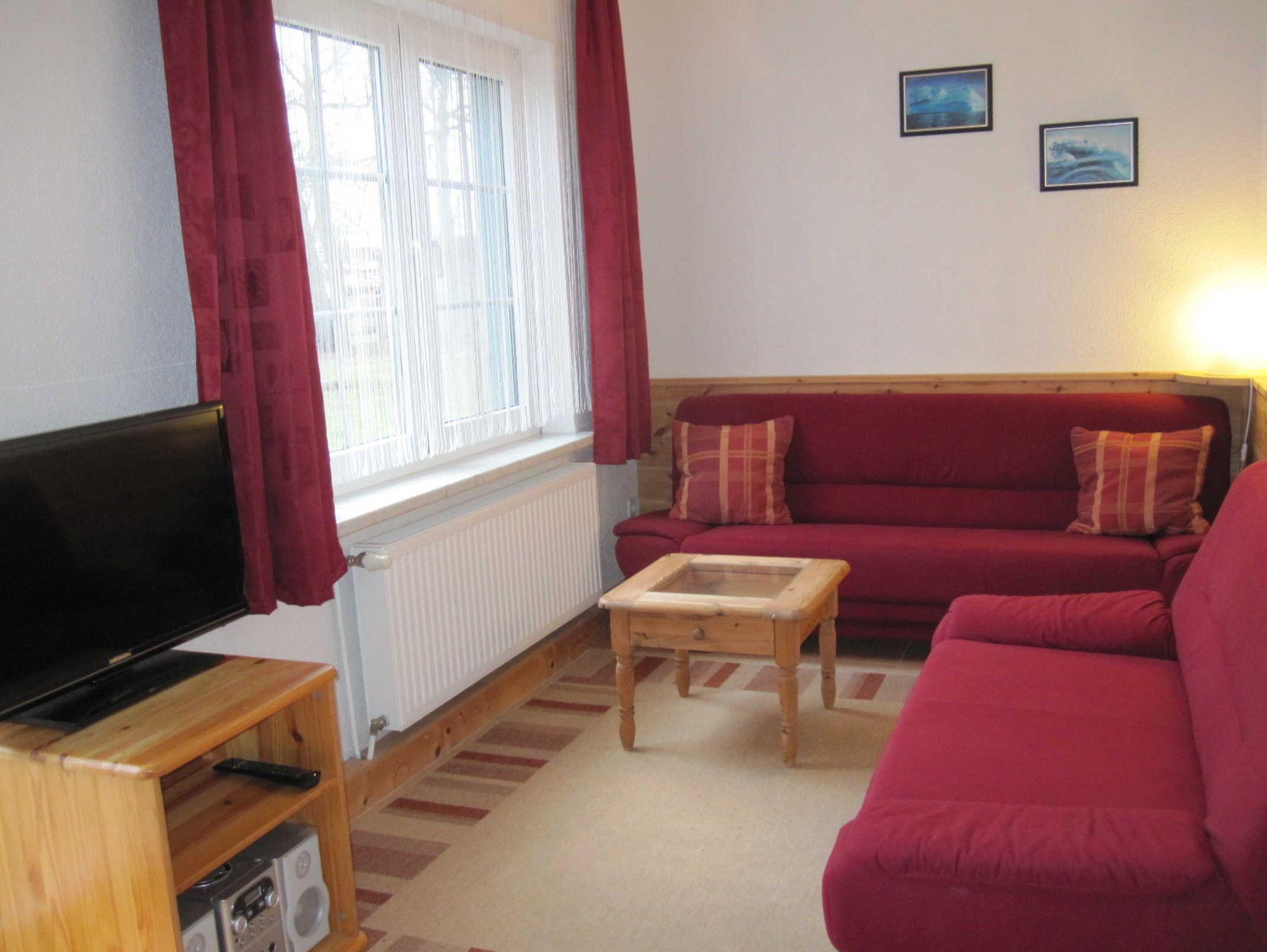 Wohnraum mit 3-Sitzer-Ausziehcouch, 2-Sitzer, SAT-TV, Radio, CD, große Fensterfront mit Ausgang zur Sonnenterasse mit Gartenmöbeln, Sonnenliege und Grill