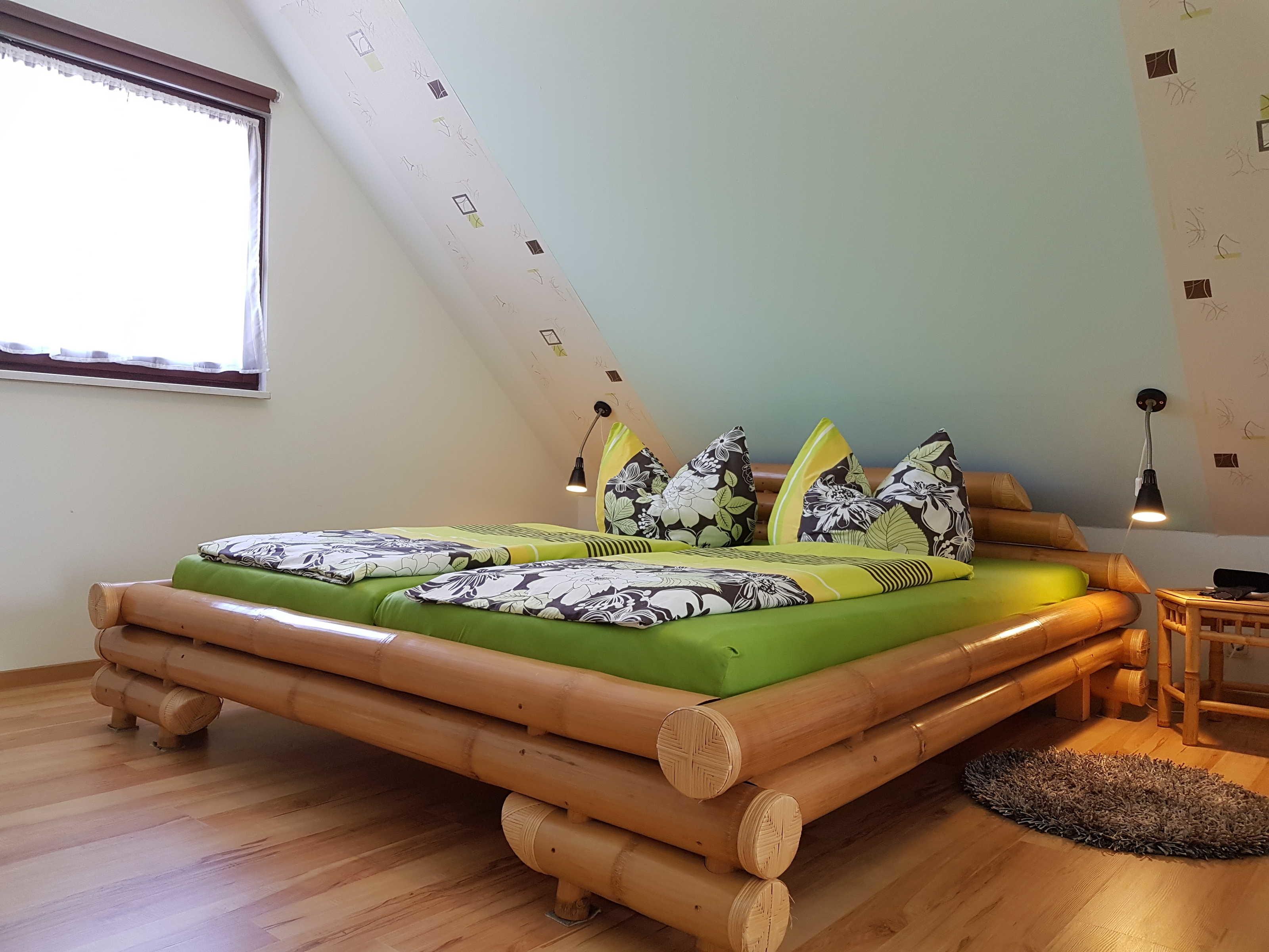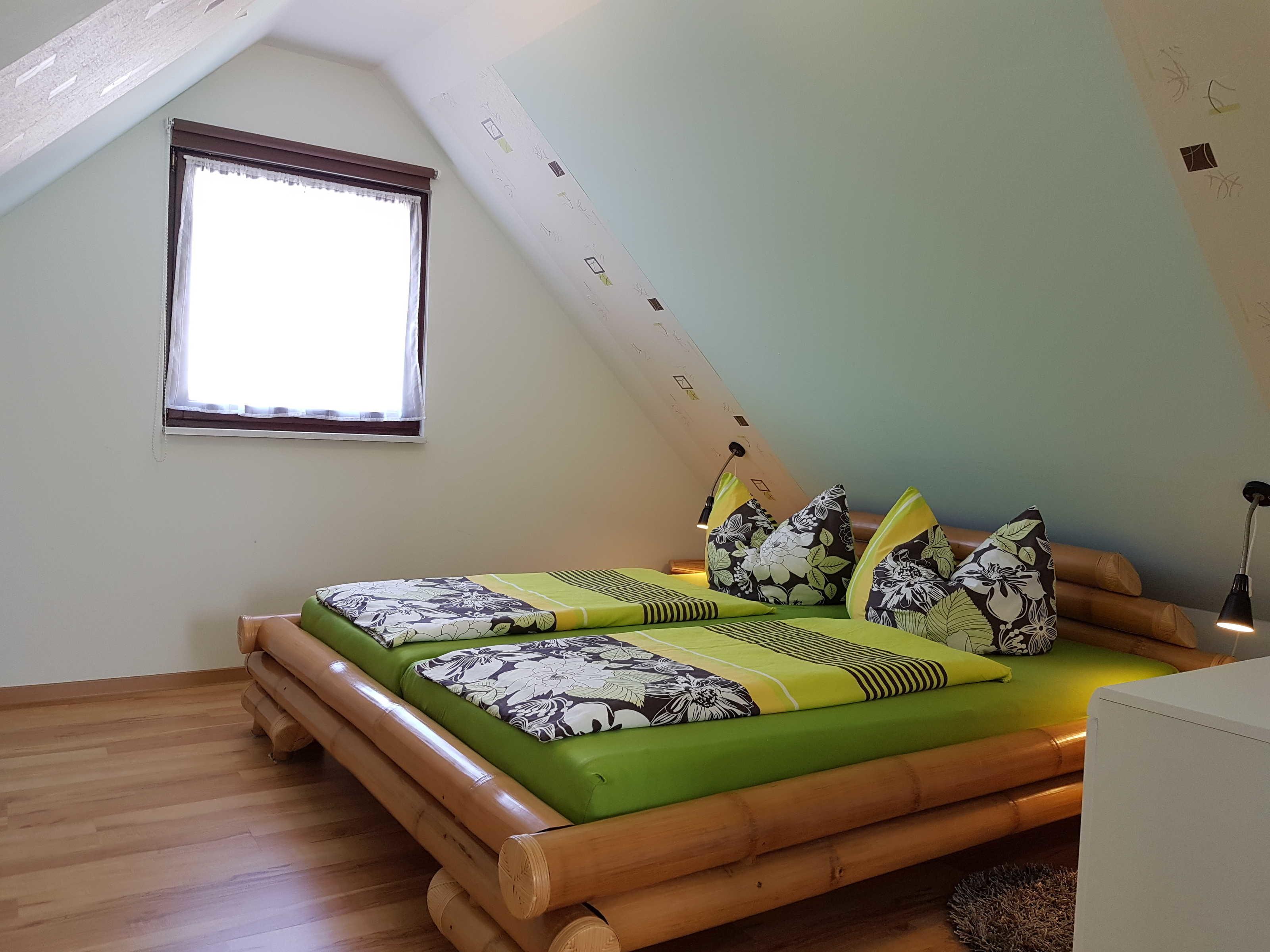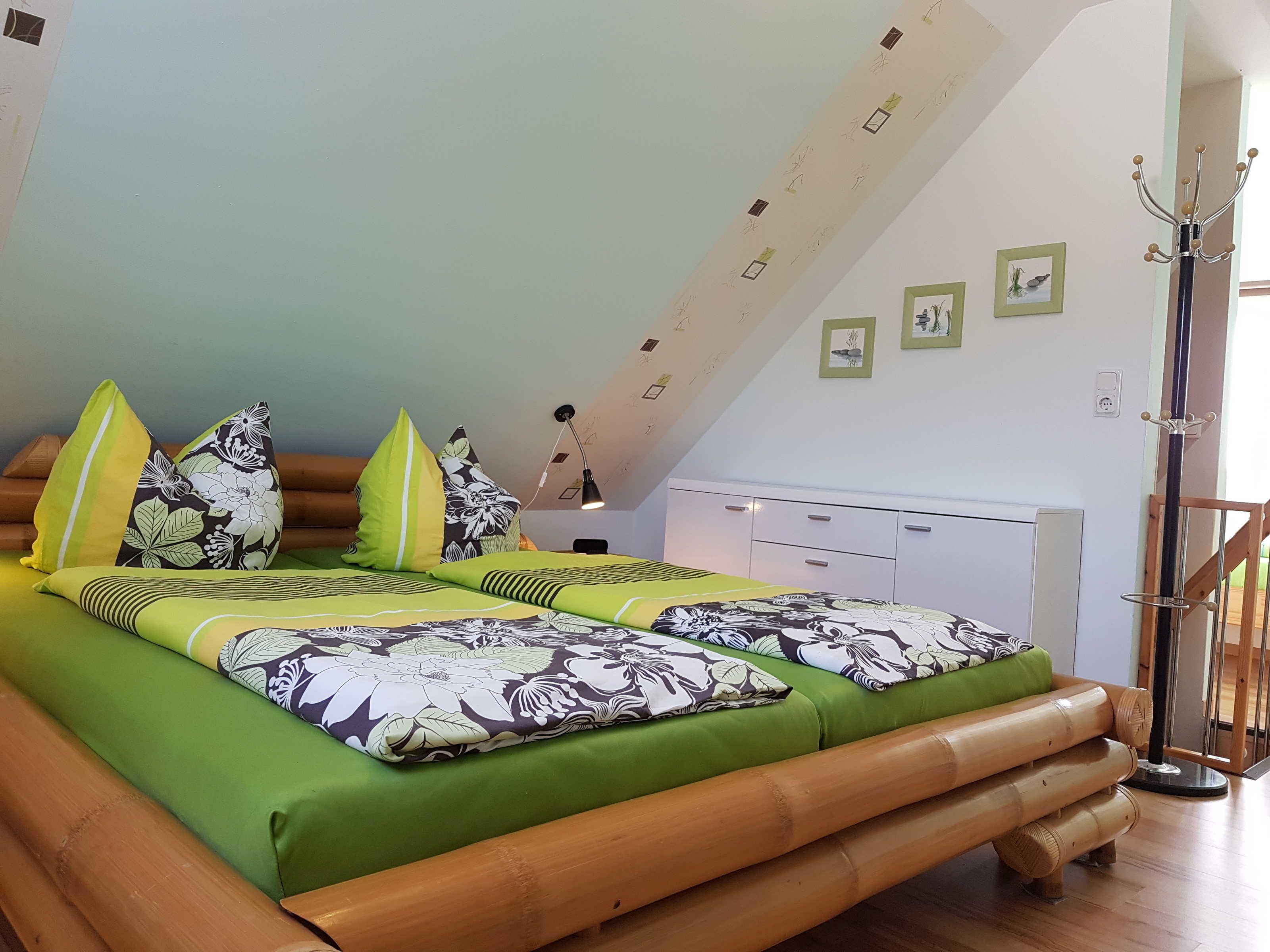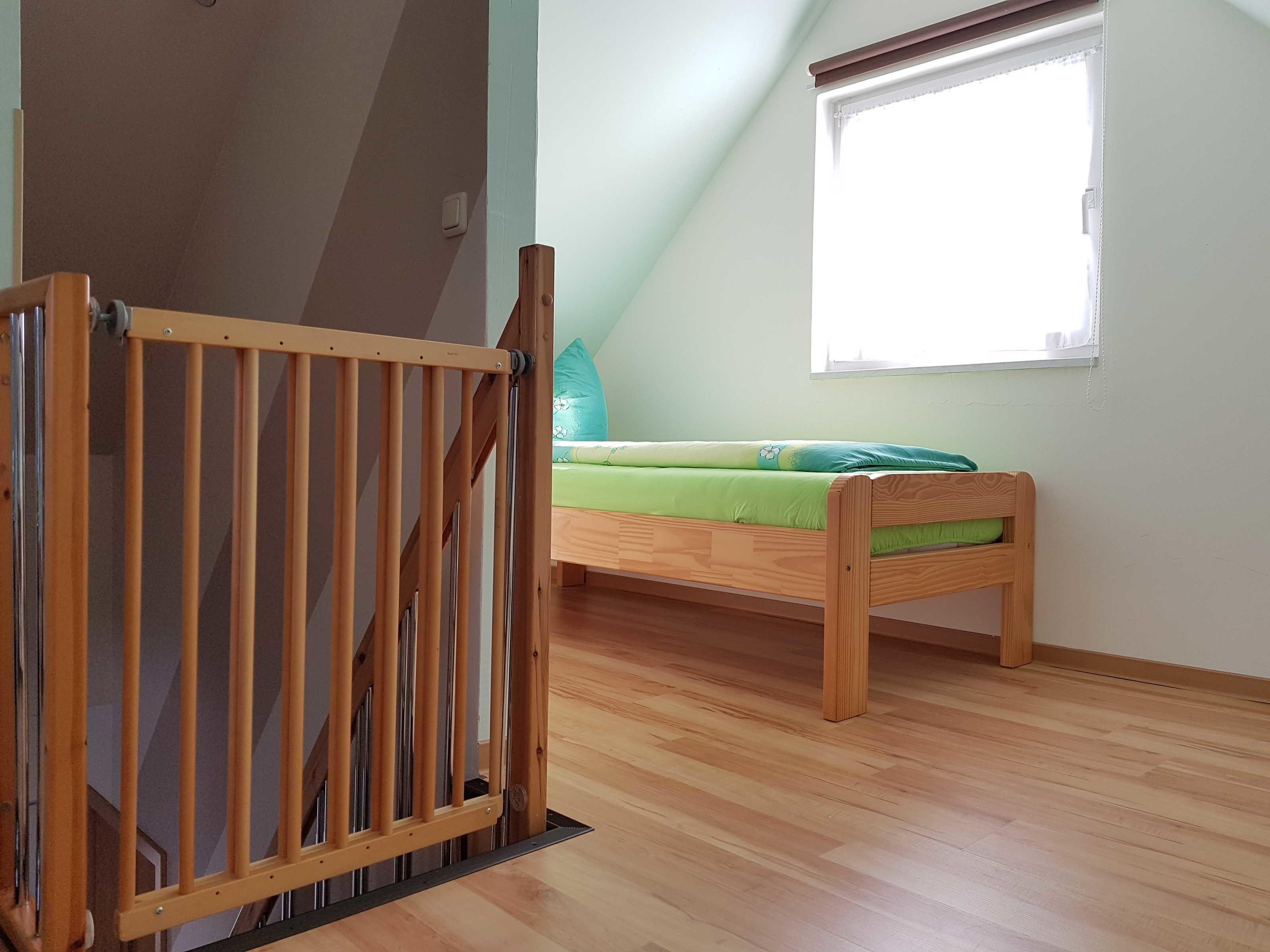 Über eine Treppe (steil) im Eingangsbereich gelangen Sie ins SCHLAFZIMMER im Dachgeschoss. Das Schlafzimmer verfügt über ein Doppelbett (180x200 cm) und ein Einzelbett (90x200 cm). Neben Nachttischen zu jeder Seite gibt es auch Leselicht. Ihre Kleidung können Sie in zwei Kommoden verstauen. Babybett und Hochstuhl können kostenlos gestellt werden. Ein Treppengitter ist vorhanden.