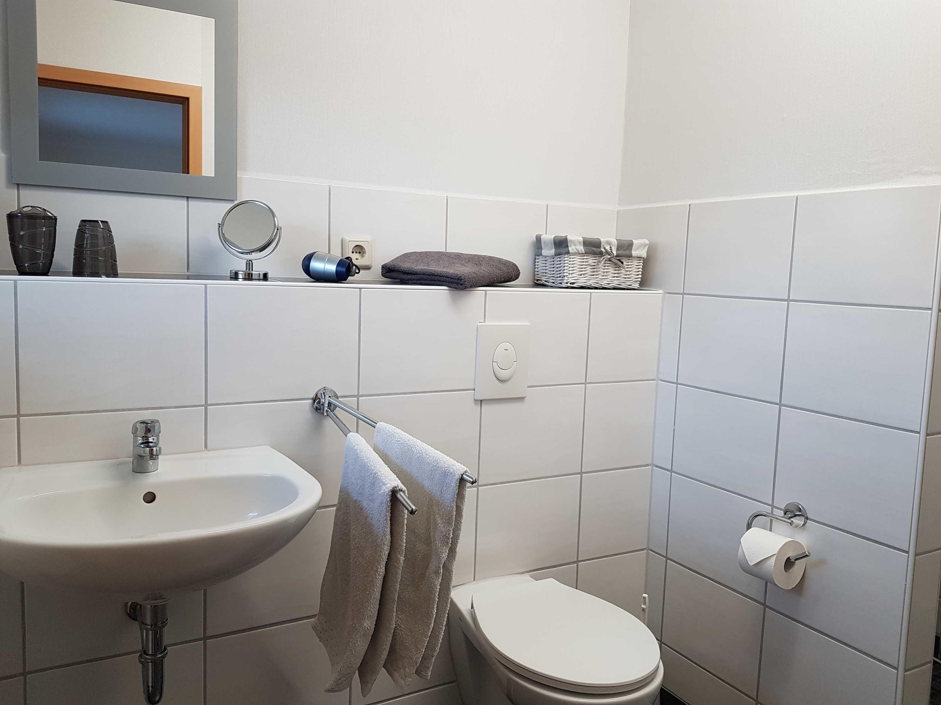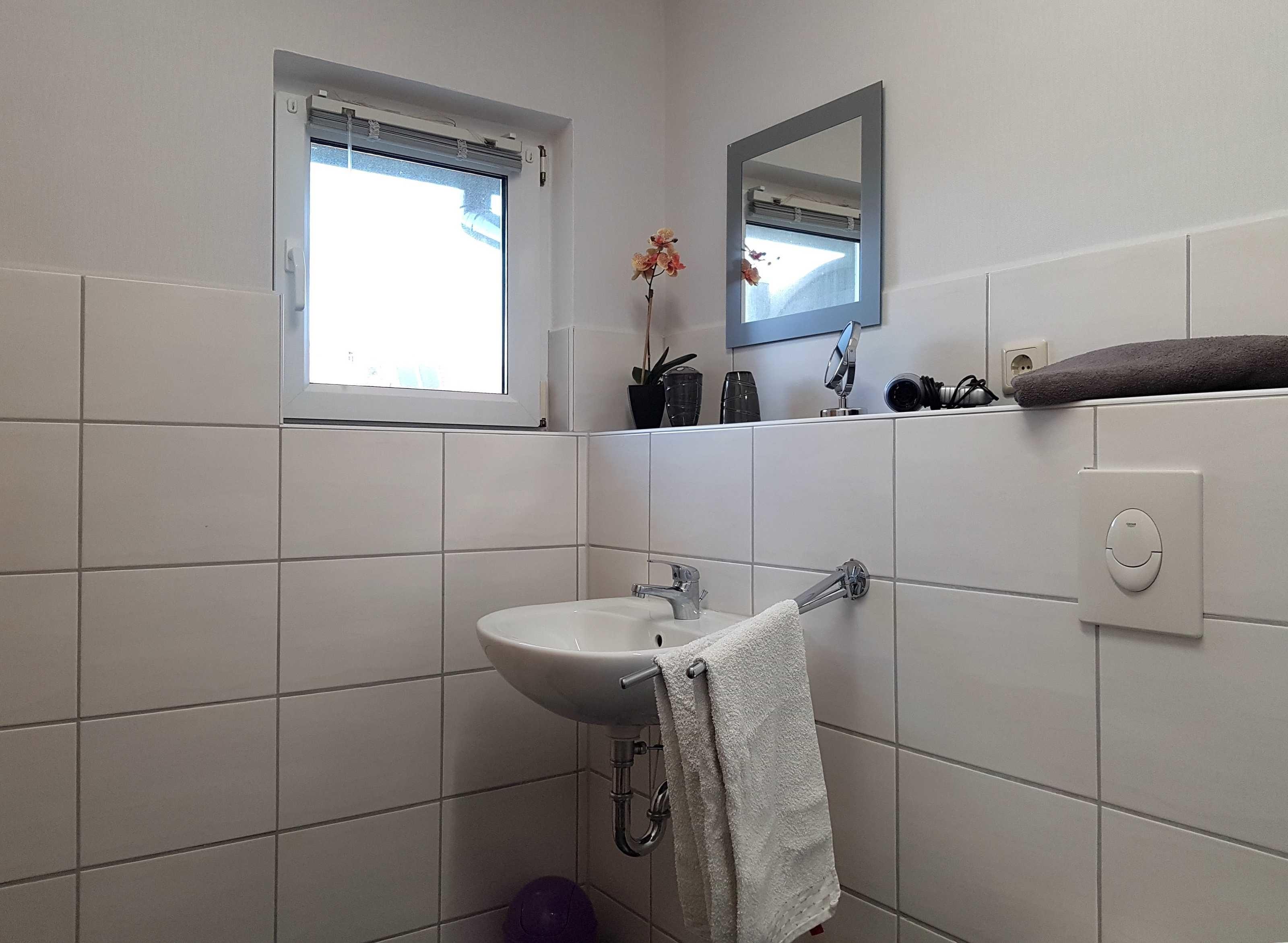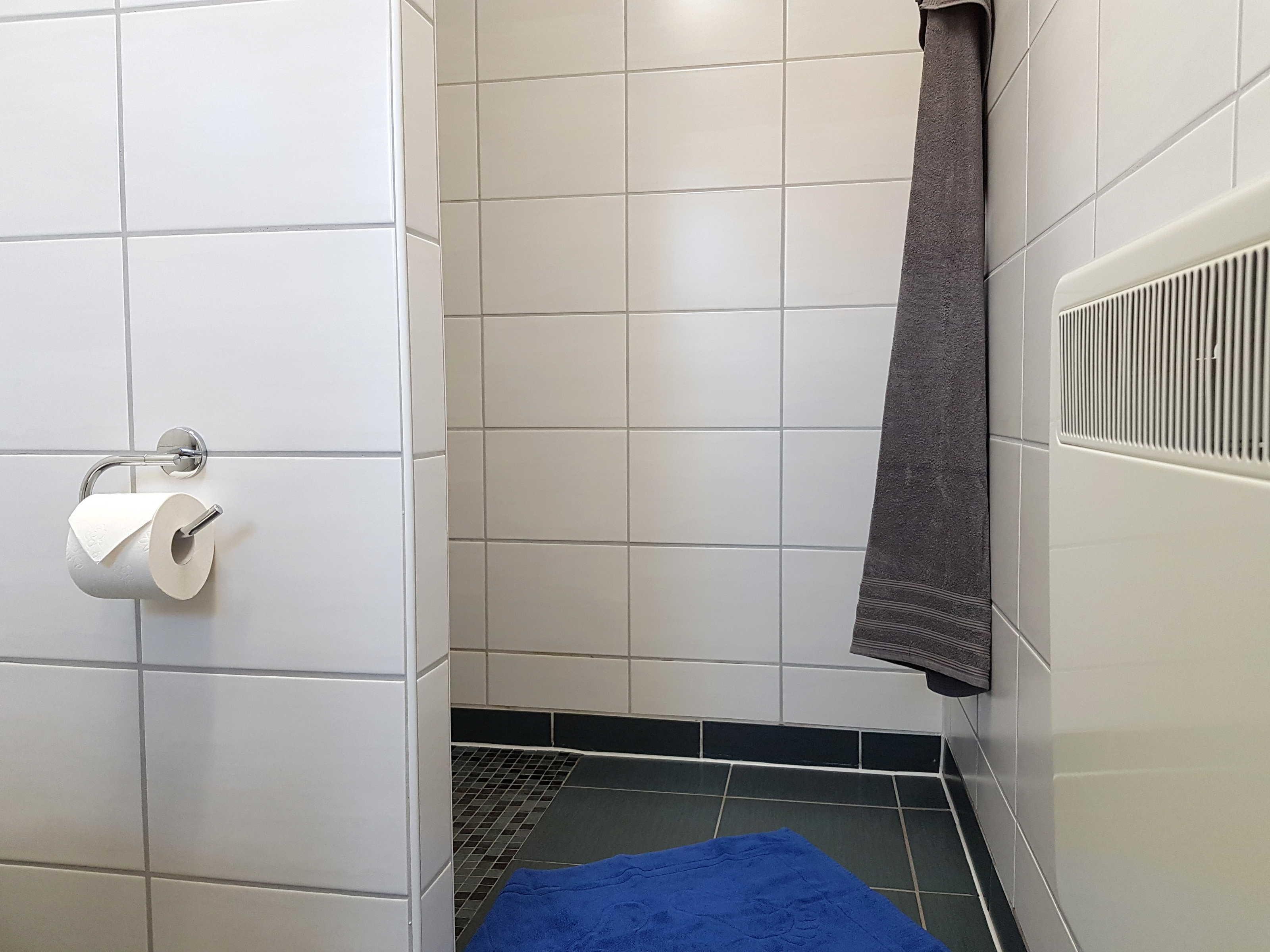 Im Erdgeschoss befindet sich außerdem das BADEZIMMER. Es verfügt über eine mit Mosaiksteinen geflieste und ebenerdige Dusche sowie Waschbecken, WC, Spiegel, Haartrockner und Ablagefläche.