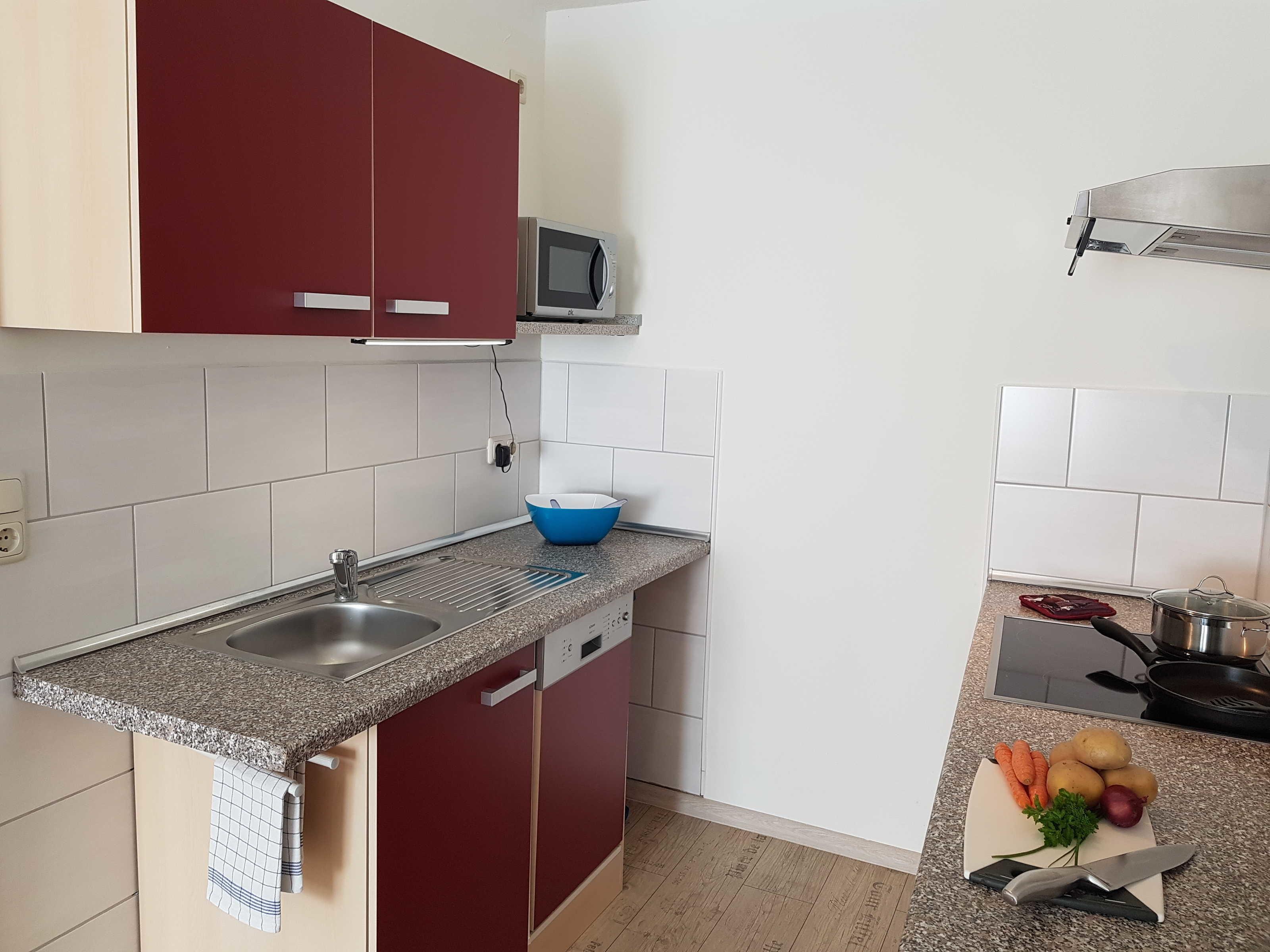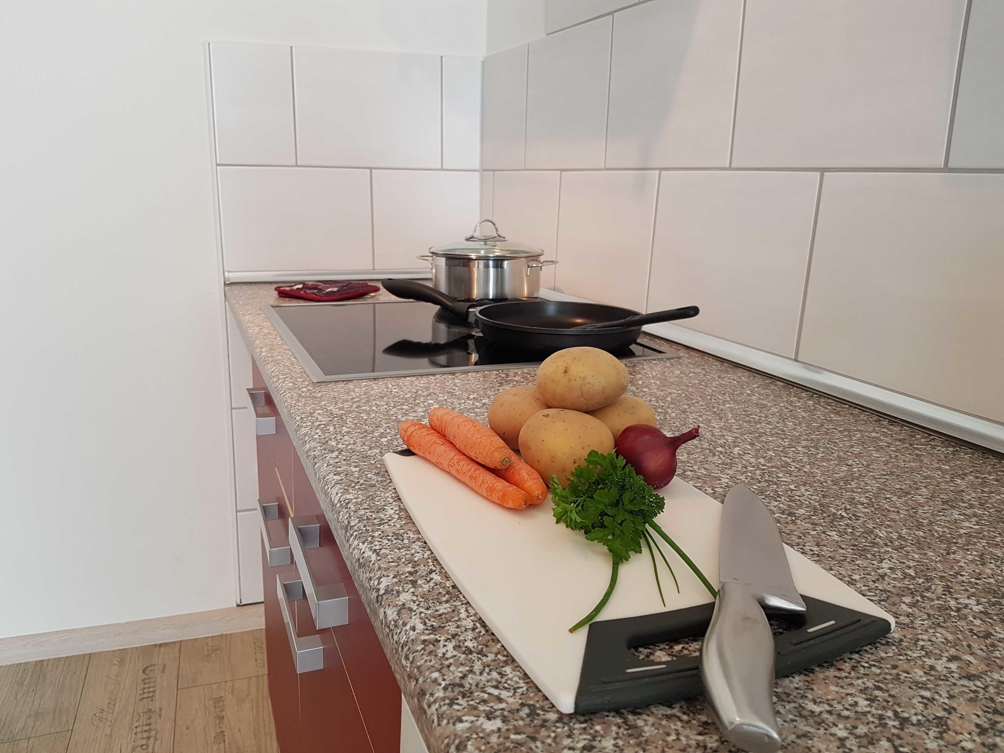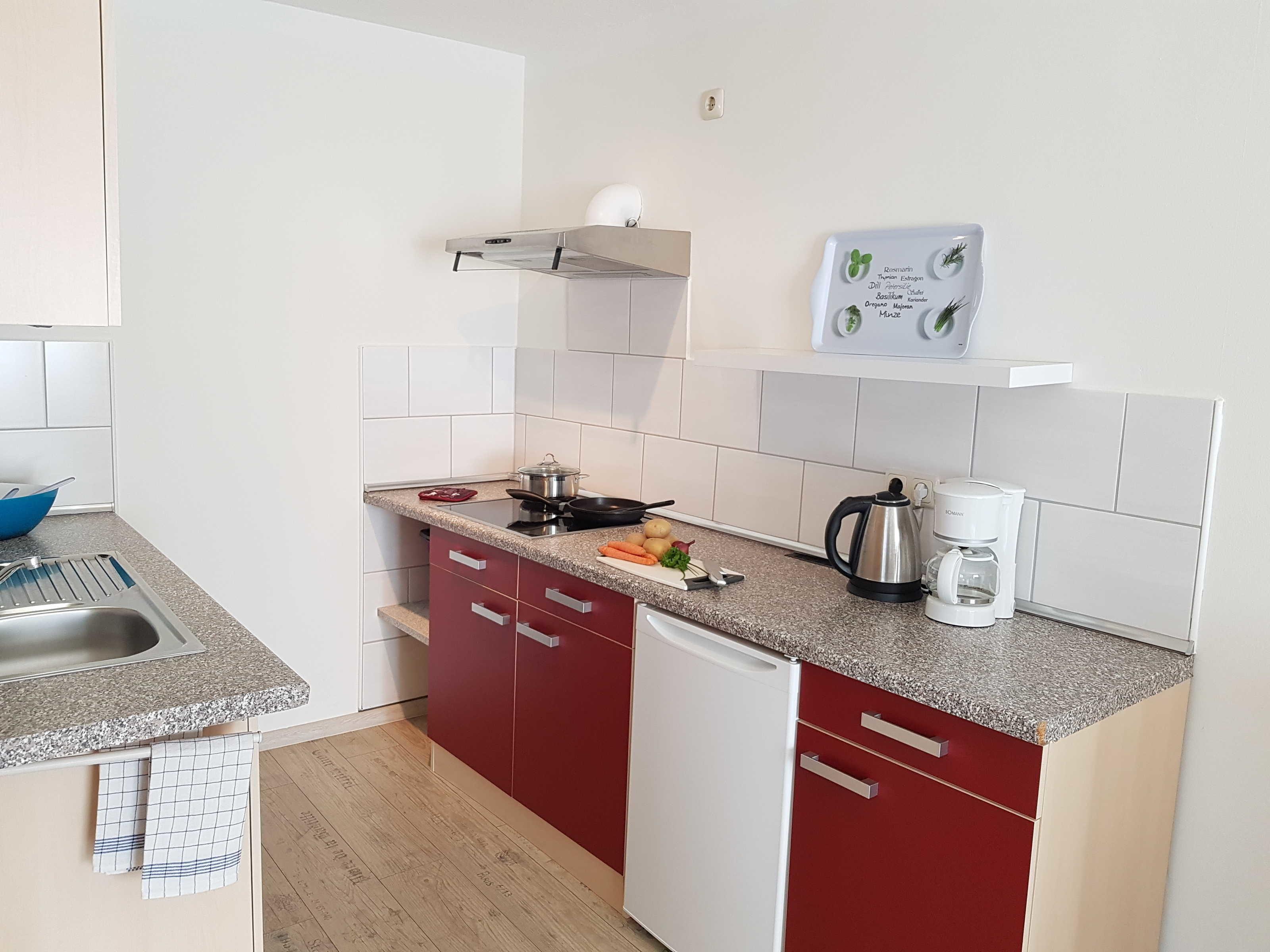 Die KÜCHE ist offen gehalten und schließt sich an den Wohn- und Essbereich an. Sie ist mit allem ausgestattet was eine Selbstverpflegung möglich macht. Neben technischen Geräten wie Kühlschrank mit Gefrierfach, Spülmaschine, 4er-Cerankochfeld, Mikrowelle, Dunstabzugshaube, Kaffeemaschine, Wasserkocher und Toaster gehören dazu viele weitere Kochutensilien. Neben der Küche, unter der Treppe, befindet sich ein Abstellraum. Hier sind Sonnenschirm, Sitzauflagen und Reinigungsutensilien untergebracht.