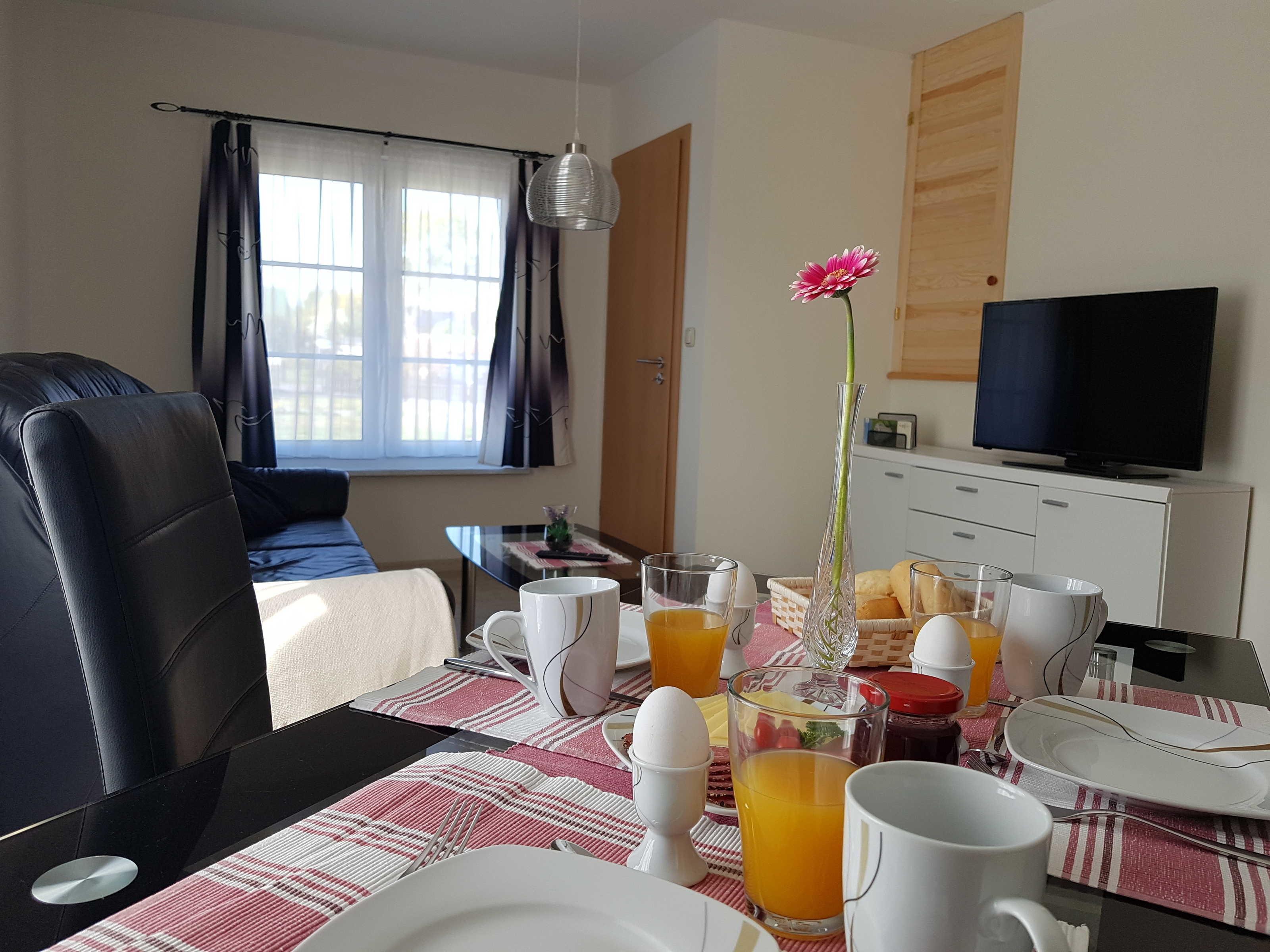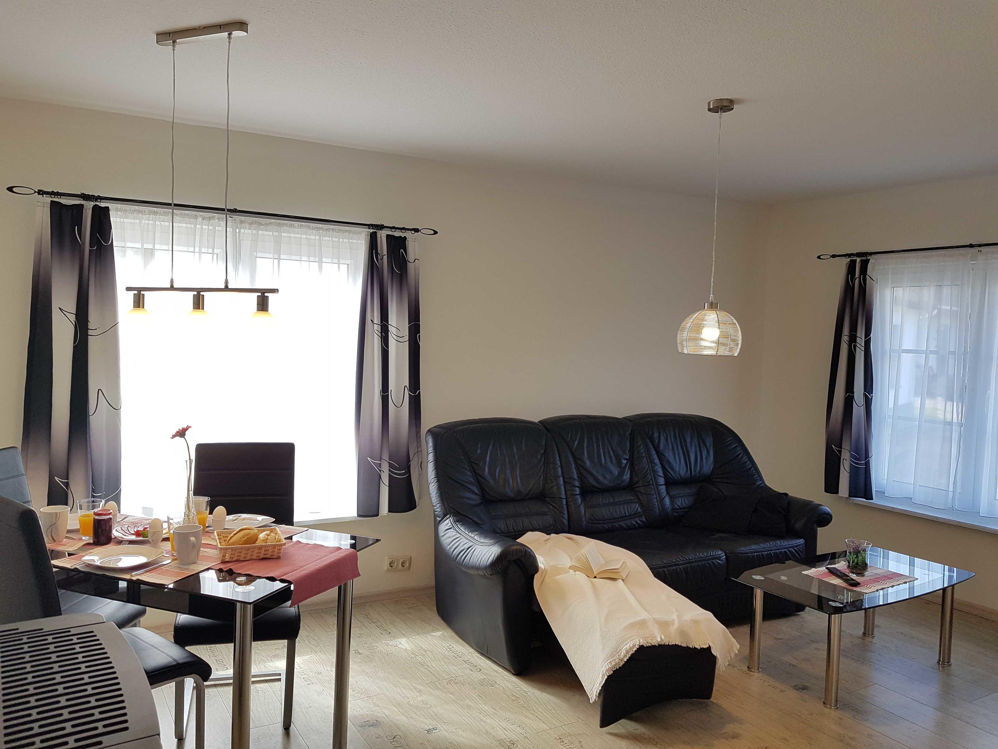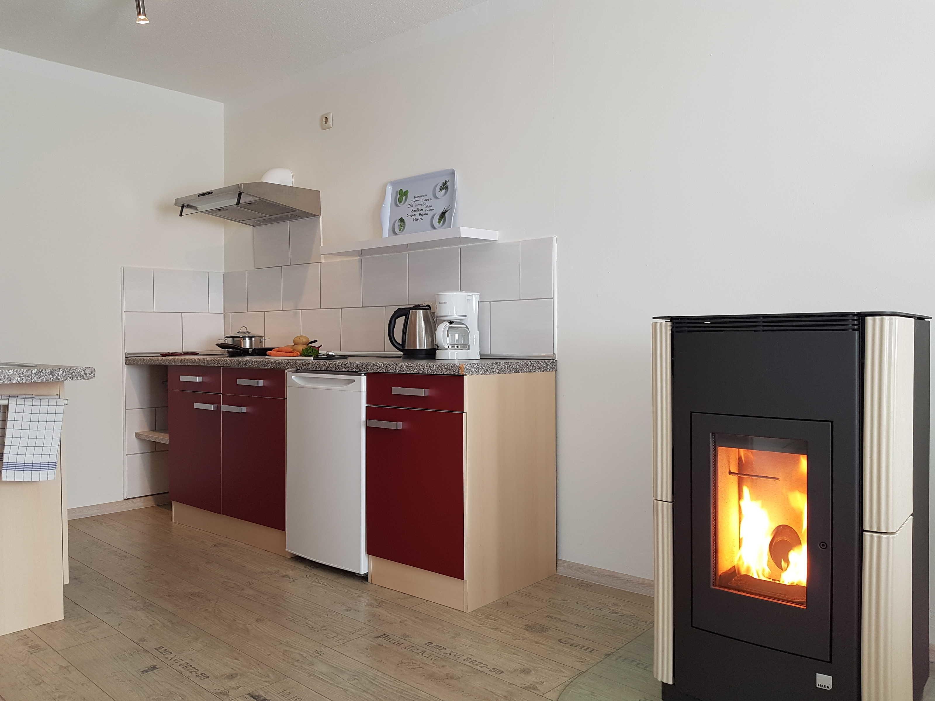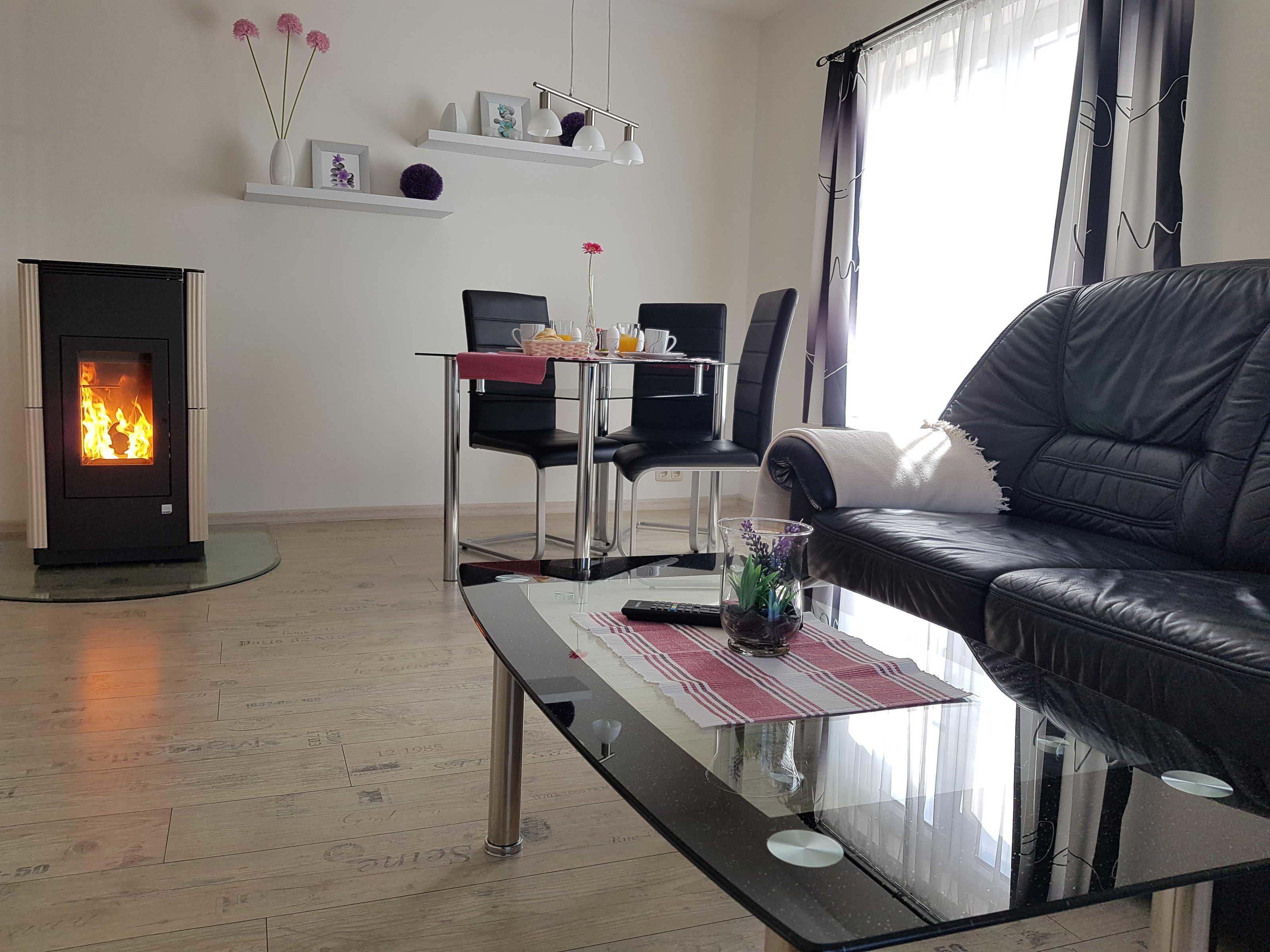 Der WOHNBEREICH ist mit einem 3er-Ledersofa und einem Beistelltisch ausgestattet. Ein Fußteil des Sofas lässt sich ausziehen. Ein Pellett-Kamin (September bis Mai) sorgt für angenehme Wärme. Für Unterhaltung sorgen ein Flachbild-TV mit Radio sowie Spiele und Bücher. WLAN ist kostenlos nutzbar.Der ESSBEREICH mit Esstisch drei Stühlen befindet sich vor dem Fenster durch das viel Licht eindringt und Sie einen schönen Blick auf Terrasse und Garten haben.