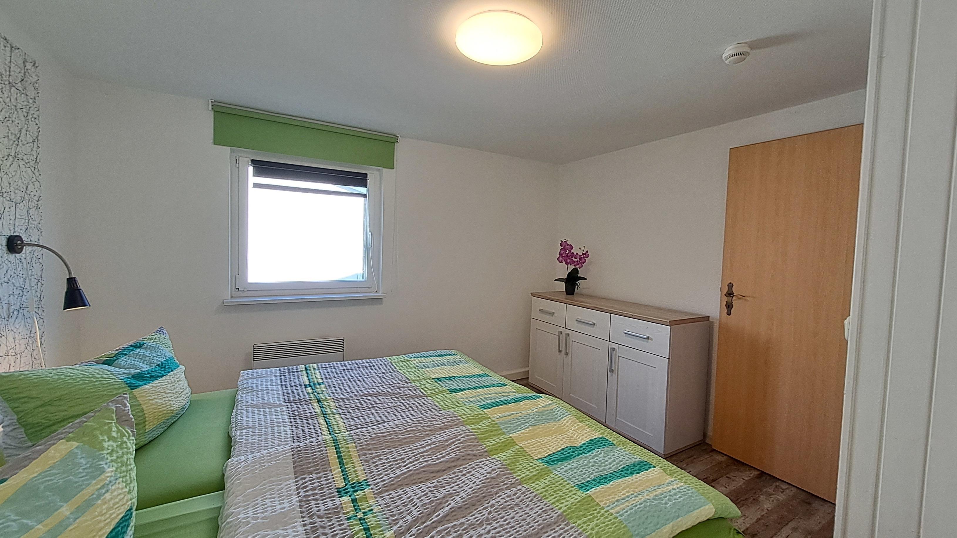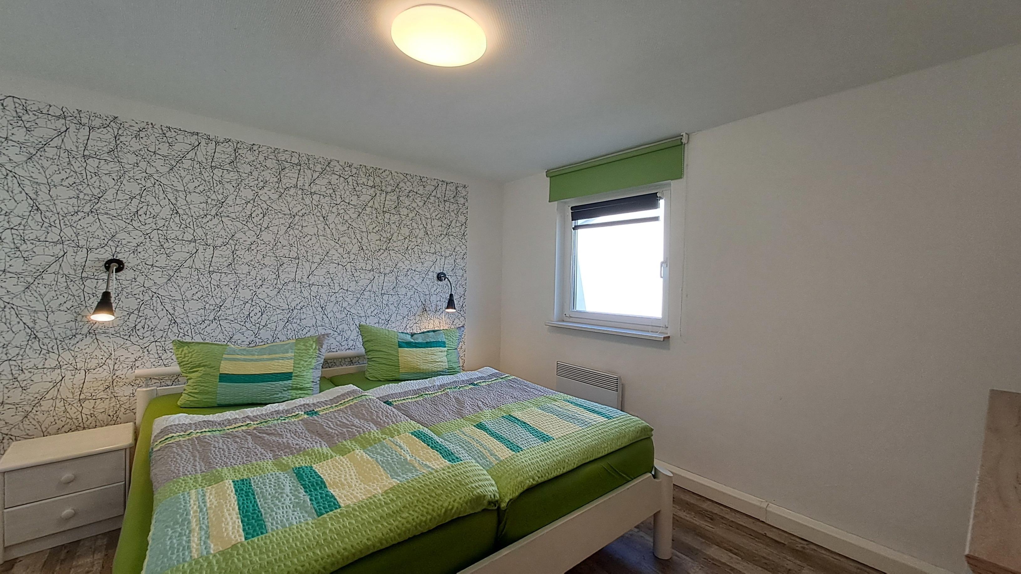 - Eines mit Doppelbett (180x200 cm), Nachttischen zu jeder Seite, Leselampen und einer Kommode