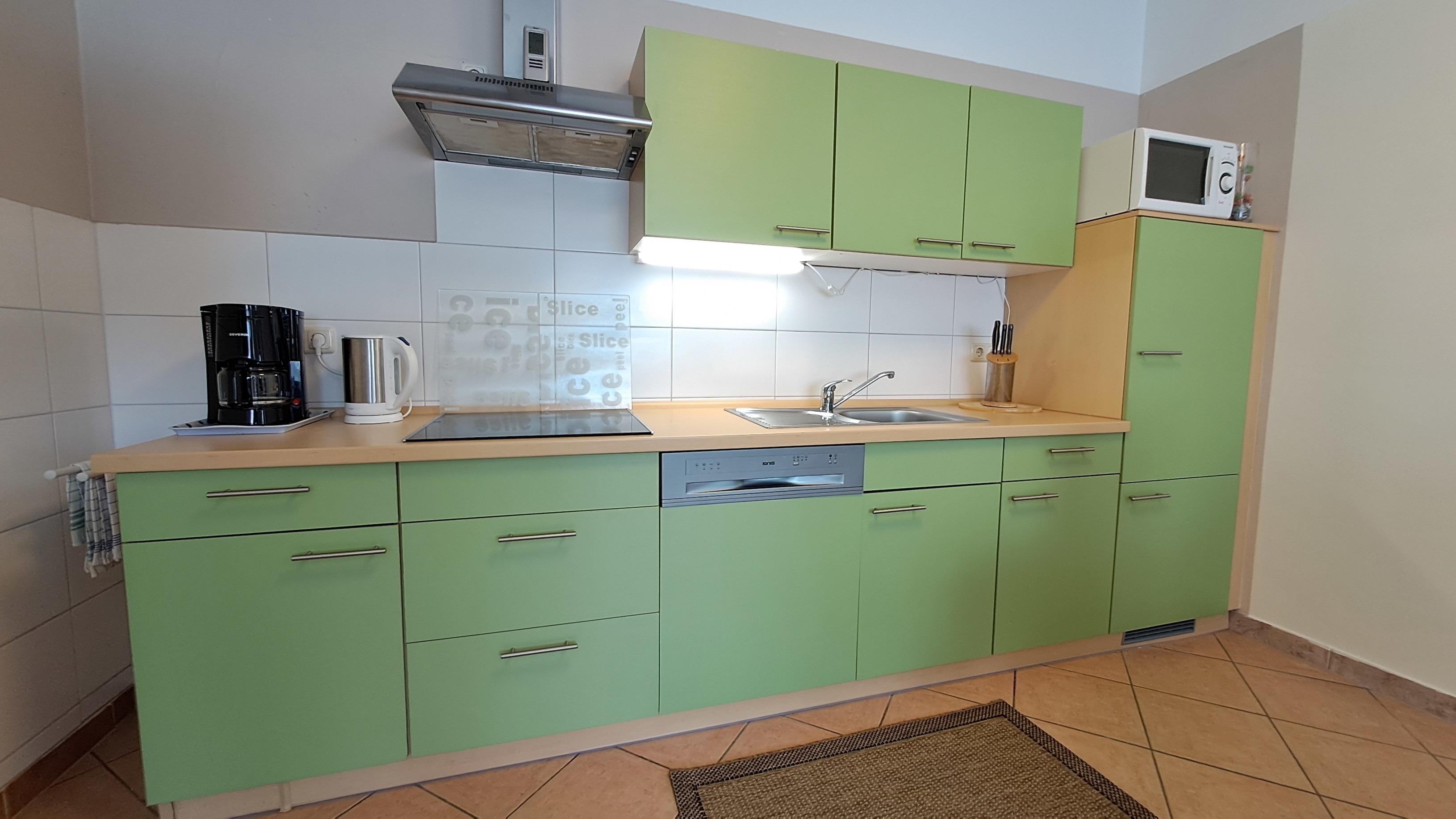 - Kühlschrank mit Gefrierfach, Spülmaschine, Mikrowelle, 4er-Cerankochfeld, Dunstabzugshaube, Kaffeemaschine, Wasserkocher und Toaster