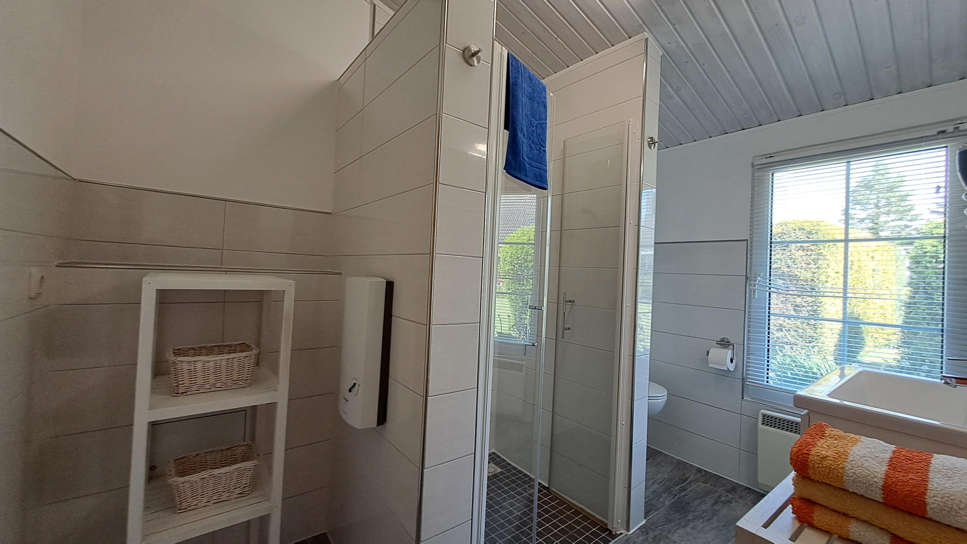 - Ebenerdige Dusche sowie Waschbecken, WC, Spiegel, Haartrockner und 2 Regalen